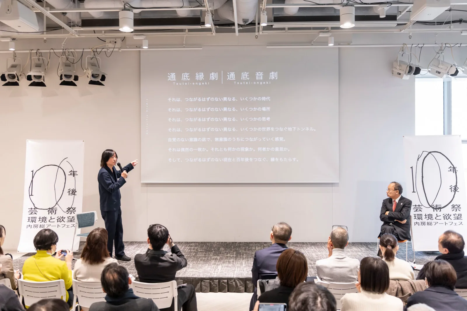 3⽉23⽇からのアート作品展⽰に先⽴ち、「百年後芸術祭-内房総アートフェス-」の企画発表会が、POTLUCK YAESUにて2⽉9⽇に開催された。百年後芸術祭は市原市、⽊更津市、君津市、袖ケ浦市、富津市の内房総5市で、千葉県誕⽣150周年記念事業の⼀環として2023年9⽉より開催されている。