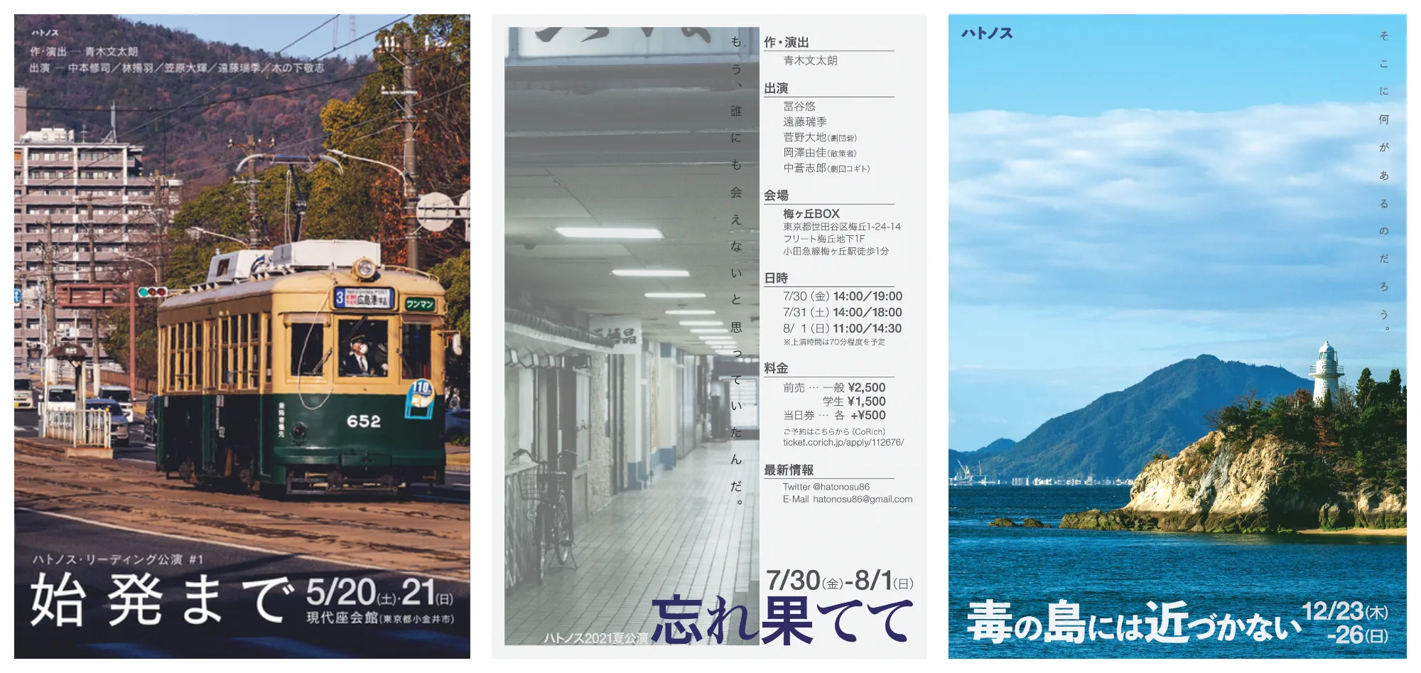 筆者と青木はじつは中学・高校の同級生であり、小さな演劇部にともに在籍していた。高校卒業後はしばらく疎遠となっていたが、筆者が東京芸大の在籍中に知り合ったライター・志賀玲太が「良かった」とソーシャルメディアに投稿(*9)していた演劇がハトノスの公演であり、そのクレジットに青木の名前を見つけて活動を知ることとなった。広島の旧い友人と東京で美術を通じて知り合った友人がつながることに不思議な縁を感じたものだ。