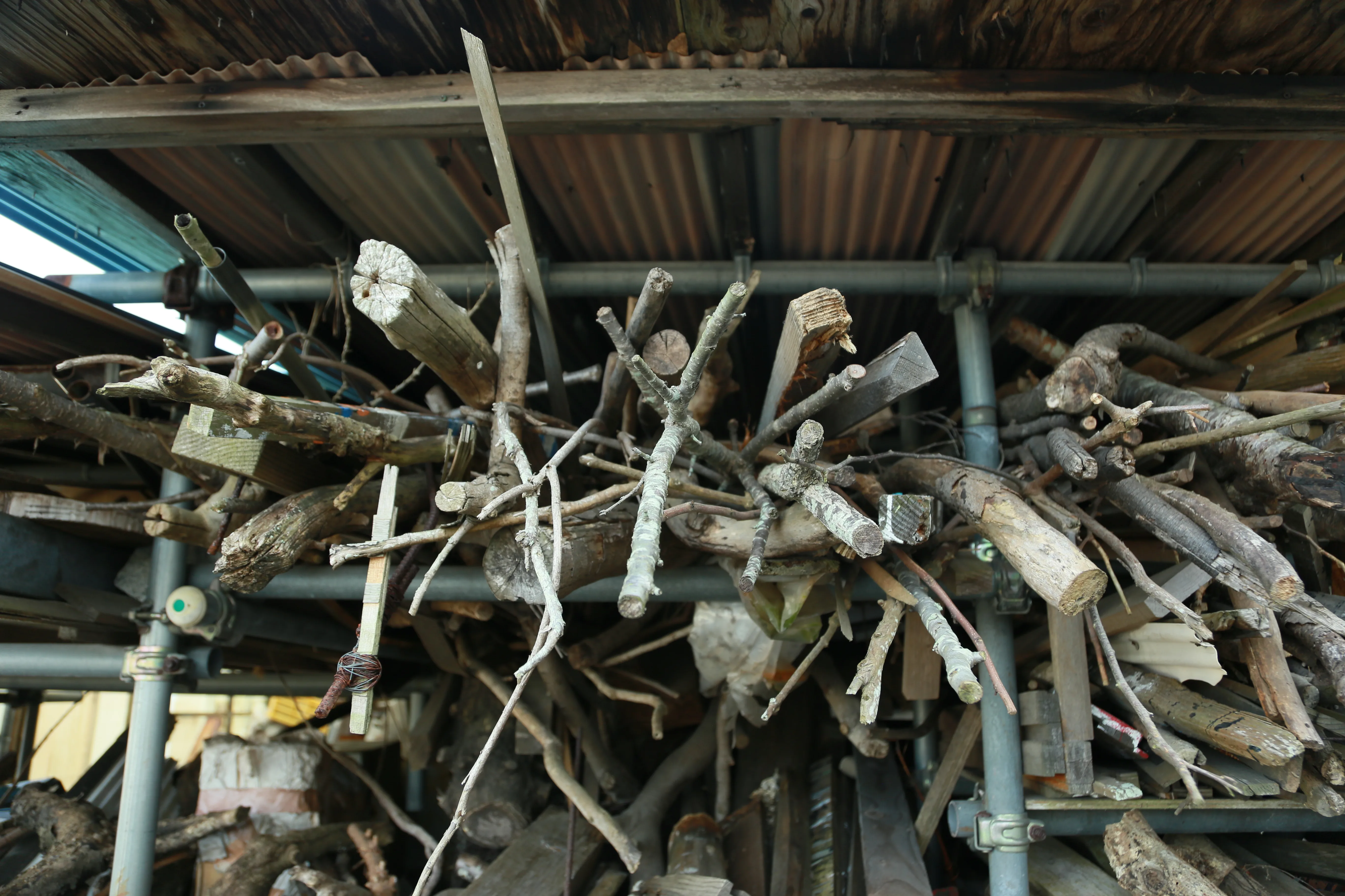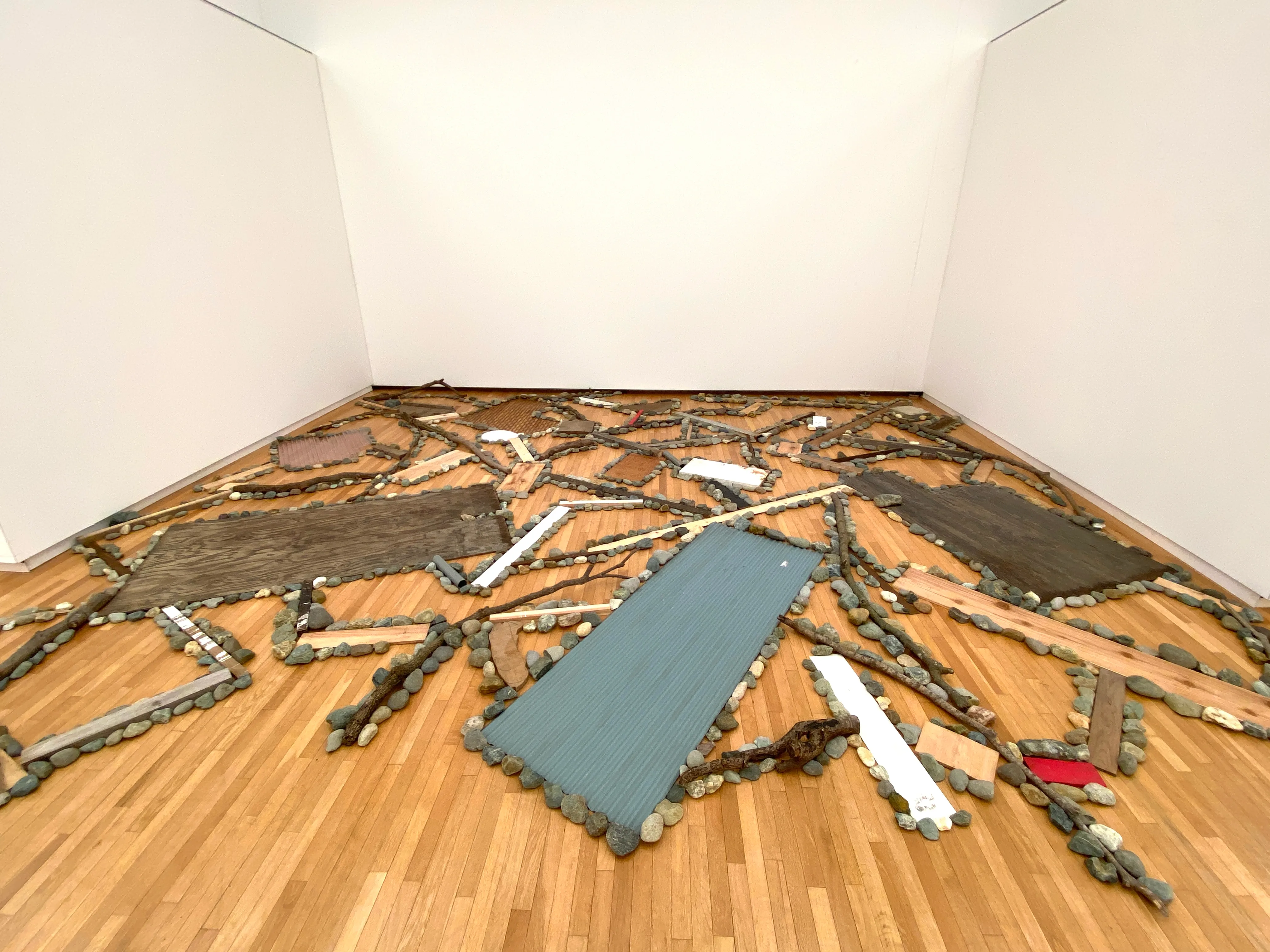 昔の作品といまの作品を見るのがわかりやすいんですけど、あまり素材にこだわらず、イメージを持たないようにして、真っ直ぐに“もの”を見る、ということがまず最初です。それが初期の頃は、自分の思考に合うように“もの”をとらえるというふうなことをやっていました。石ころひとつ、木の枝ひとつ。必要なのはその空間。たとえばひとつの空間があると、そこにいろんな“もの”がありますよね。それでいろんなものをどのようにひとつの空間のなかで位置付けていくかと。まあだいたい普通はバラバラにあるわけですよ、“もの”っていうのは。バラバラにある“もの”を、をいったいアートとしてどういうふうにするのかという問題が僕はいつもあるんですね。