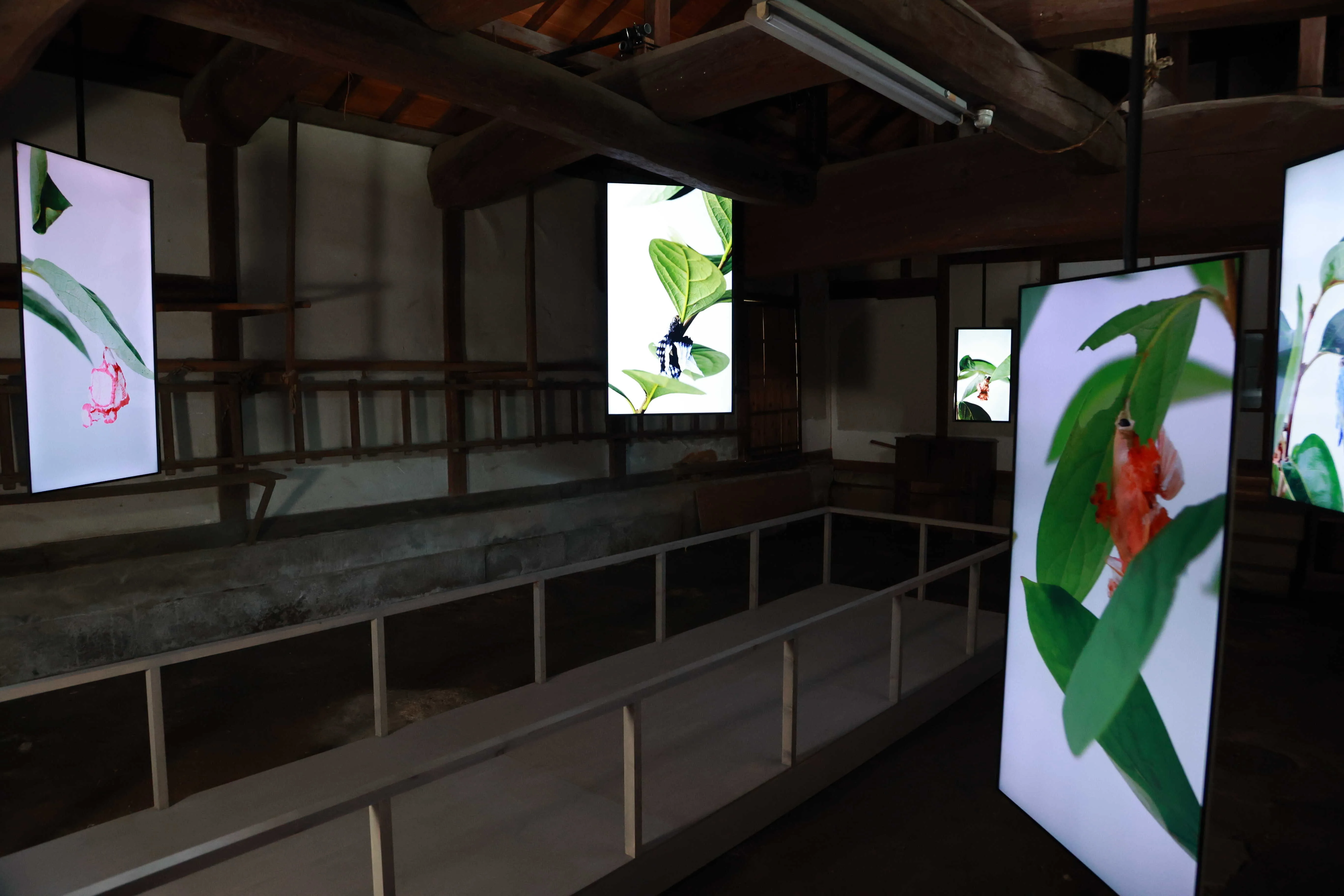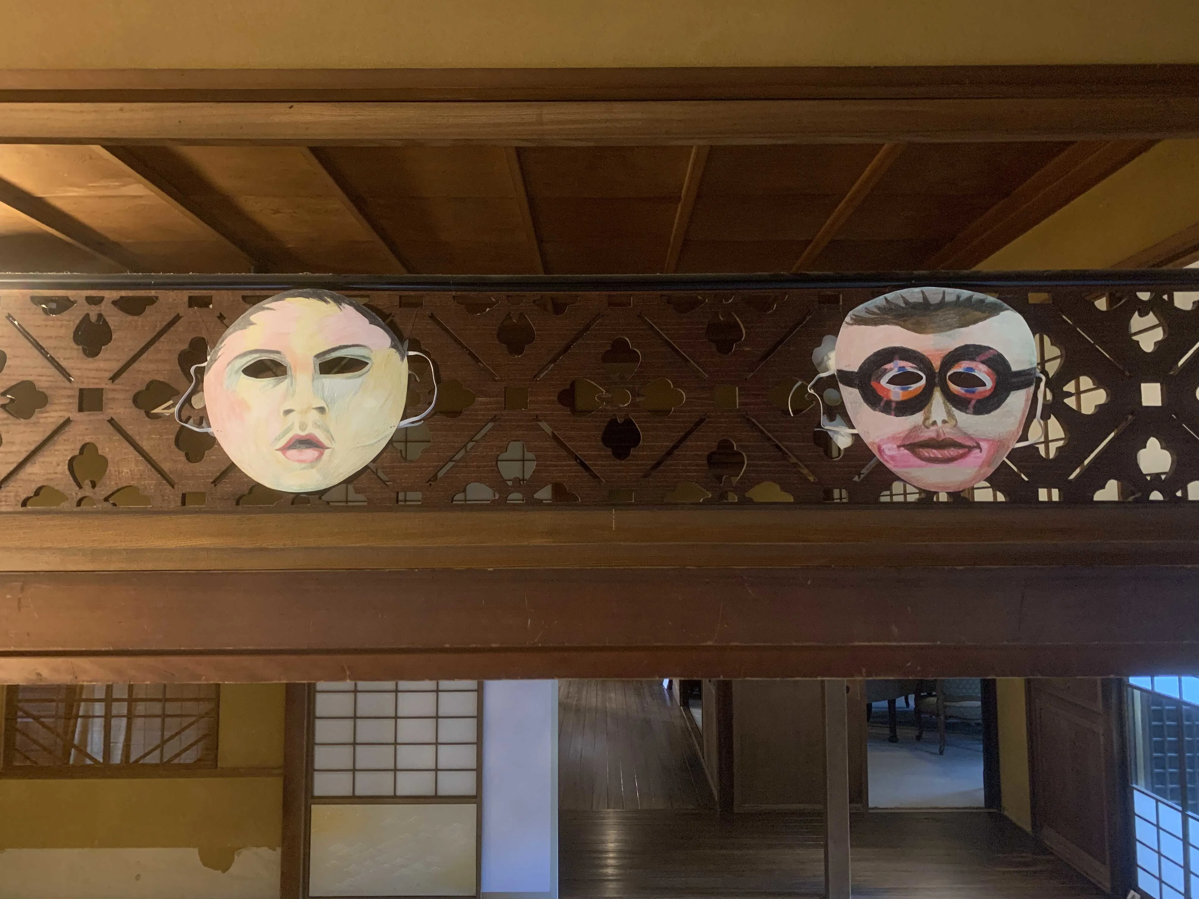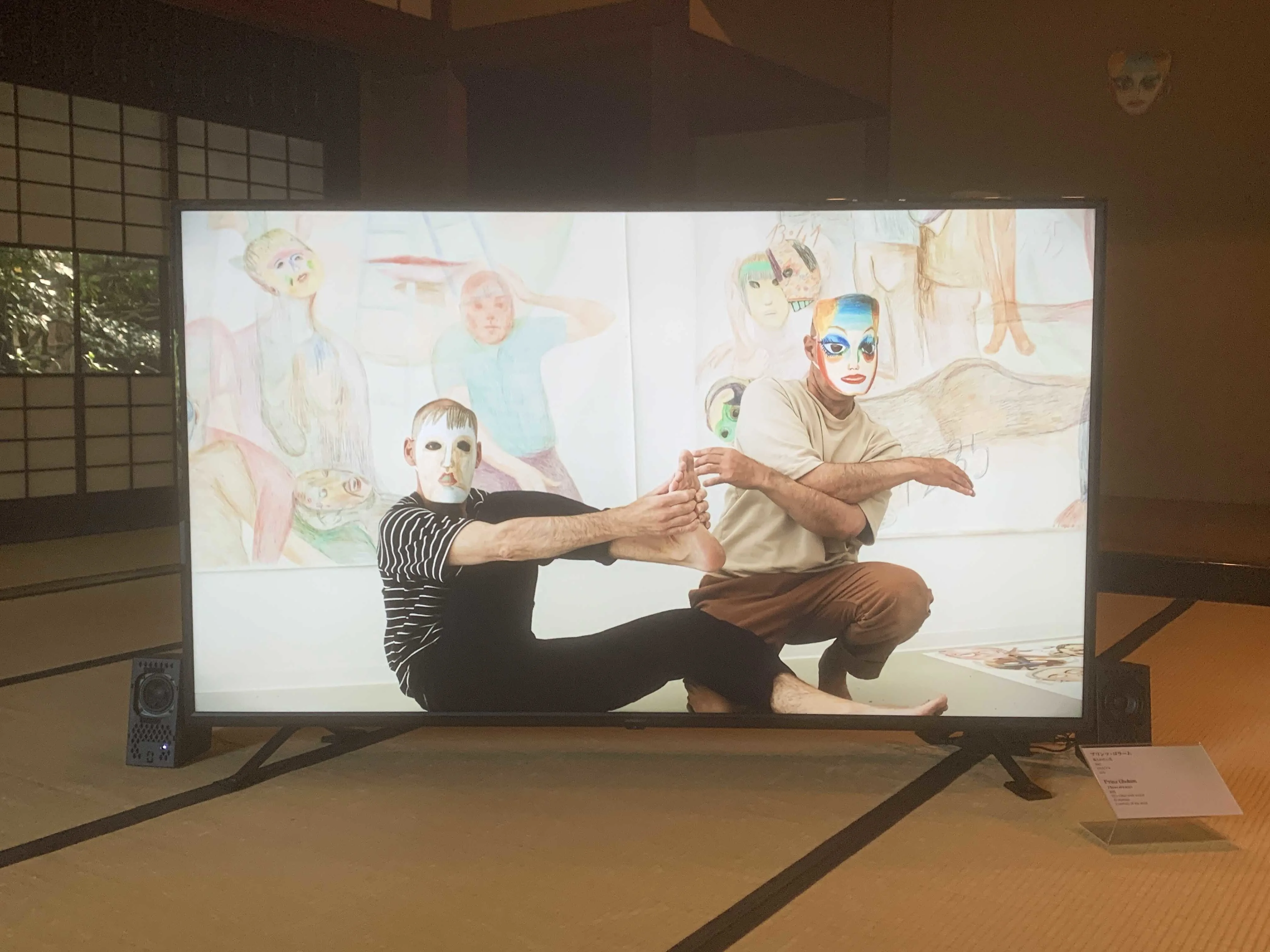 文化的・社会的な文脈のなかで規定される人間の振る舞いに注目したパフォーマンスで知られるプリンツ・ゴーラムが今回主題にしたのは「仮面」。古代から宗教的儀式などに用いられた仮面だが、欄間などに飾られたそれは現代的でユーモラス。さらに畳の上に置かれたモニターには、それらを身につけて行われたパフォーマンス映像が流されている。約2年半続く世界的なパンデミックにおいて、マスク(仮面)の意味は大きく変わり、誰にとっても身近なものになった。かれらの作品は、そのような世界と人の変化をシニカルに反映しているようでもある。