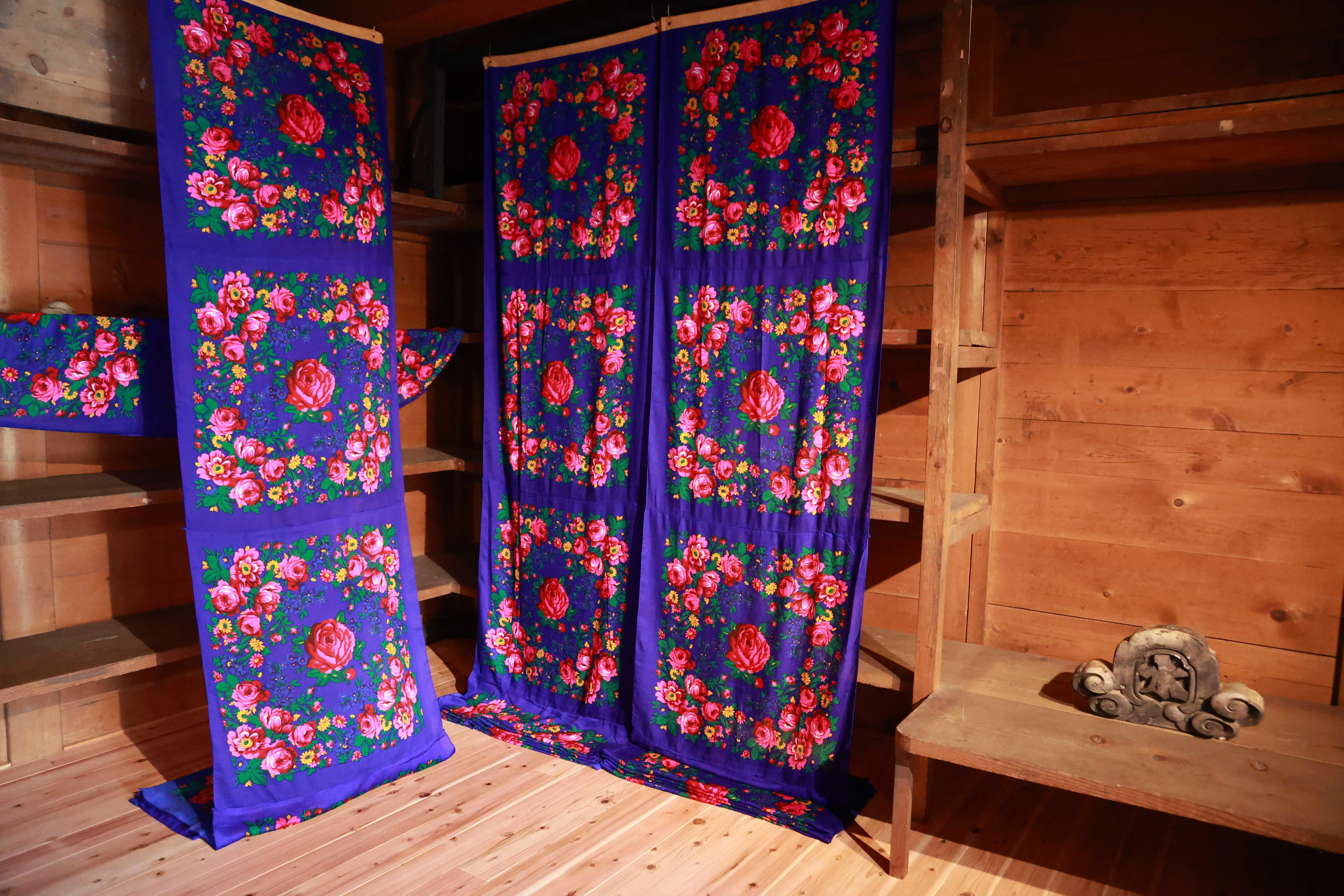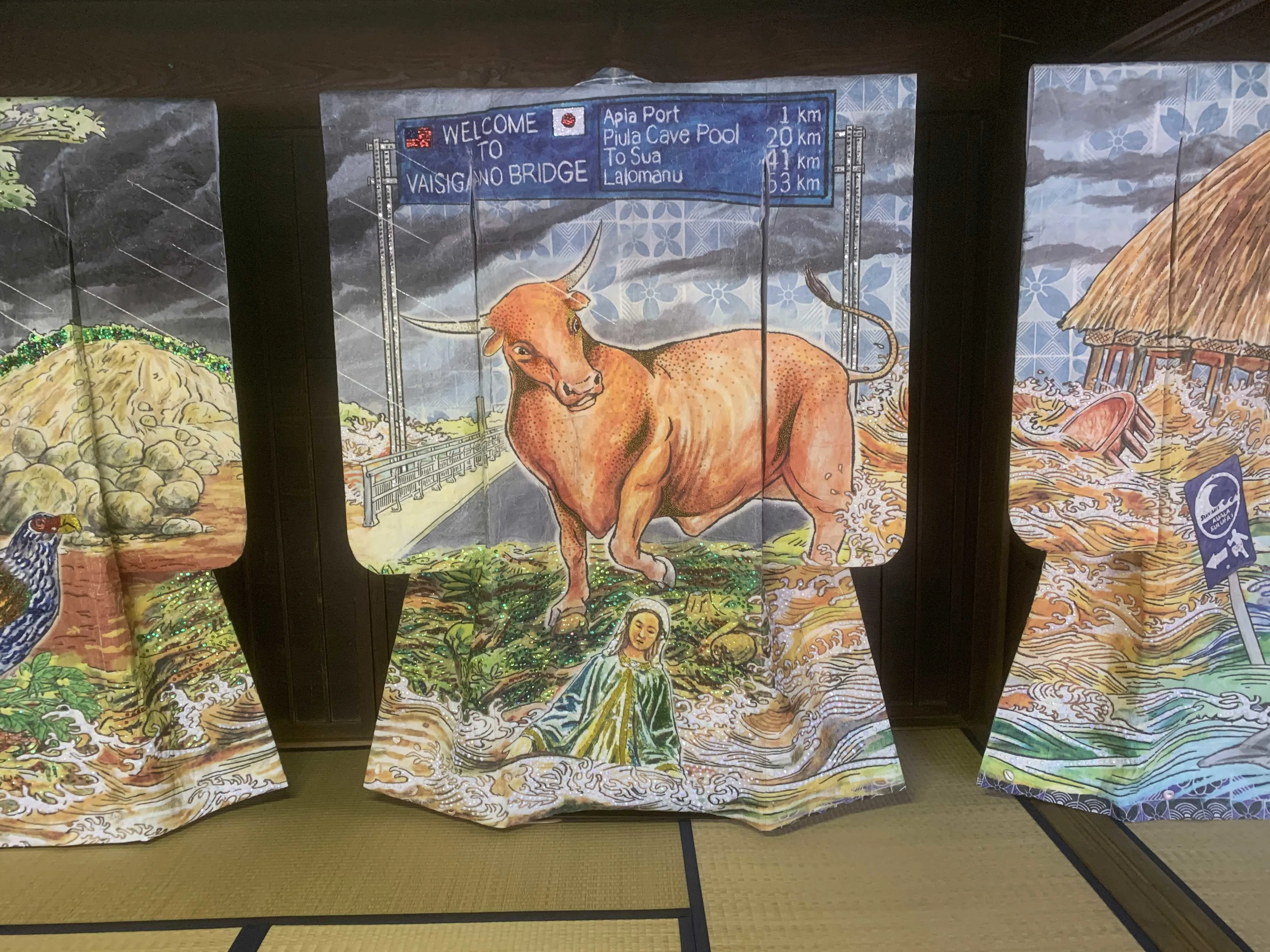 続いては岡家住宅に展示されているユキ・キハラ(サモア)とAKI INOMATA(日本)。キハラは日本とサモアの両国にルーツを持ち、日本の着物や紋様とサモアの自然環境をミックスさせた着物などを展示。いっぽうAKI INOMATAは、有松絞りの生地をミノムシに与え、蓑(巣筒)を作る様子や、新しい絞り染めの技法を発明し紹介している。