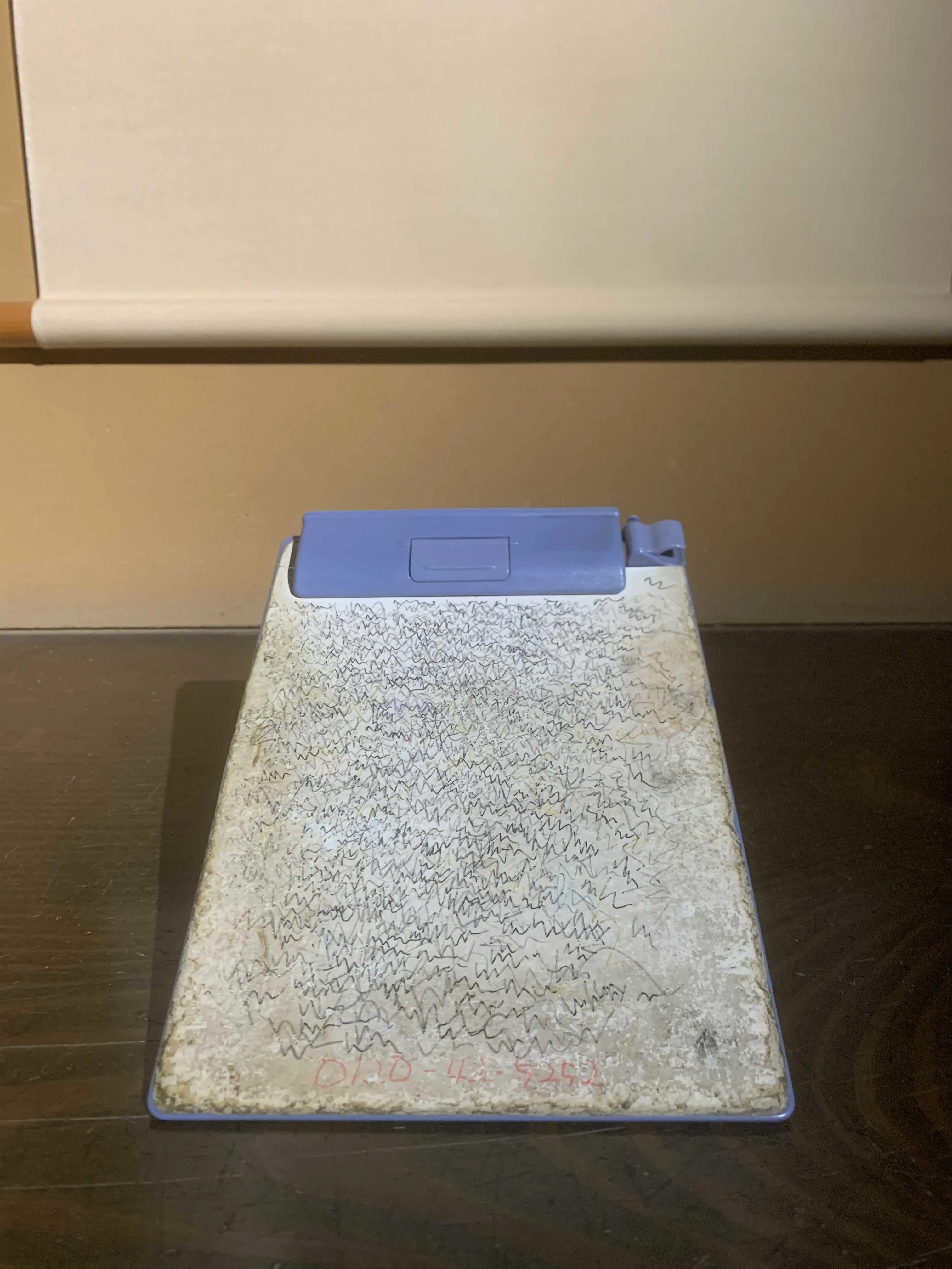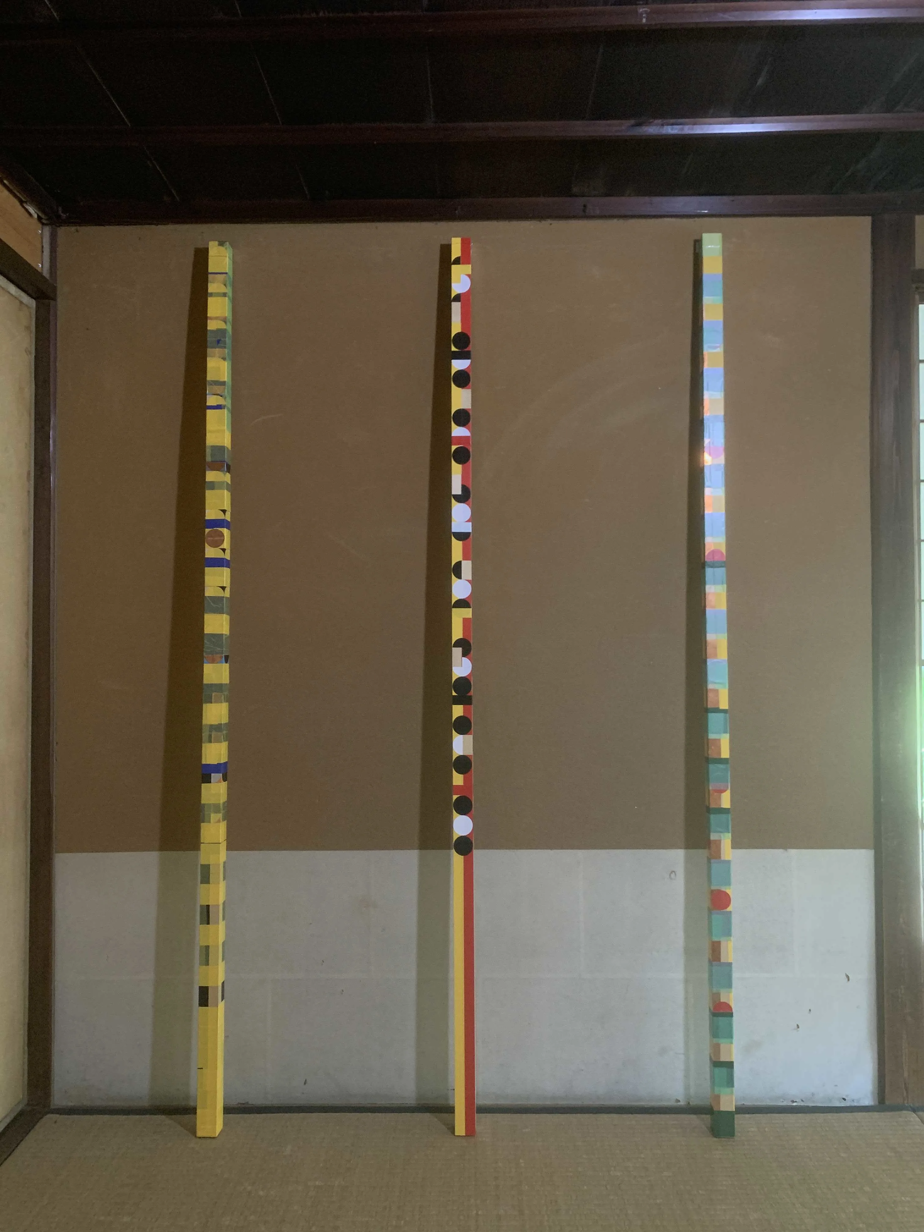 かれらの展示空間から中庭に降り、さらに奥の茶室に向かう。ガブリエル・オロスコの《ロト・シャク(回転する尺)》は、東アジアで古来から使われてきた長さの単位「尺」に注目した作品。ものさしを思わせる垂木の表面にはオロスコがこれまでの作品でも多用してきた幾何学的な紋様がカラフルにほどこされ、静謐な茶室との間にユニークな対比の効果を生み出している。また、タクシー運転手から譲り受けたという試し書き用のノートパッドが恭しく飾られているのも楽しい(もちろん作家が出合った事物の痕跡として、とても大切にされているのは間違いない)。