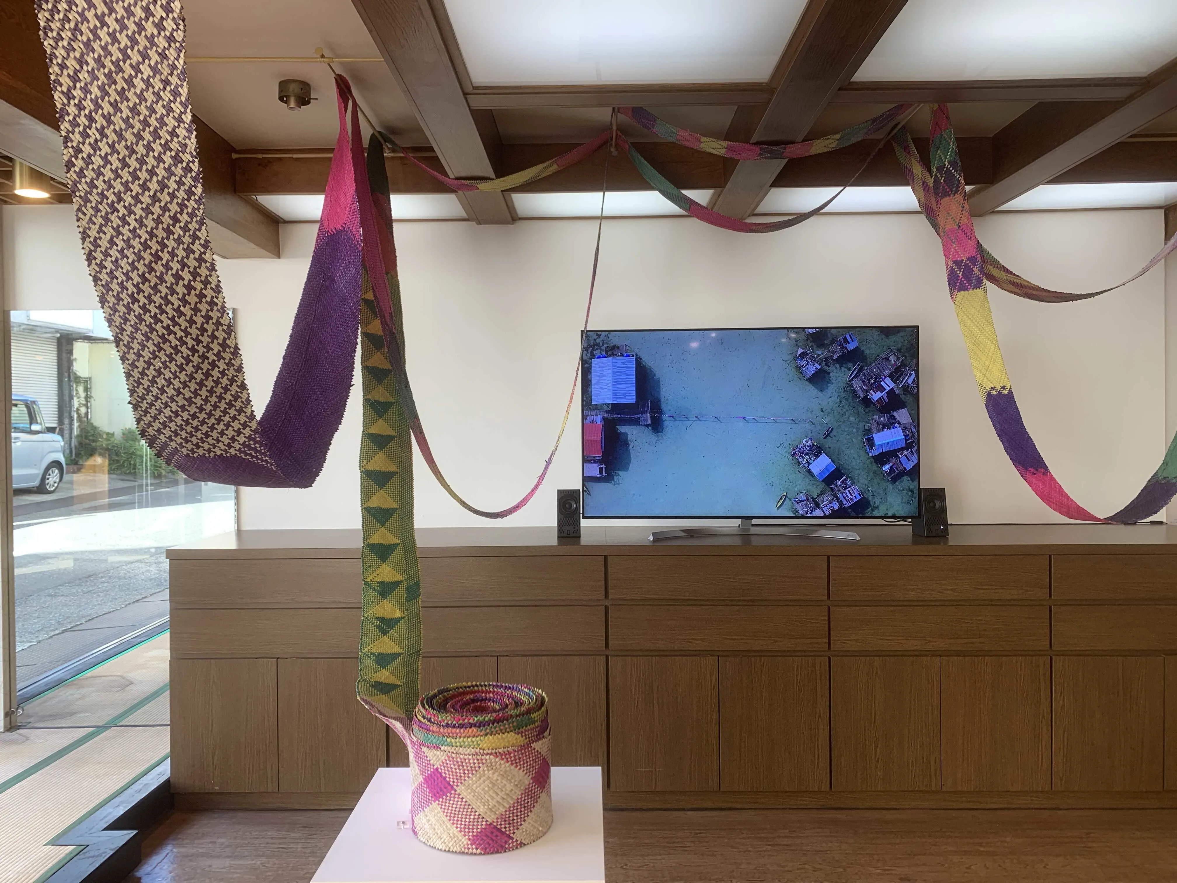 マレー語で「編まれたマット」を意味する「ティカ(tikar)」を素材に、本来は床に敷かれるはずのティカを天井から舞うように展示するイーは、展示空間における眼差しの高低差によって、植民地支配を経験した東南アジアにおける統治者と被治者の関わりを視覚化させている。また、同じようにティカをリボン状に編み、新たな使い方を示した映像作品《ティカ・レーベン》では、海で隔てられた2つのコミュニティをつなごうとするプロセスが記録されている。