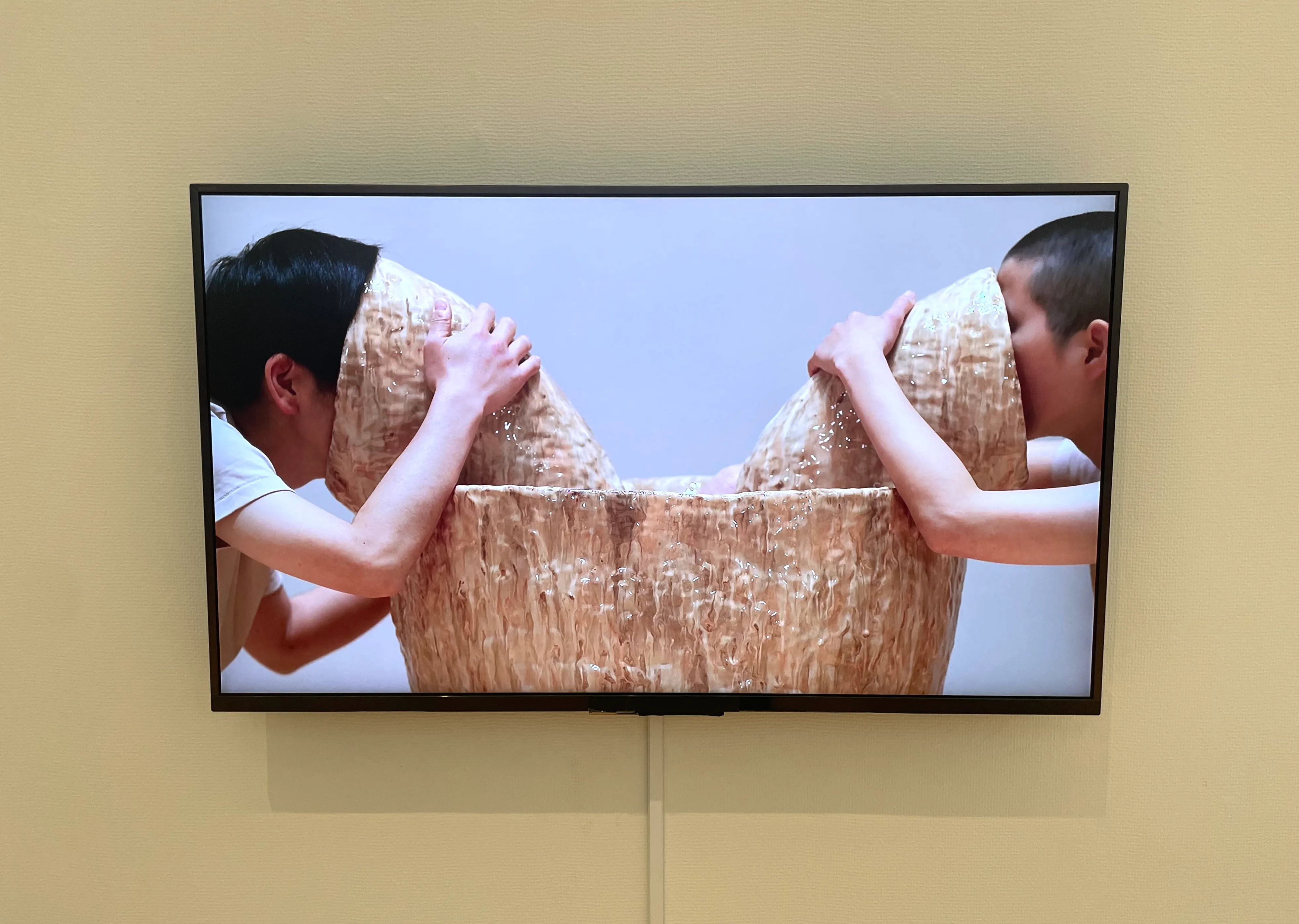 映像作品は、作品を使ったパフォーマンスの記録だ。パフォーマーたちは、無表情、ゆっくりした動きで、放心したように作品に寄りかかり、作品の開口部や管に吸い込まれるように顔を埋め、無心に息を吹き込んだり、耳を当てたりしている。あたかも魅入られたような虚脱の様子は「インタラクティブ=双方向的」と呼ぶには違和感がある。むしろ、やきものがパフォーマーたちを誘導し、支配しているようなのだ。ここには「やきものと、その使い手・作り手である人」という、従来的なやきものと人との主従関係の反転が起こっているように見える。