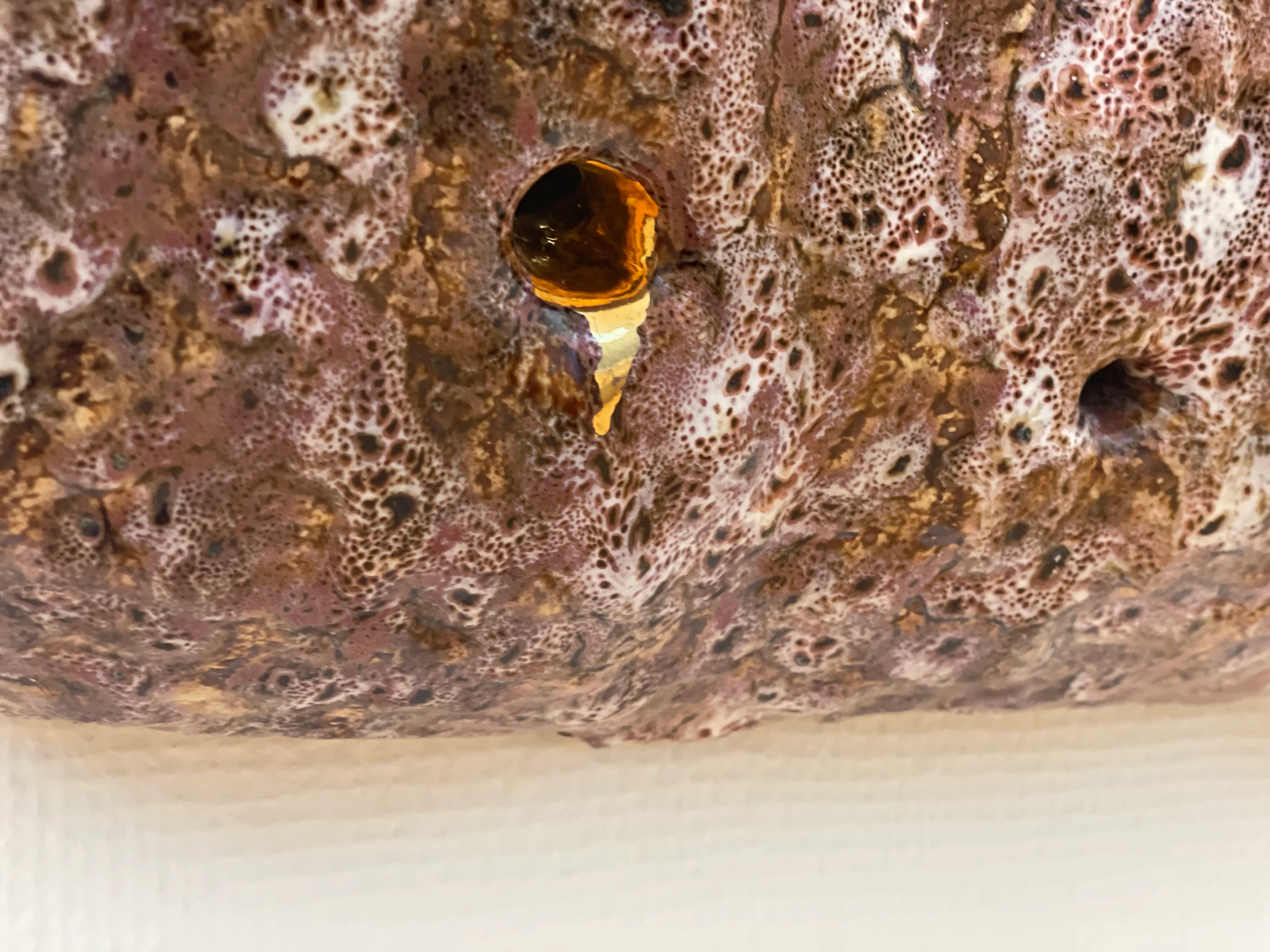 ここには、デザインや表面のテクスチャー、釉調に終始していたこれまでの陶表現からのダイナミックな視点と発想の反転がある。さらに、空洞のあるやきものを、西條は人体、内臓のイメージに重ね合わせ、作品に有機的な姿を与えている。やきものを人体になぞらえることは、縄文時代の「出産文土器」のように、太古から人類に共有されてきた感覚でもある。