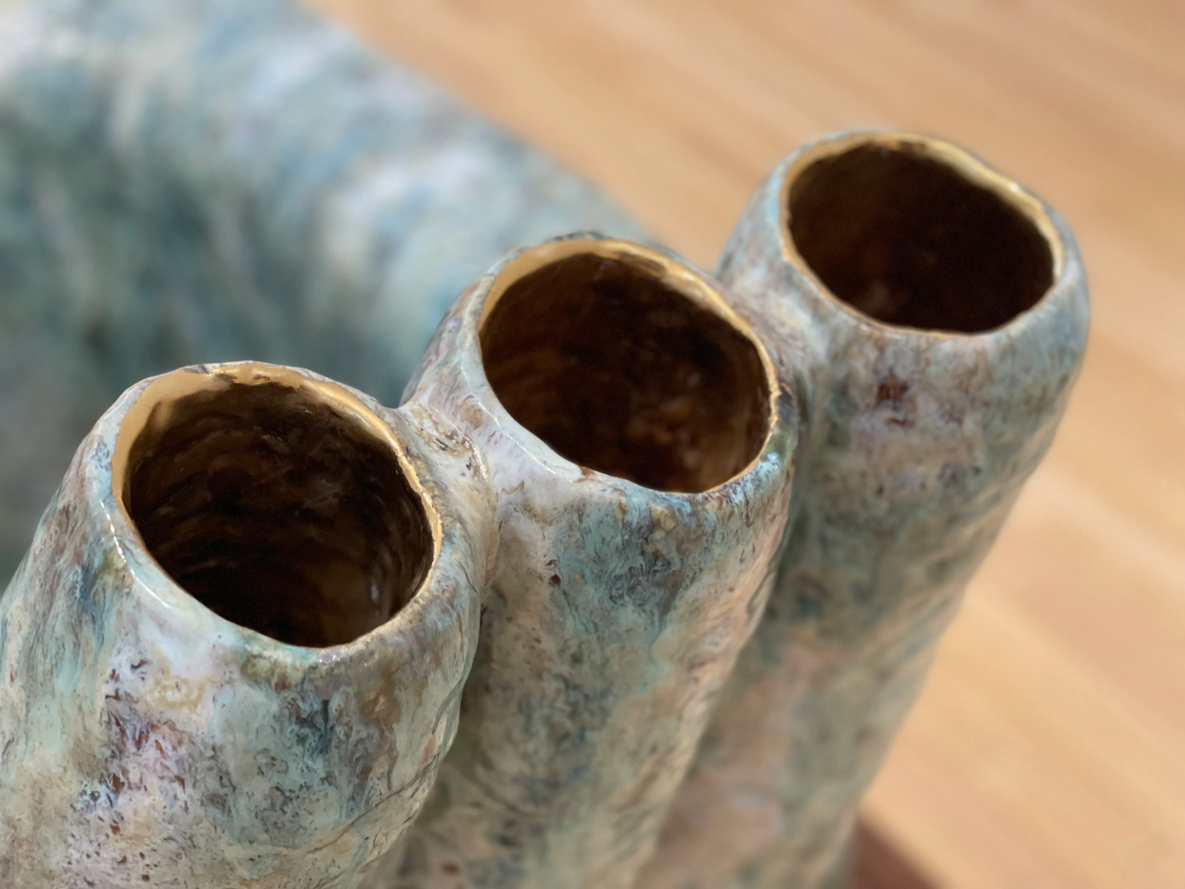 抽象画のように複雑な色調の釉薬をまとった有機的な形のオブジェが並ぶ。その多くに、管や開口部があるのが、西條の作品の特徴だ。