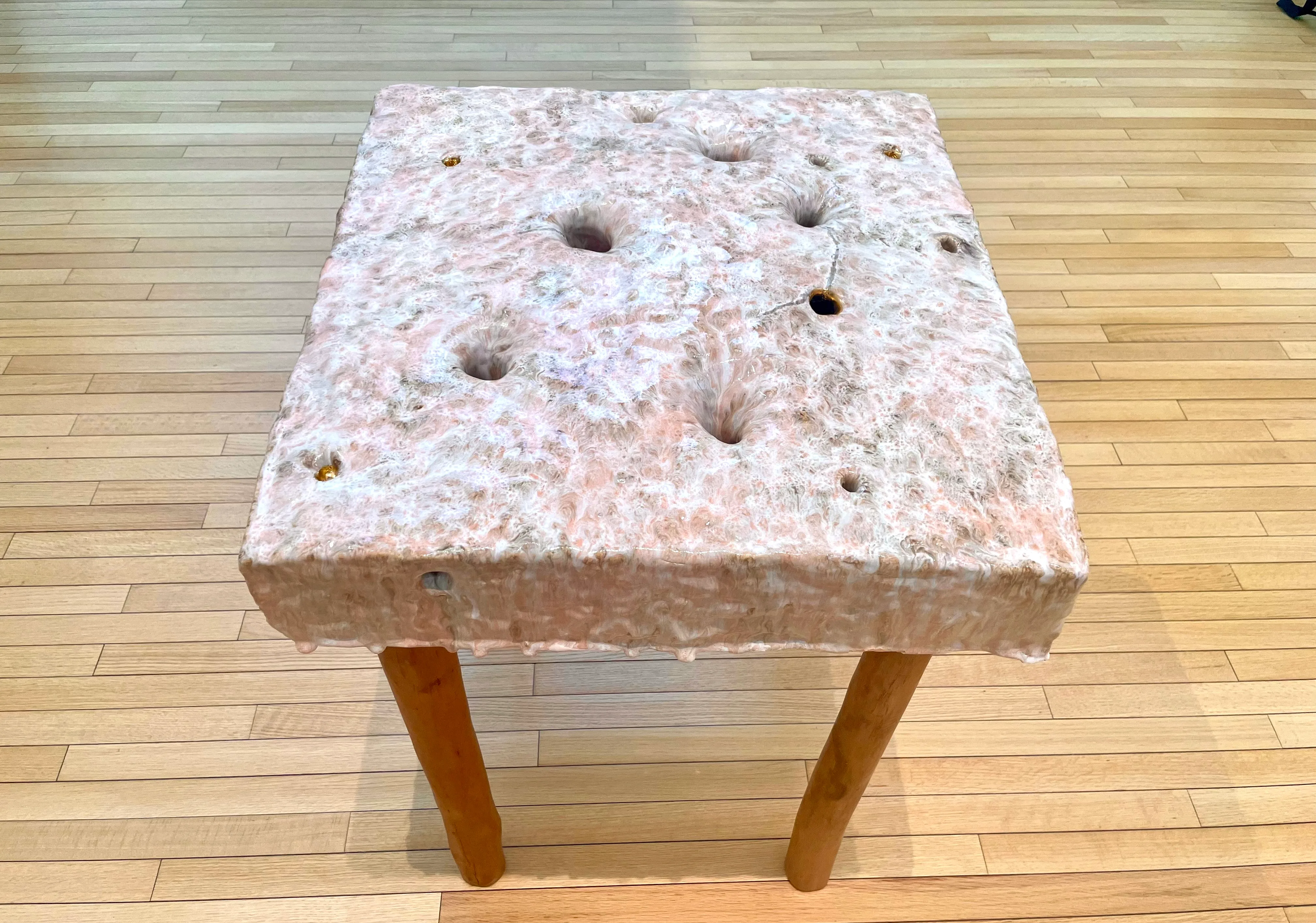 展示室の入り口近くにある作品は《mother’s skin》。ピンク色で柔らかな凹凸のある台状のオブジェに、小さな穴が穿たれている。展示会場は、吹き抜けを囲むゆったりした回廊で、高い天井から自然光が降り注いでいる。穴がその光を呼吸しているようだ。「ここから展示をぐるっと回って人生が始まるような、そんな構成をしています」。