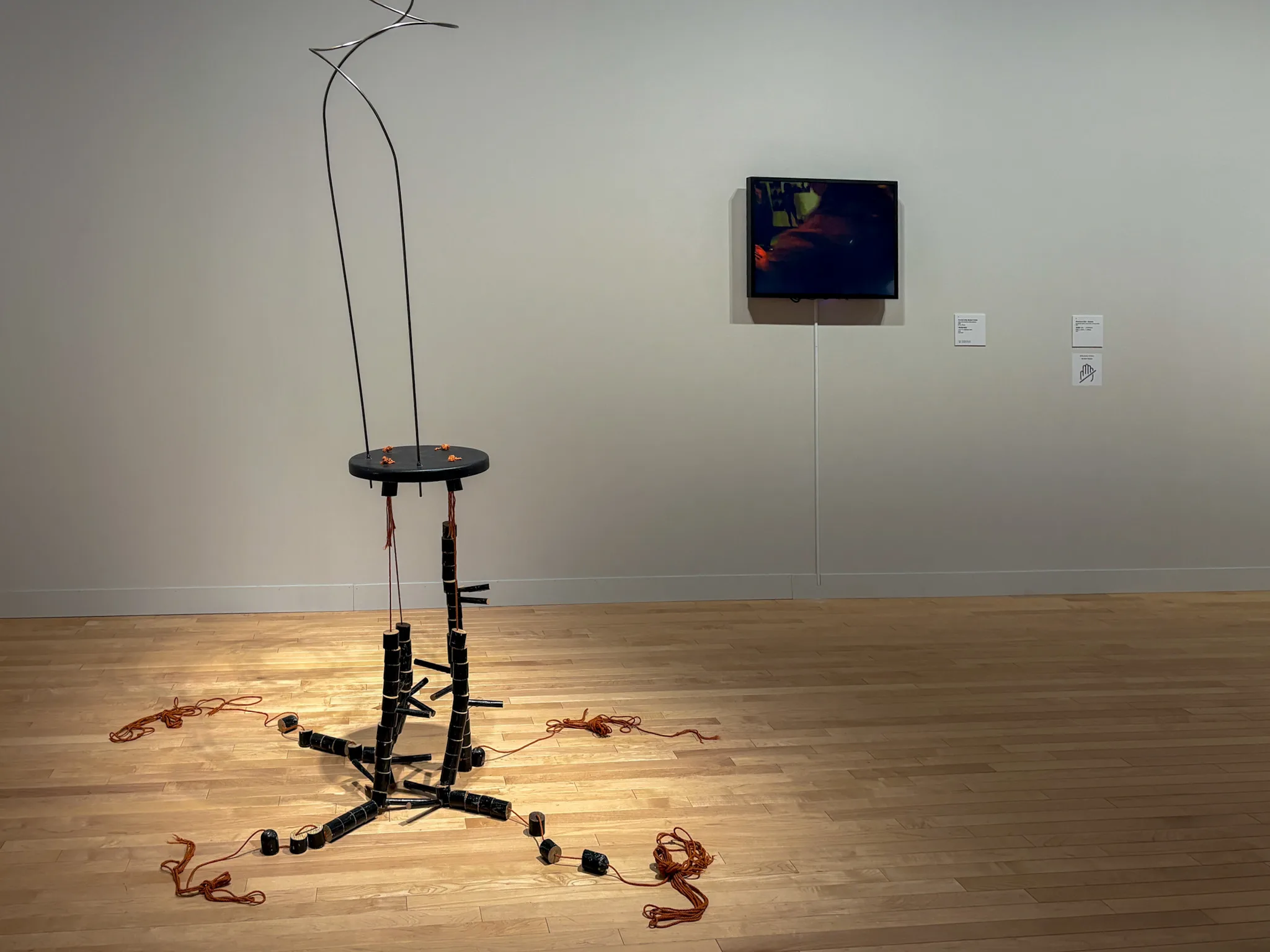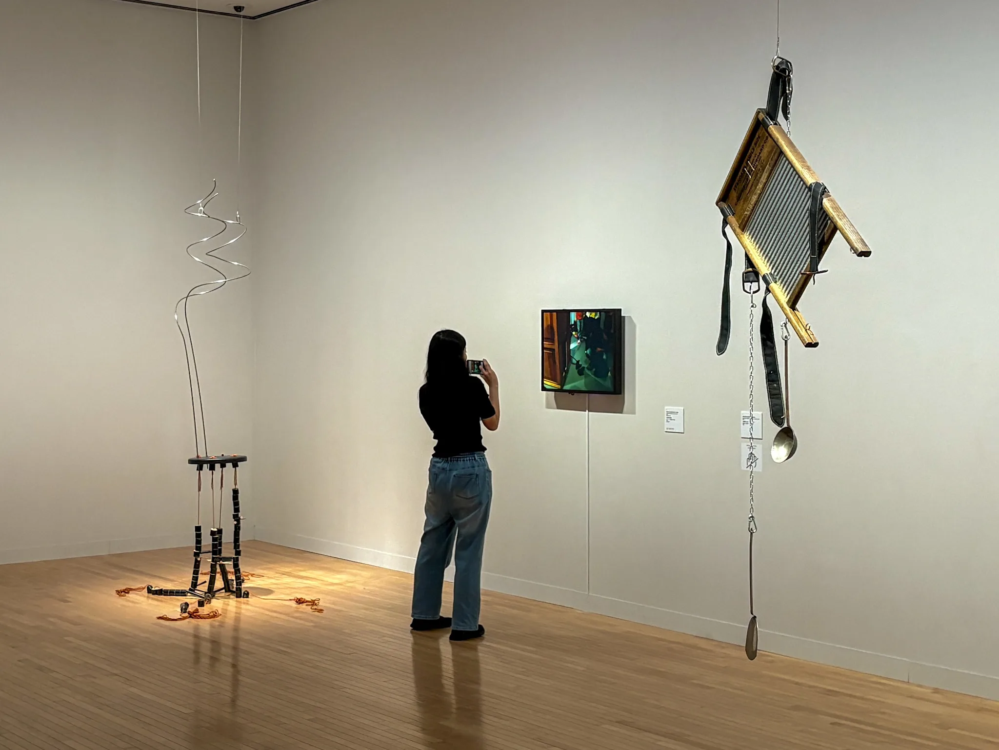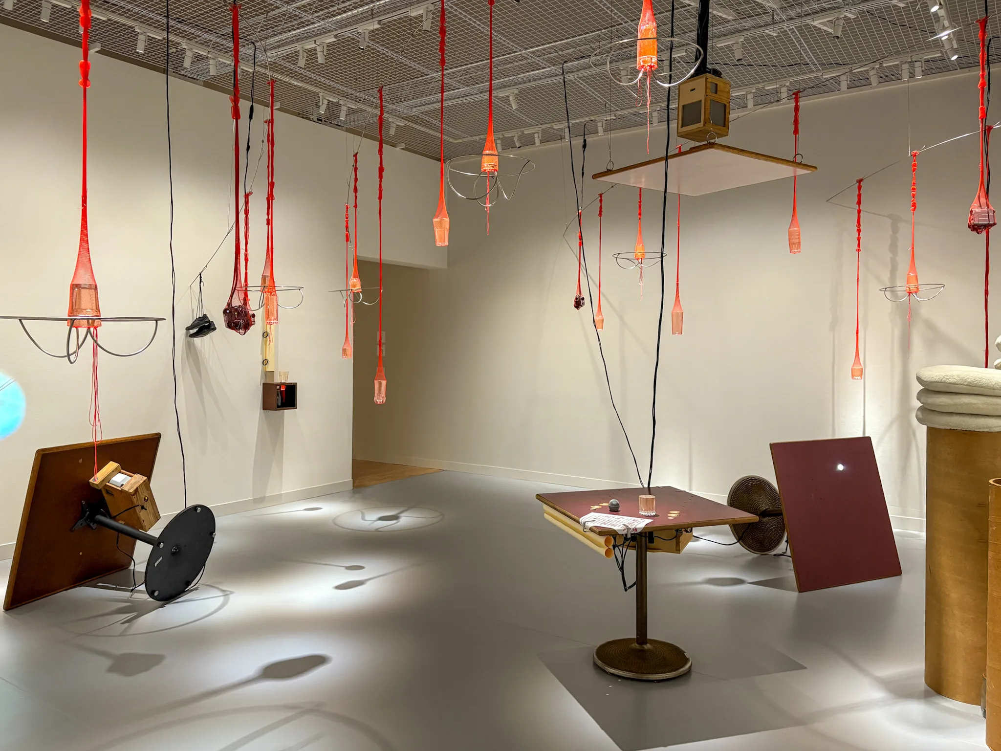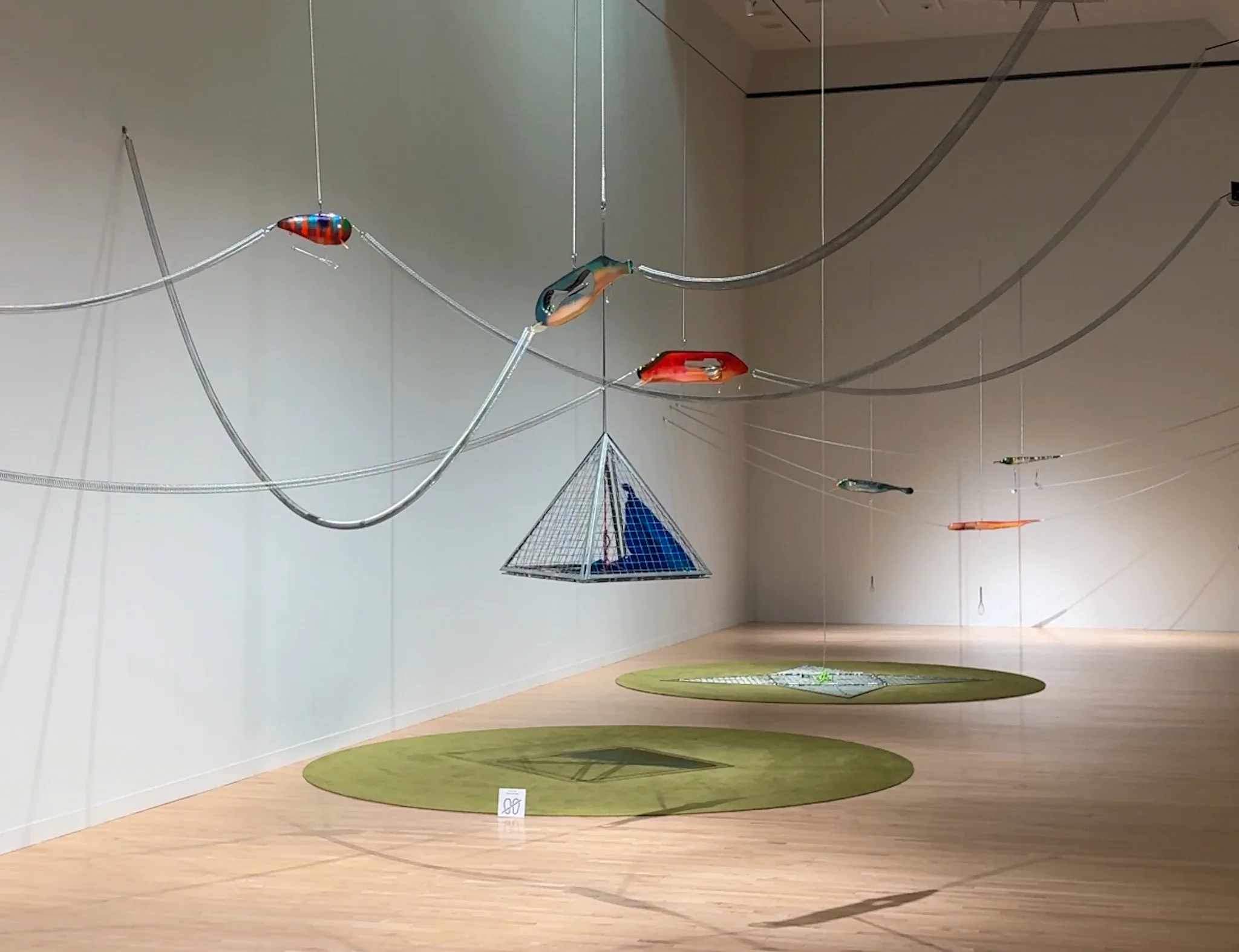 展覧会の最後のフロアに展示されているのは《Sounding Lines(測深線)》(2024)と、《Catch or Be Caught(とるかとられるか)》(2025)。バネにくくりつけられたカラフルな魚のルアーや、漁に使われる四角錐のトラップがゆらゆらと浮かび、水面に見立てられた同館の天井へと連れ去られてしまうような感覚が喚起される。