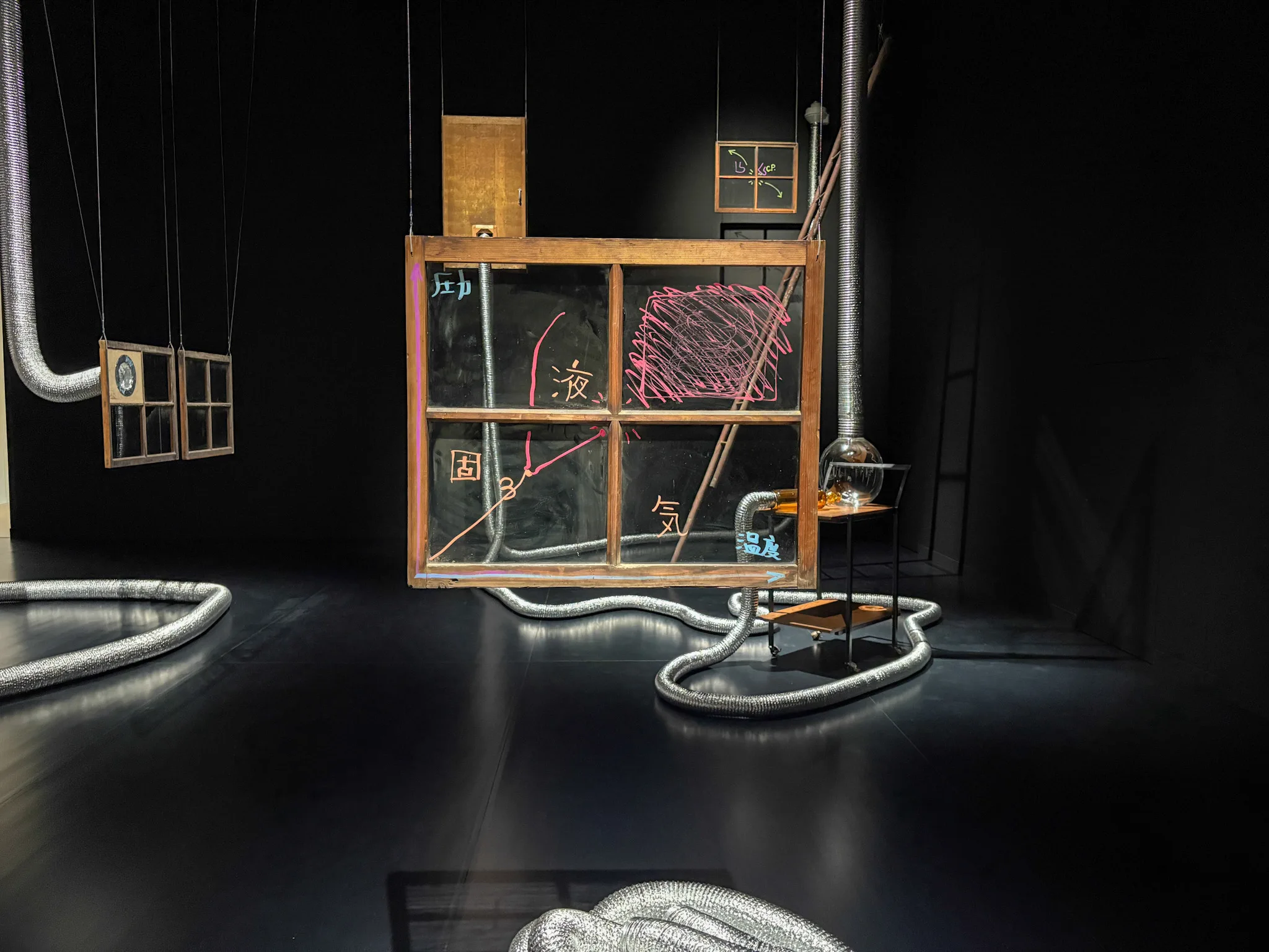 展覧会は、過去の主要なプロジェクトとその関連作品が時系列順に並ぶように構成されている。インスタレーションや彫刻はもちろん、映像や、パフォーマンス中に描かれる「ダイヤグラム」と呼ばれる図なども紹介。パフォーマンスと造形表現というふたつの世界を行き来してきた、キャリアの全体像が示された。担当学芸員の岡村は展示内容を考えるうえで、パフォーマンスという表現手法を美術館でどう展示するかについて検討を重ねた、という。