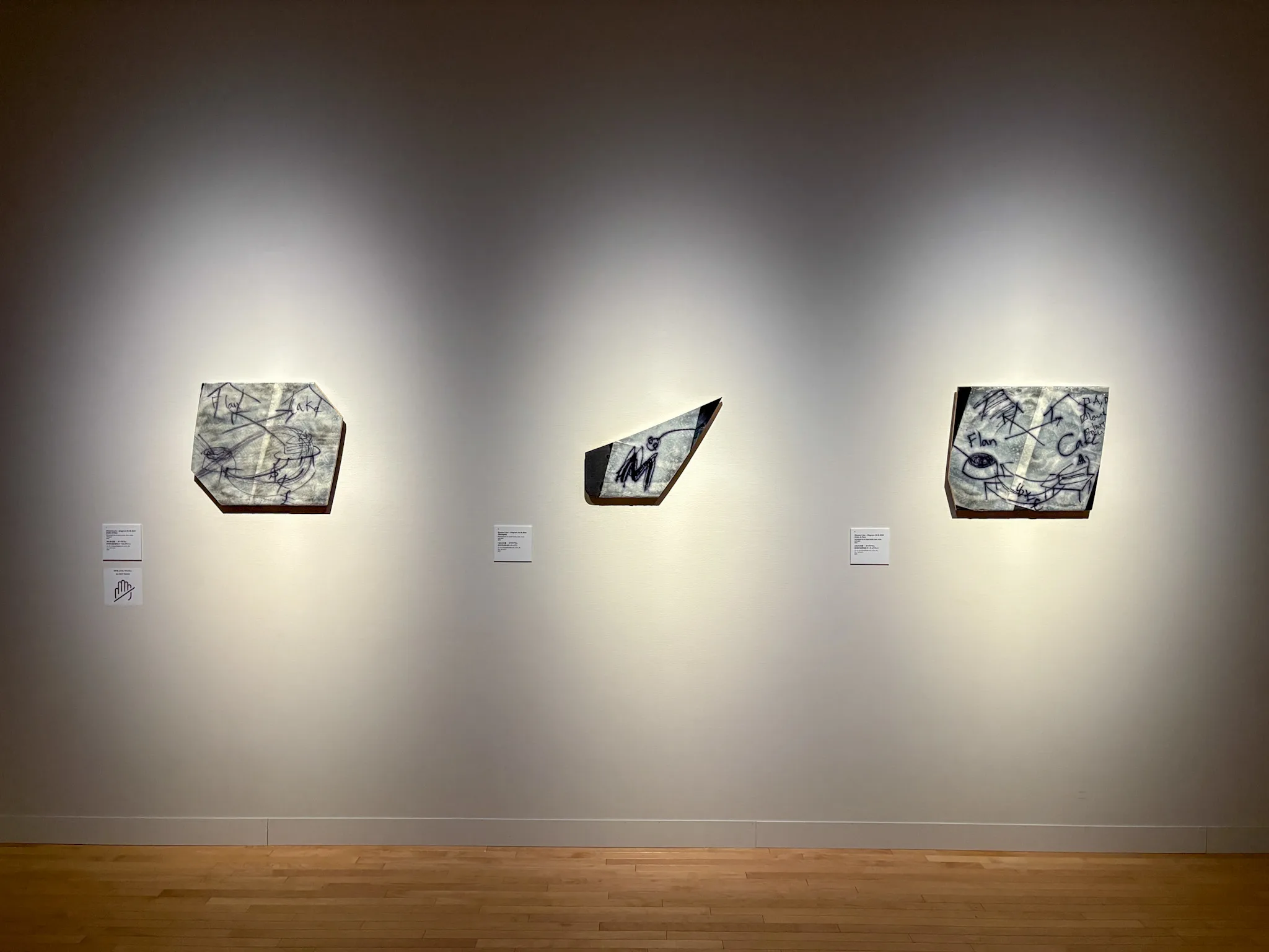 何度か再演が行われている同作品だが、それらにひとつとして同じ形態はない。笹本がパフォーマンスごとにキッチンペーパーに描くドローイングは、その反復と差異の痕跡を示すものだ。現在その図(ダイヤグラム)は樹脂で固められ、作品として展示されている。