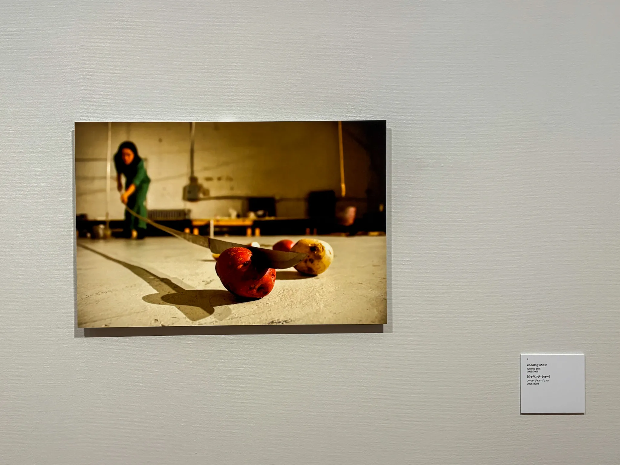最初の展示室で紹介されている1枚の写真は、キャリアの起点として位置付けられるパフォーマンス作品《cooking show(クッキングショー)》(2005)のいち場面。料理を作る手元のみが手前で大きく映されるという料理番組の構図が、遠くから長いナイフを使って果物を切る笹本によって、デフォルメされながら強調されている。