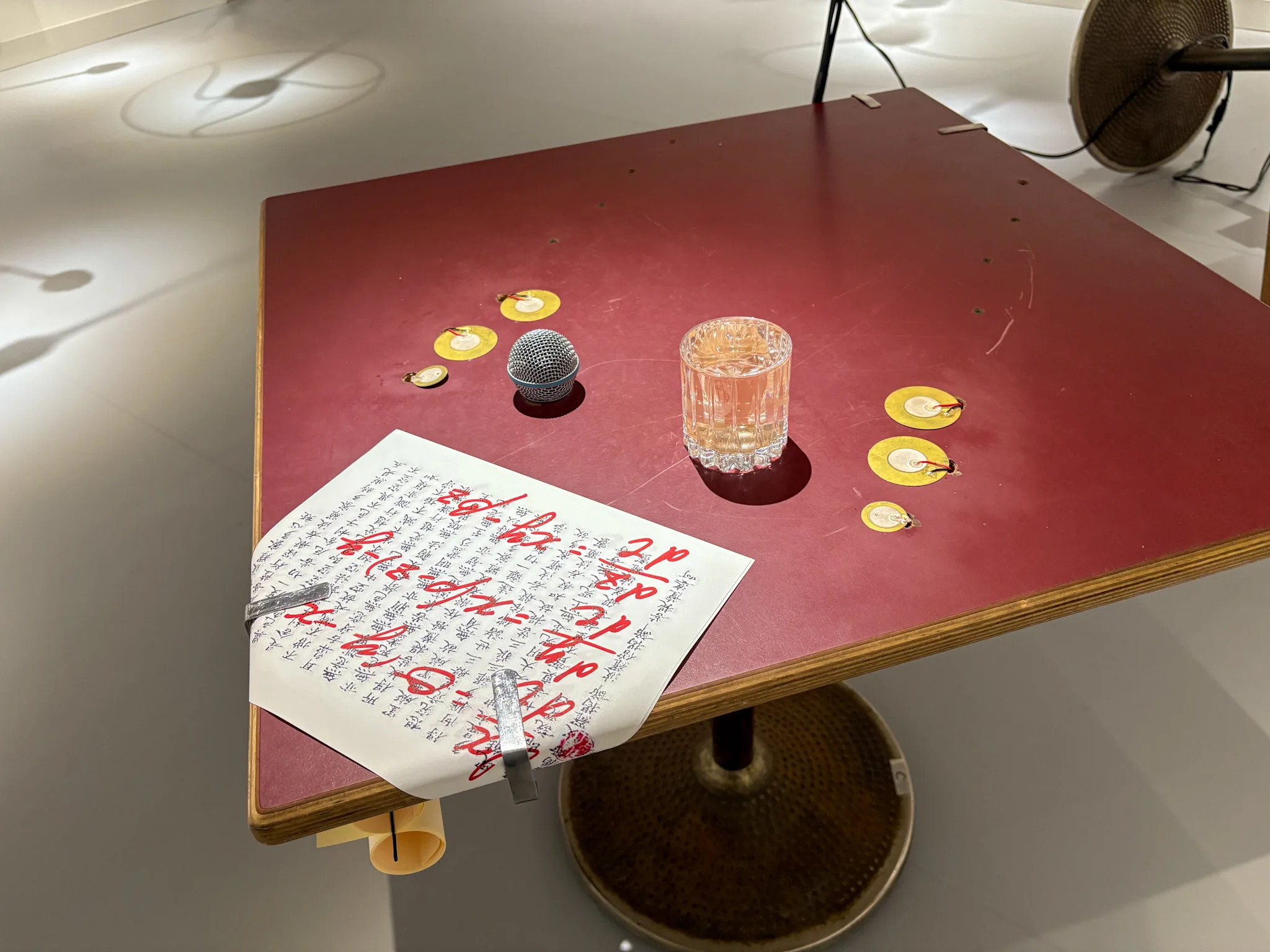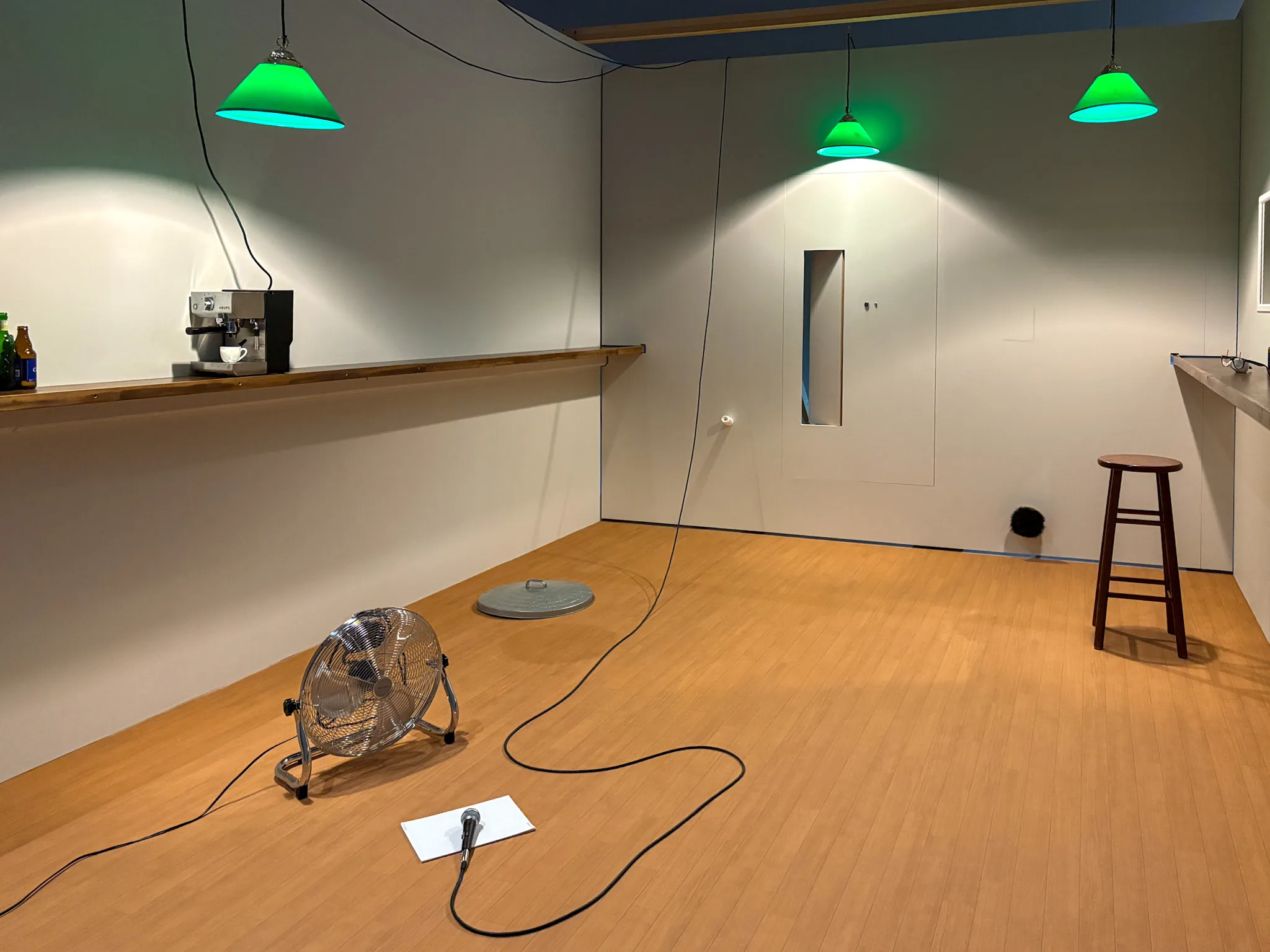 学芸員の岡村は「近年の作品では、コンセプトや作品に込められたメッセージのプレゼンテーションを、インスタレーションに託すような試みがなされている」と指摘。部屋に張り巡らされた工業用のダクト、部屋の隅に配されたファン、部屋に吹く風、回り続けるグラスなど、この空間に散りばめられた諸要素は、それぞれが新たな関係性を生み出す。