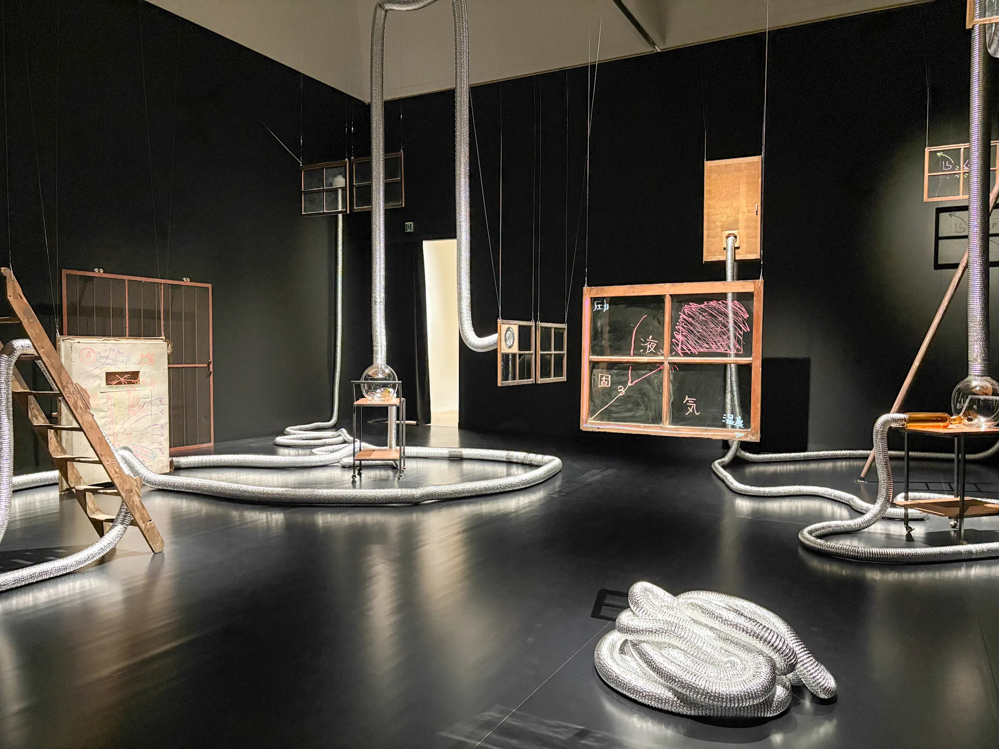 展覧会の後半から紹介されるのは、冒頭でも紹介した新しい表現動向の一部だ。《スピリッツの3乗》(2020)は、弘前れんが倉庫美術館のコミッションとして制作された作品。もともとシードル(りんご酒)の醸造場だった同館の建築をリノベーションする際に出た廃材、古い窓やハシゴなどを素材としたインスタレーションが、東京都現代美術館の空間に合わせて再構成されている。