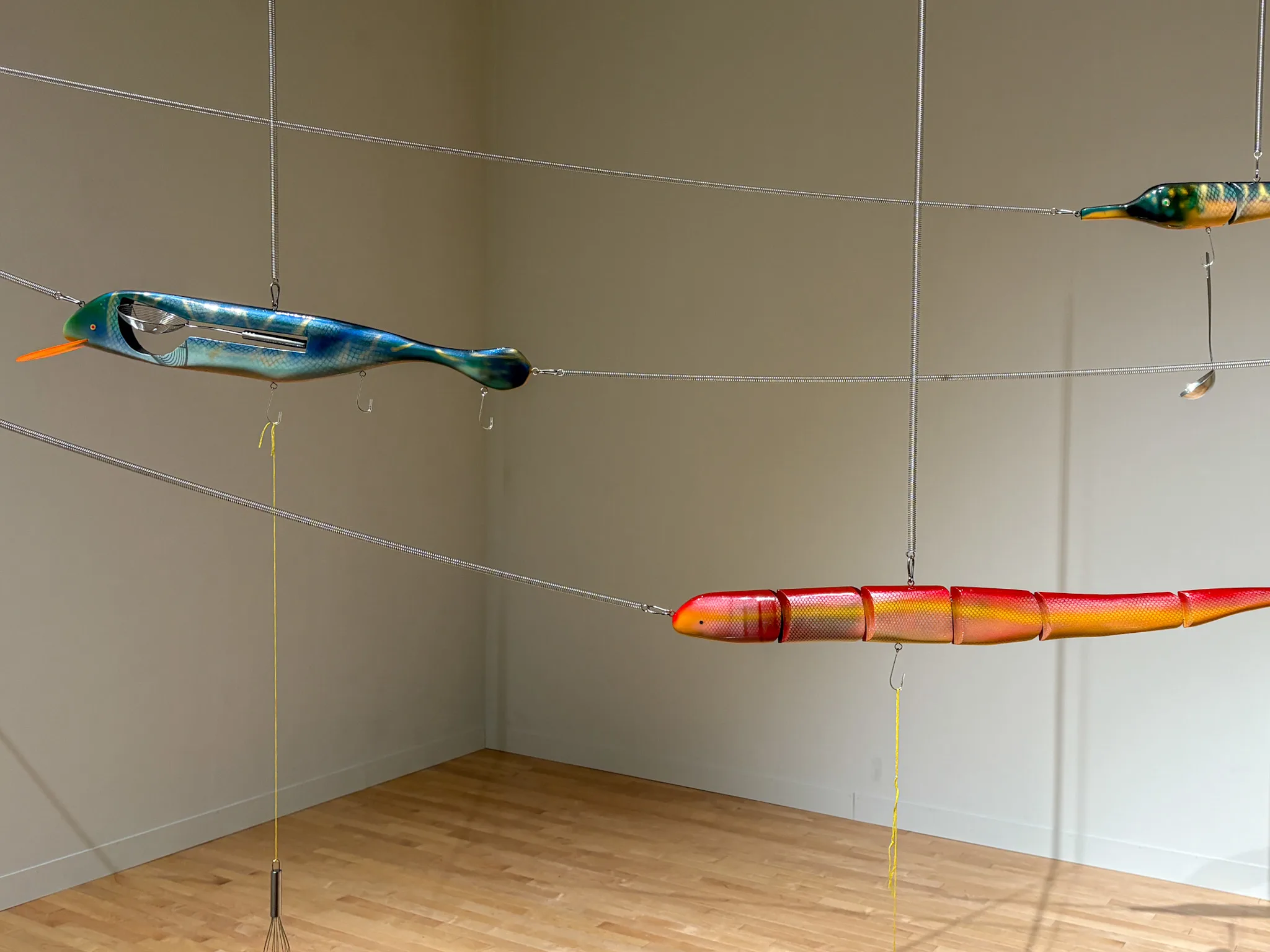 「この魚(ルアー)はそれぞれが私の知人を模しているのですが、そもそもこの作品の起点となったのはバネの動きです。スタジオで、バネを用いた波や振動に関するリサーチを進めるなかで、より広いところでこの動きを展開してみたいと思いました」(笹元)