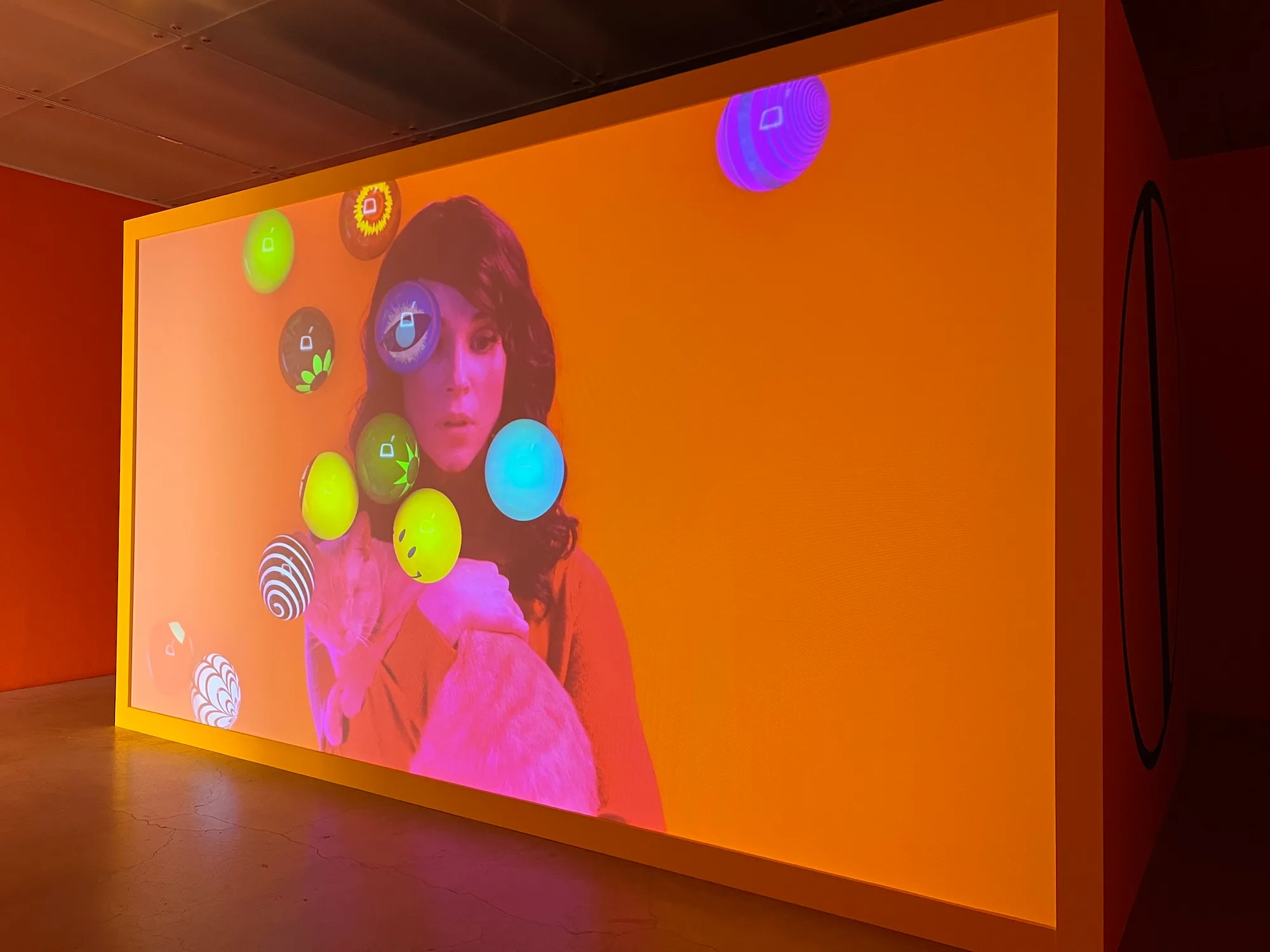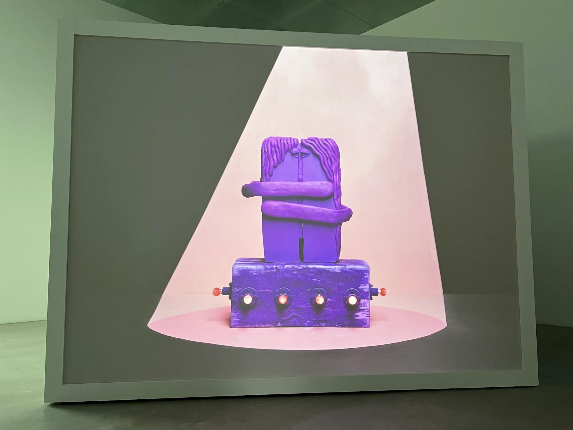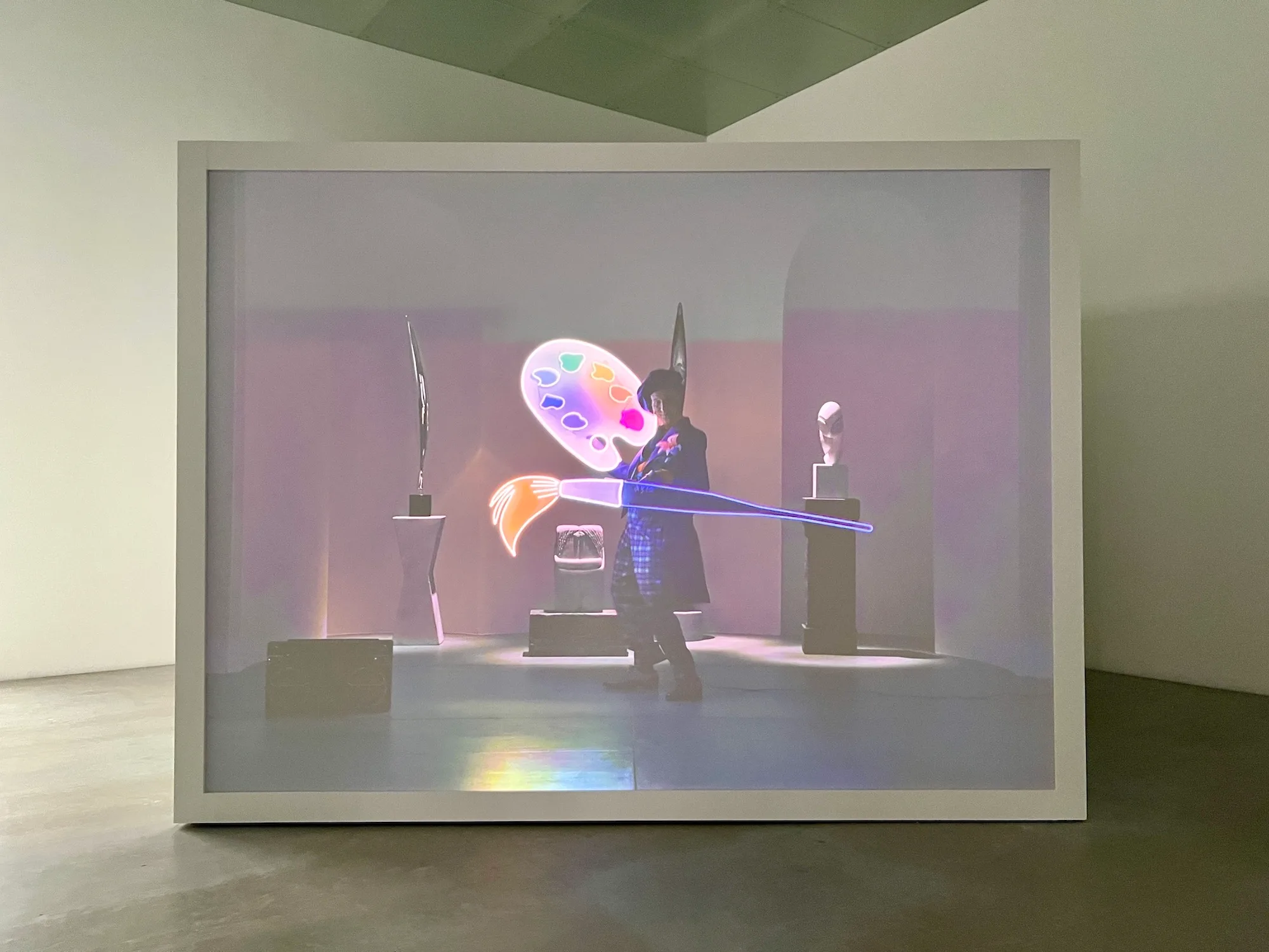 《ゴム製鉛筆の悪魔》(2019)は、広い展示空間に巨大でカラフルな5つのキューブが出現、それぞれに異なる映像が次々と映されるという本展のハイライト。映像は57章からなるアメリカの叙事詩というべきもので、子供向け番組、映画、美術史、ポップカルチャーのアイコンまで様々なイメージが援用されている。登場人物の多くは作家自身が演じており、ここでも作家は自らの身体を通して、イメージやキャラクターの核心に迫ろうとする。