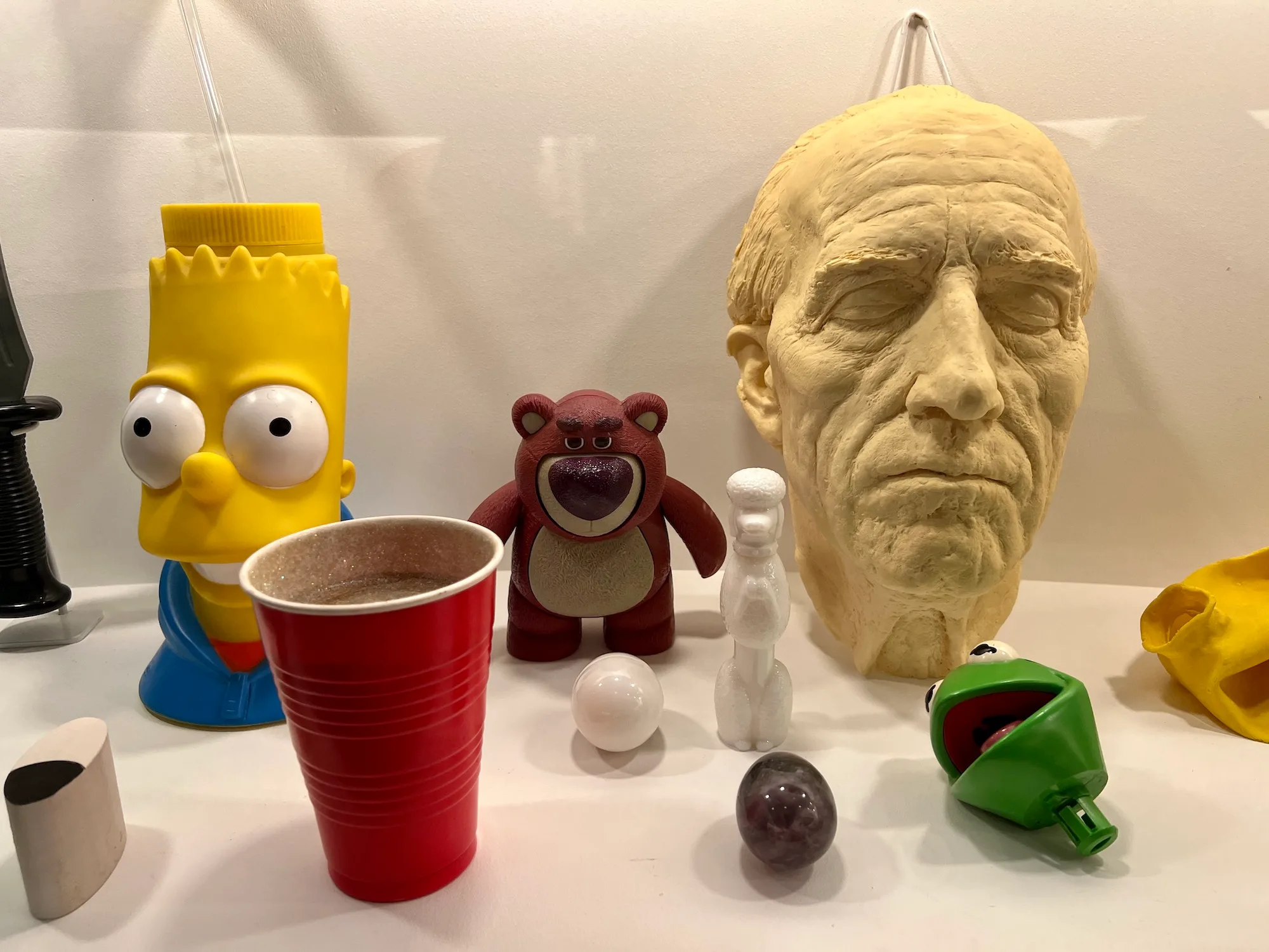 内部に入ると、作家が小さい頃から集めていたプラスチックなどの小物、映像作品に登場したグッズなどが並んでいる。