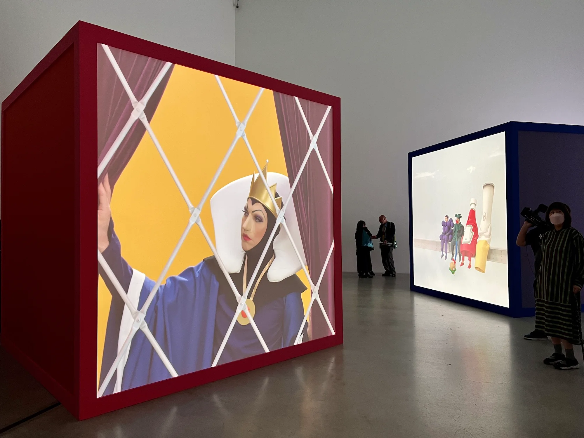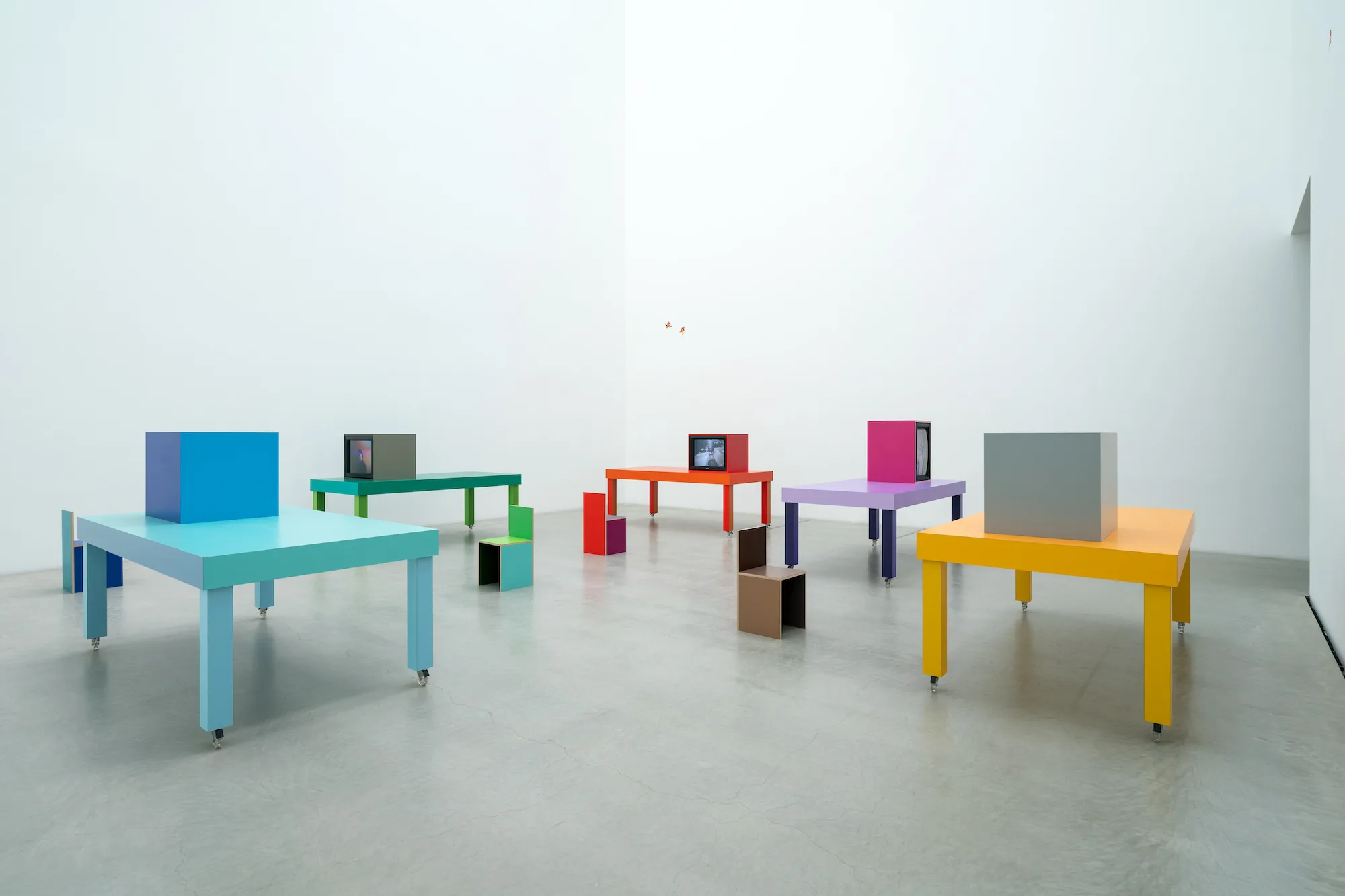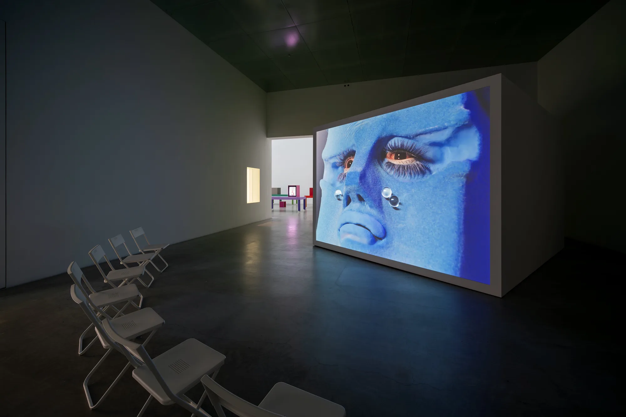 また「愛」「喪失」「解放」をテーマにした《ROY G BIV》(2022)では、《大ガラス》《遺作》といったマルセル・デュシャンの作品で知られ、コンスタンティン・ブランクーシの彫刻を収容するフィラデルフィア美術館のギャラリーが再現される。デュシャンとデュシャンが演じるローズ・セラヴィに扮したダ・コルテが登場し、さらにブランクーシの彫刻《接吻》に生命が吹き込まれる。デュシャンやブランクーシといった不動の地位を獲得した作家の作品がダ・コルテの手によって生命を獲得し、新たに動き出す光景は楽しくも毒のあるシュールな世界だ。ちなみに《ROY G BIV》とは、虹の七色の頭文字(赤、オレンジ、黄、緑、青、藍、紫)を順番に並べたもので、会期中には色の順番が7回変わり、映像を流すキューブ型の彫刻も7色に塗り替えられるパフォーマンスが行われるという。この変化もまた本展の見どころと言えよう。
