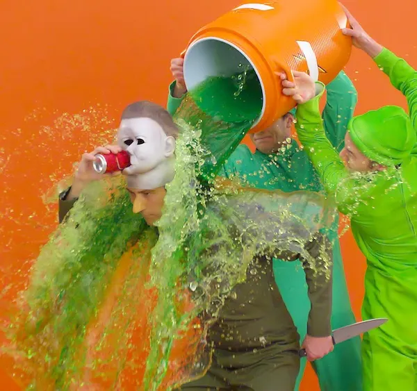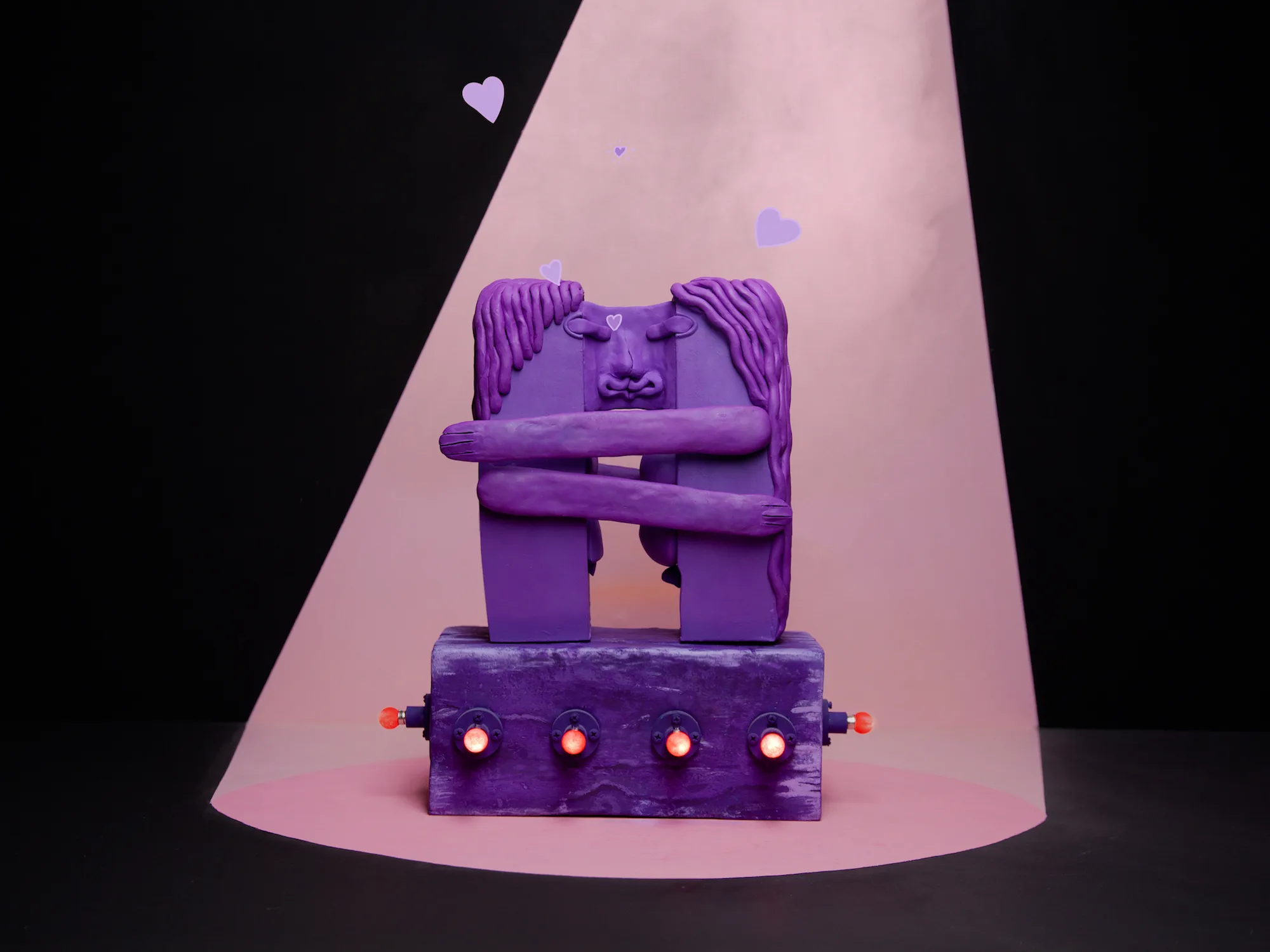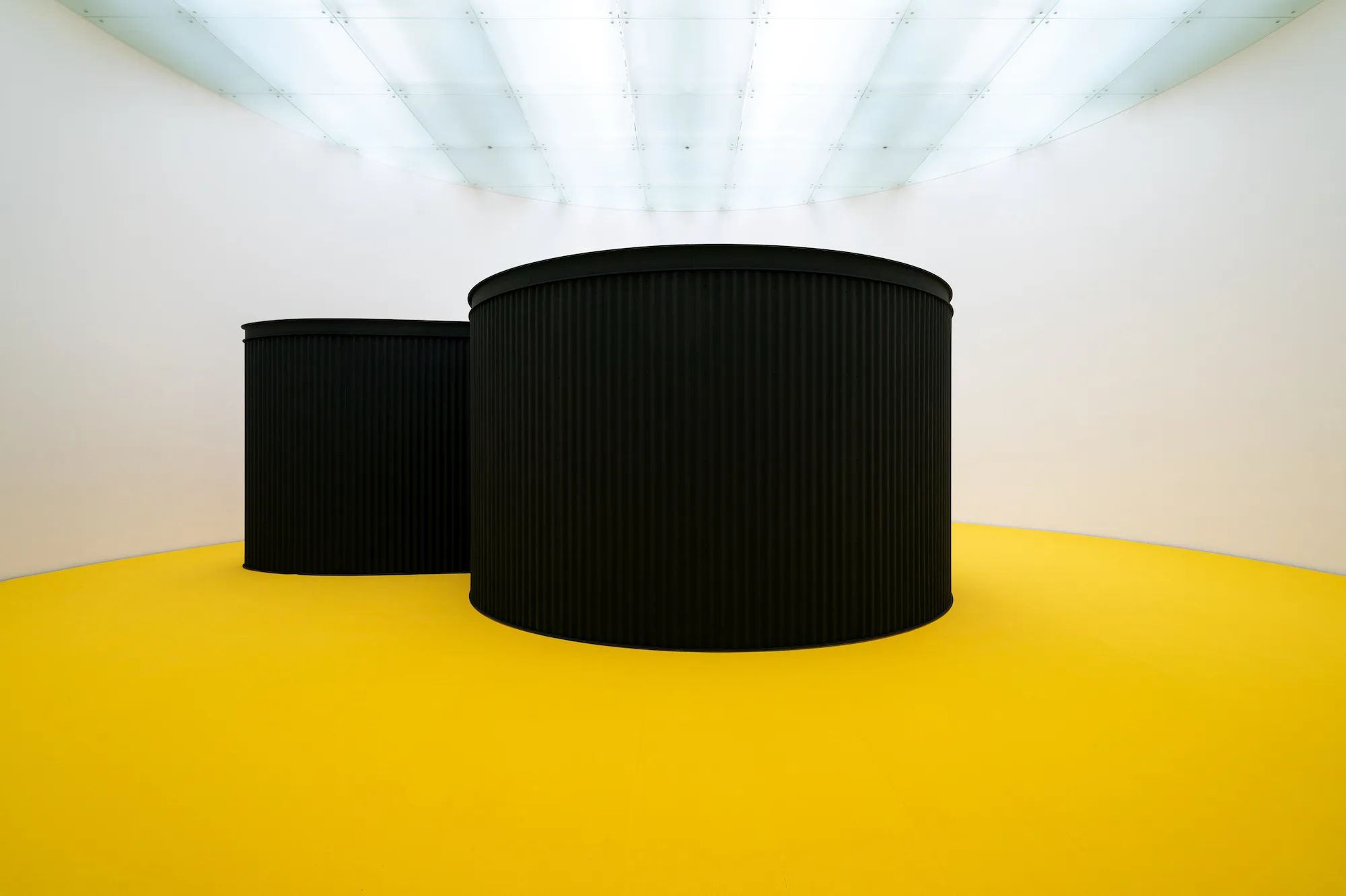 また「愛」「喪失」「解放」をテーマにした《ROY G BIV》(2022)では、《大ガラス》《遺作》といったマルセル・デュシャンの作品で知られ、コンスタンティン・ブランクーシの彫刻を収容するフィラデルフィア美術館のギャラリーが再現される。デュシャンとデュシャンが演じるローズ・セラヴィに扮したダ・コルテが登場し、さらにブランクーシの彫刻《接吻》に生命が吹き込まれる。デュシャンやブランクーシといった不動の地位を獲得した作家の作品がダ・コルテの手によって生命を獲得し、新たに動き出す光景は楽しくも毒のあるシュールな世界だ。ちなみに《ROY G BIV》とは、虹の七色の頭文字(赤、オレンジ、黄、緑、青、藍、紫)を順番に並べたもので、会期中には色の順番が7回変わり、映像を流すキューブ型の彫刻も7色に塗り替えられるパフォーマンスが行われるという。この変化もまた本展の見どころと言えよう。