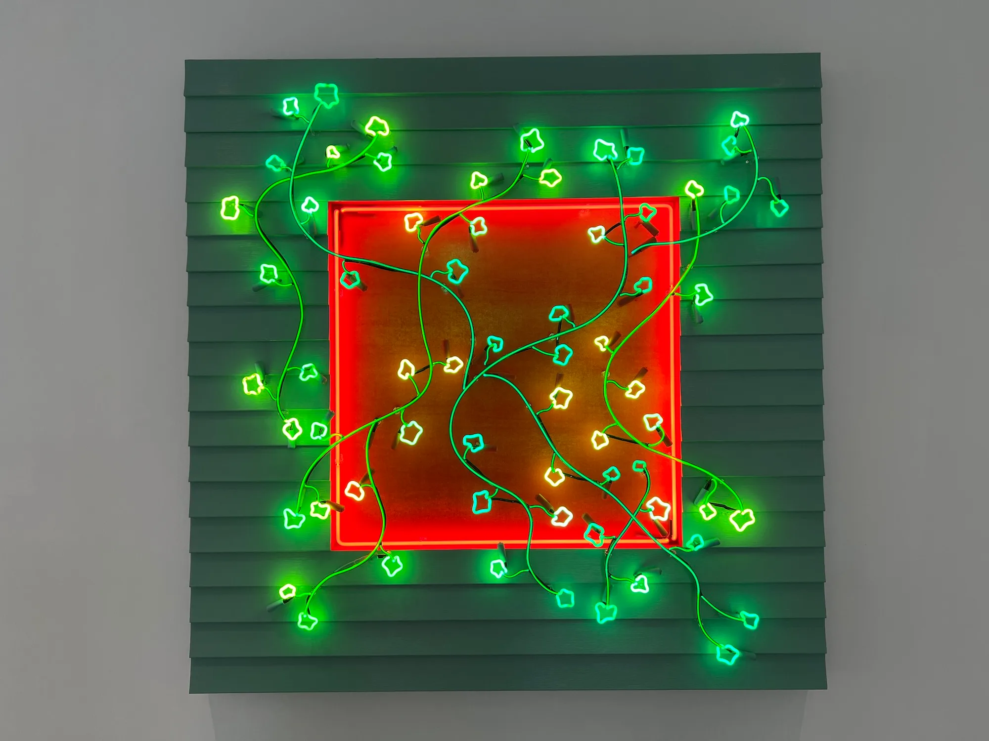 蔦の葉によって構成されるこの生と死の循環は、ここでは鮮やかなネオンによって映し出されている。20世紀初頭の照明広告を席捲したネオンは蛍光灯の普及とともに衰退した。ネオンが新たなノスタルジーの対象として見出され、文化として復興していくのは60年代半ばからだ。環境と犯罪の関係を表す「割れ窓理論」に着想を得た本作は、美術館の窓ガラスに写りこむネオンの蔦とともに、そうした「アメリカ」の記憶の一端を映し出す。