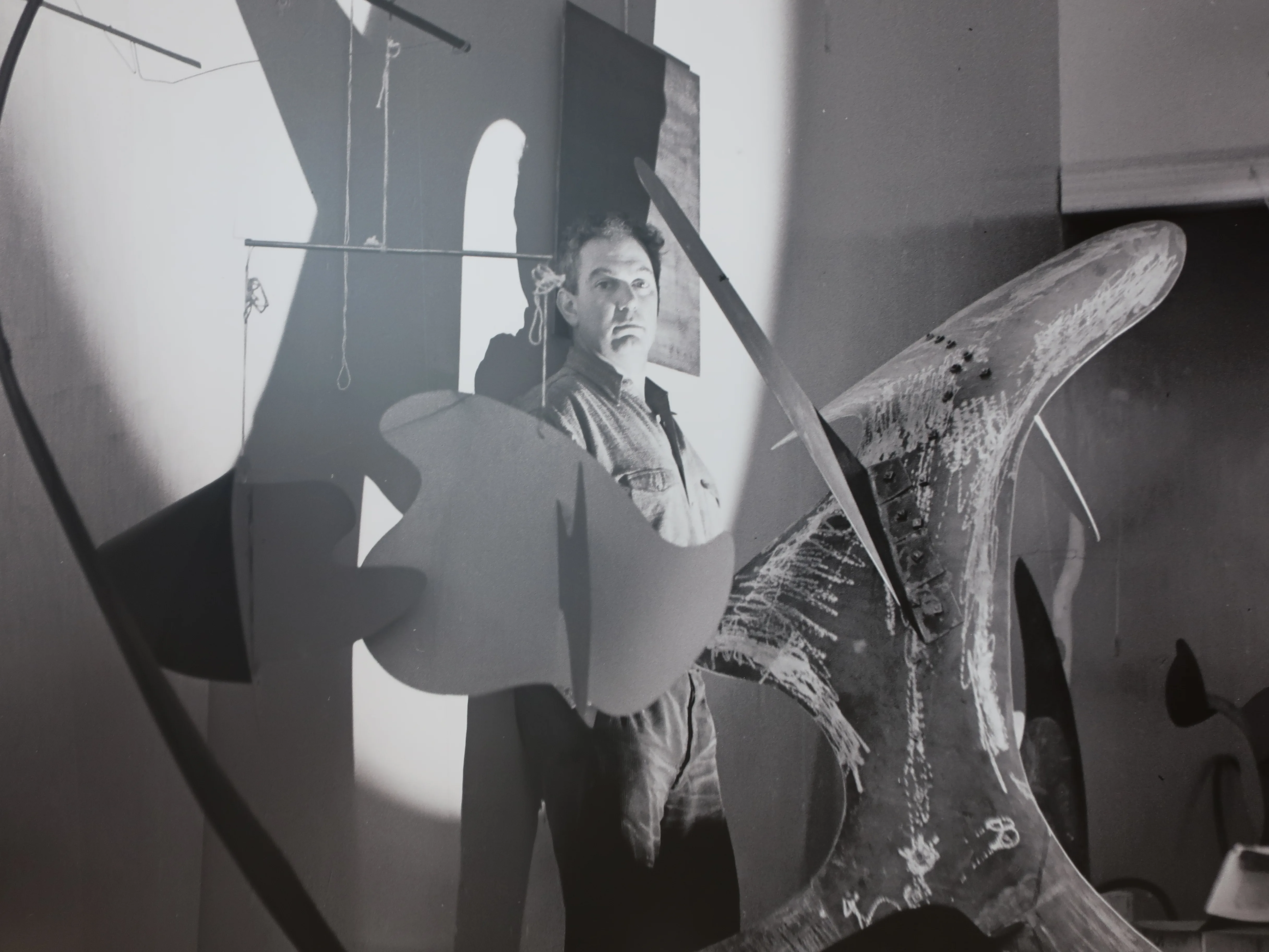 1898年、米ペンシルバニア州ローントンで、代々高名な彫刻家の家系に生まれたカルダーは、それまでの彫刻の概念になかった、軽やかに動く「モビール」の発明や、金属板の立体構成による抽象彫刻「スタビル」、絵画や版画、ジュエリーなど、幅広いジャンルで創作活動を展開した。