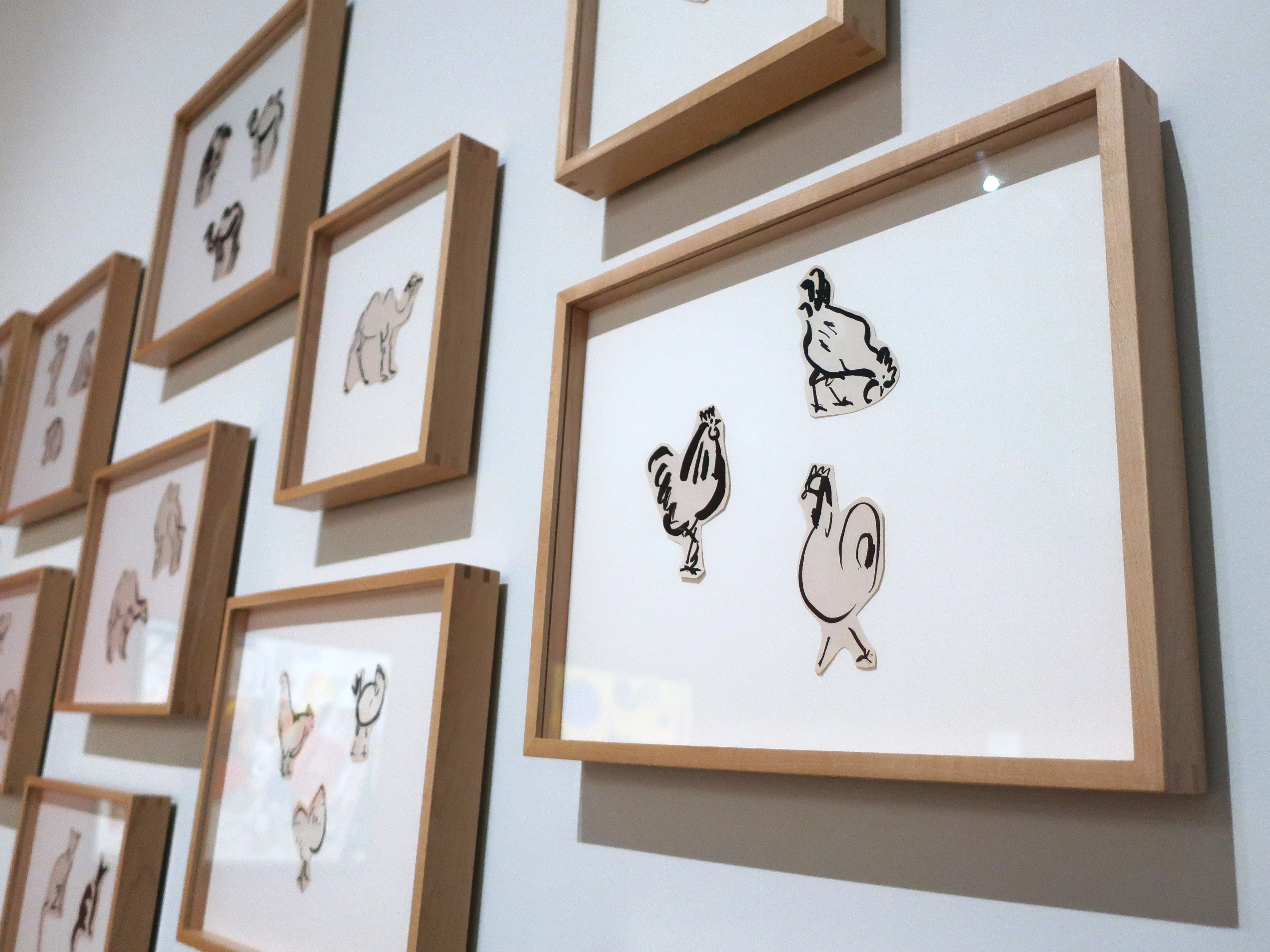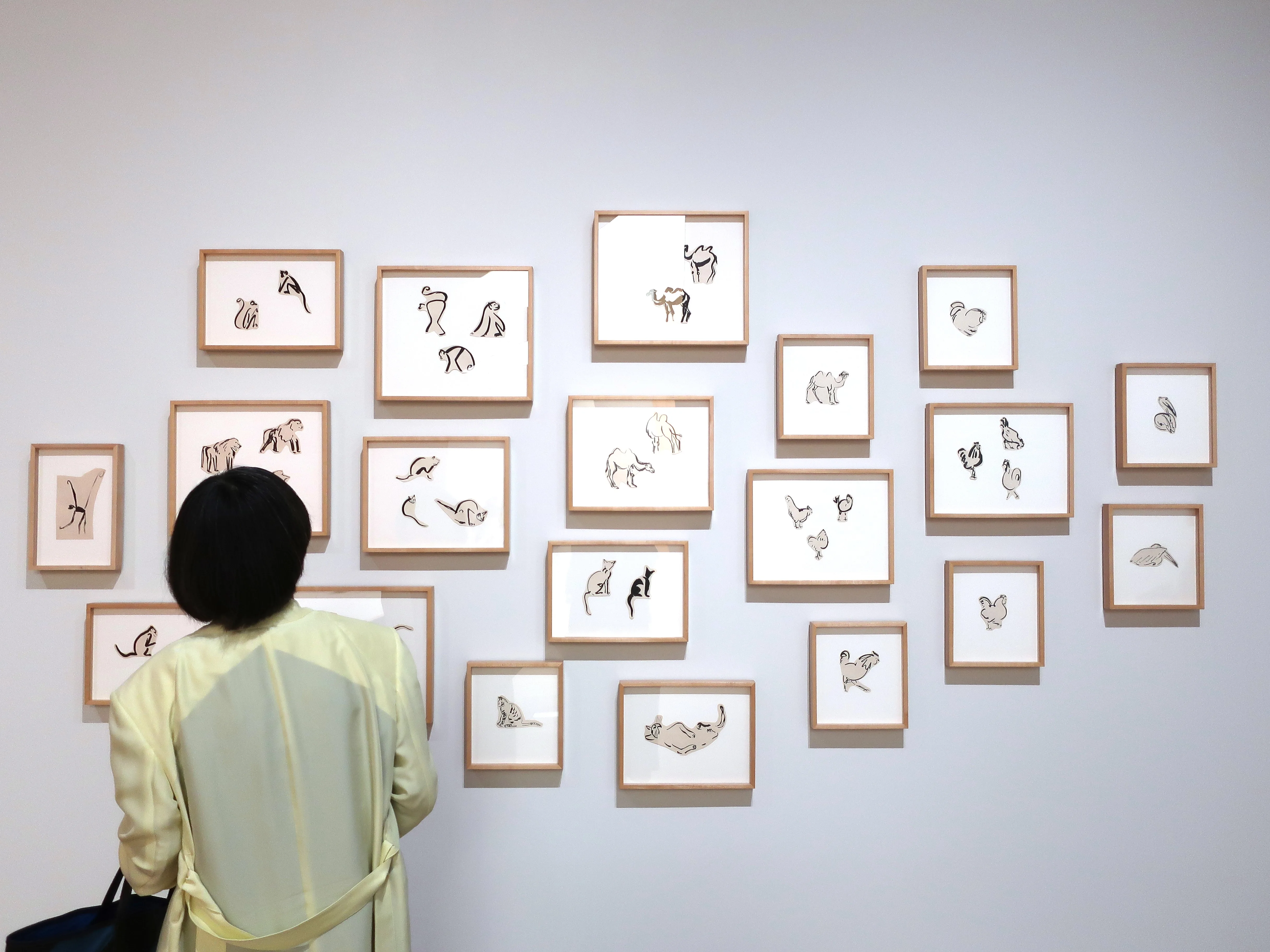 たとえば、彫刻や立体作品、メリハリの効いた原色の油彩画のイメージが強いカルダーだが、芸術家を目指して最初に学んだという素描の作品群は、シンプルな線で動物のポーズを無駄なく表現しており、非常に目を引く。
