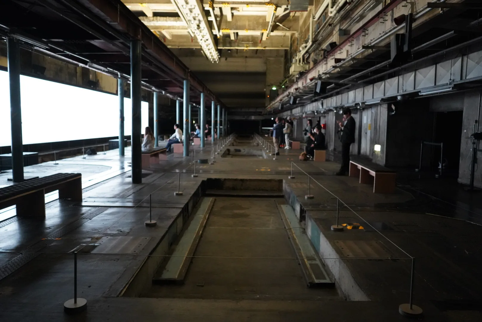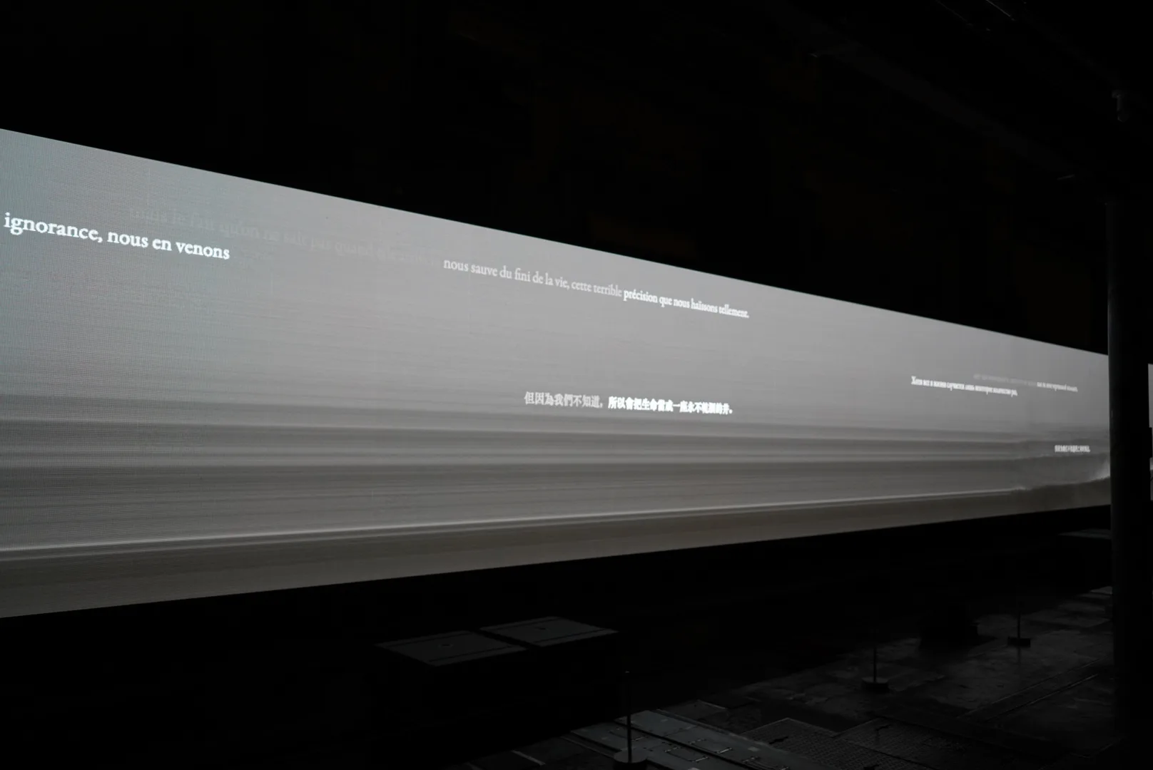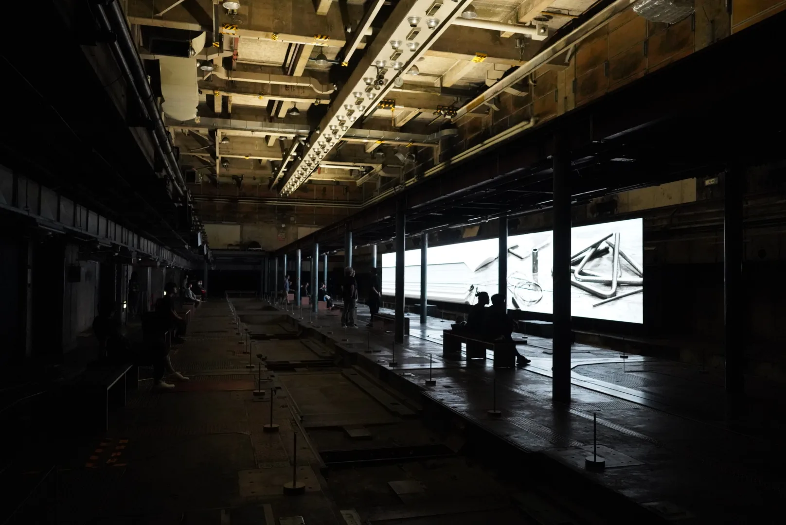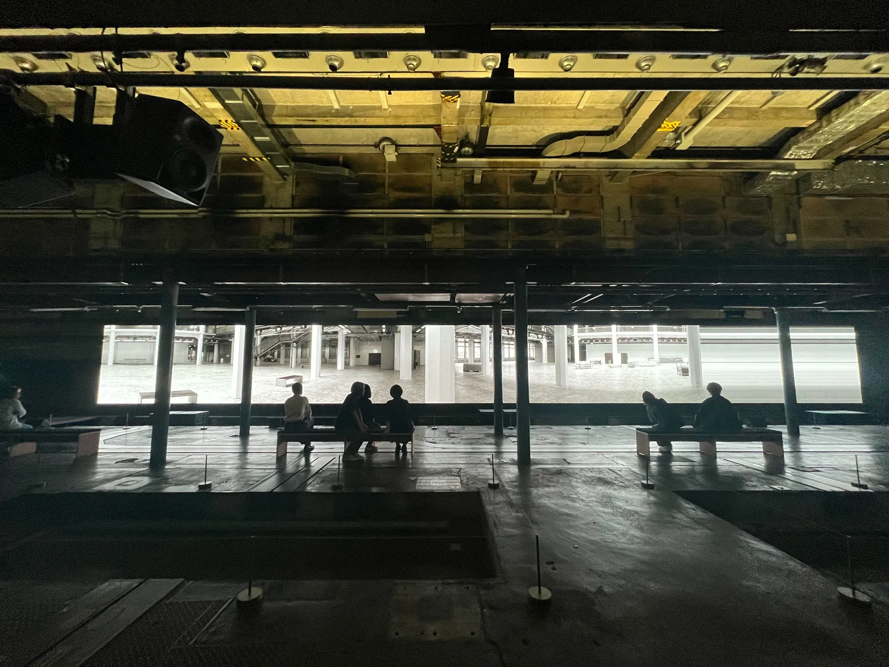 京都新聞ビルの地下は、2015年11月末まで稼働していた印刷工場跡地だ。通常は非公開の地下空間。天井高約10m、広さ約1000㎡という迫力のある空間にまず驚かされるだろう。こちらで展開されているのは、坂本龍一と高谷史郎のコラボレーション「async - immersion 2023」だ。