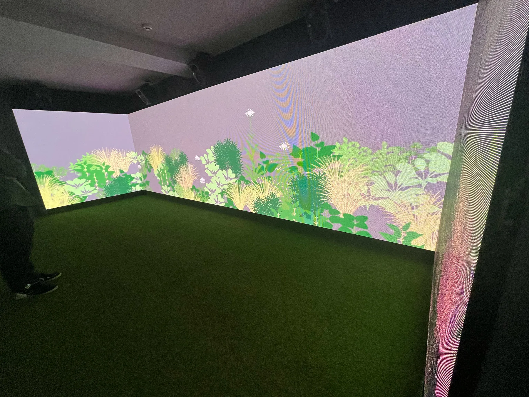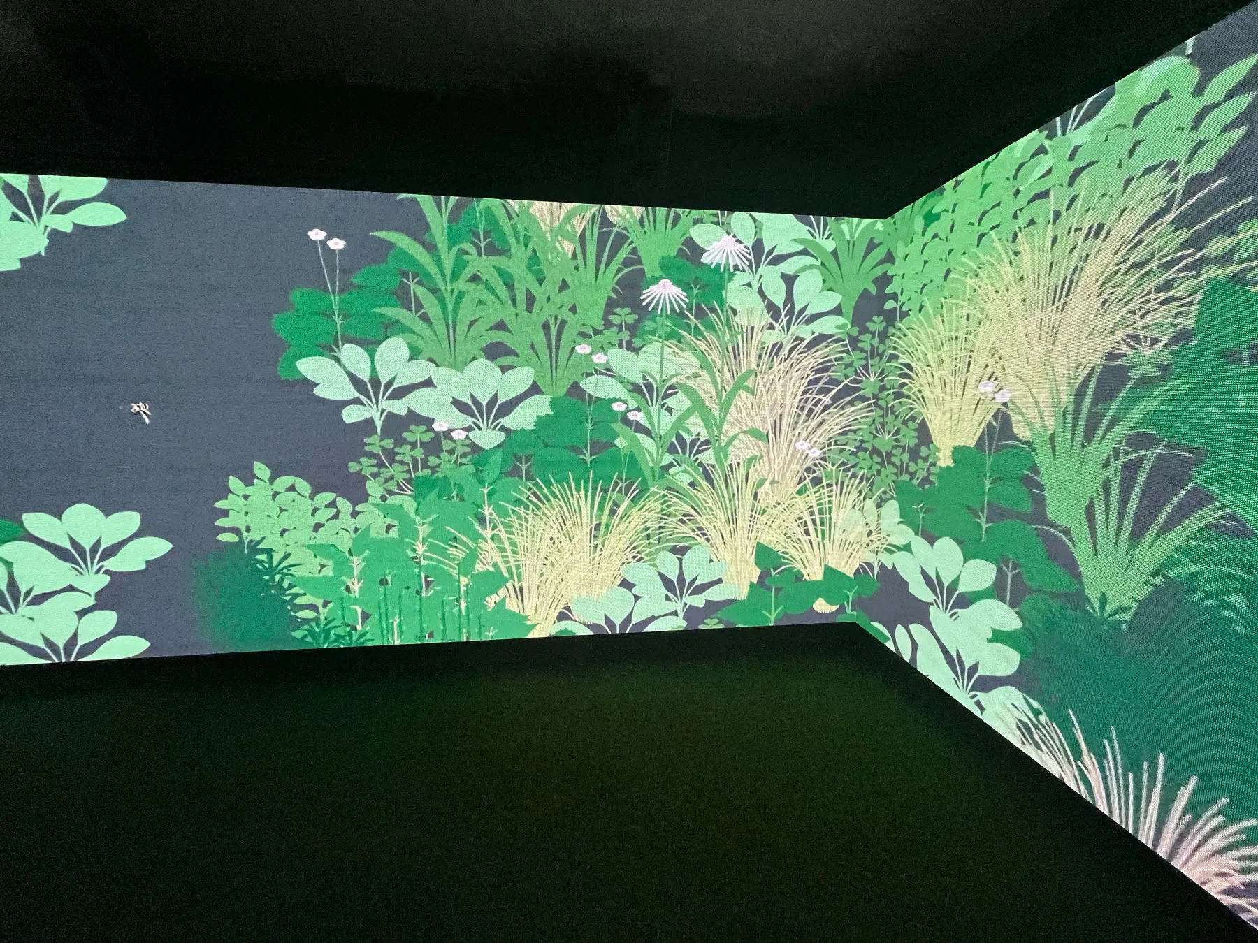 2階で見られるのは、コーネリアスによる『TOO PURE』だ。こちらも新アルバム『夢中夢 -Dream In Dream-』に収録されており、映像はデザイン・スタジオ groovisionsによるものだ。グラフィックやモーショングラフィックを得意とするgroovisionsらしく、リズミカルな和音に乗って立体スクリーンに映し出されているのは、植物や花たち。草花の成長と循環する自然の様子を表現したような鮮やかなアートワークには、ずっと見ていたくなるような晴れやかさを覚えた。