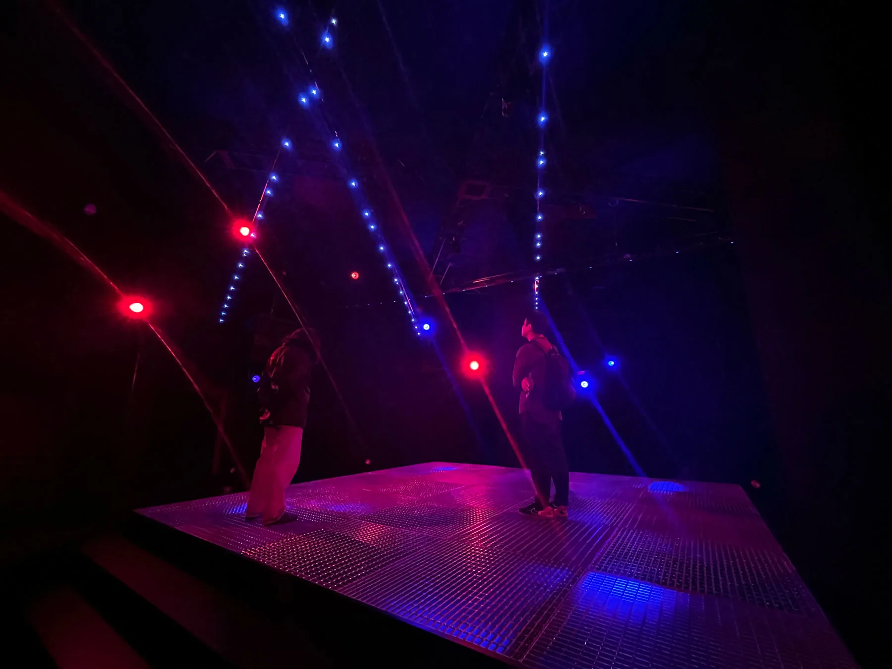 電子音や和音、単音など統一感のない音に囲まれ、自分の中でオリジナルに調和されていく。天井には、星が流れるように瞬く照明もシンクロしている。ステージから少し離れたところにあるベンチに座ると、ステージ上の現象を客観的にとらえることもできる。当事者にも、観客にもなれるという2度美味しい体験だ。
