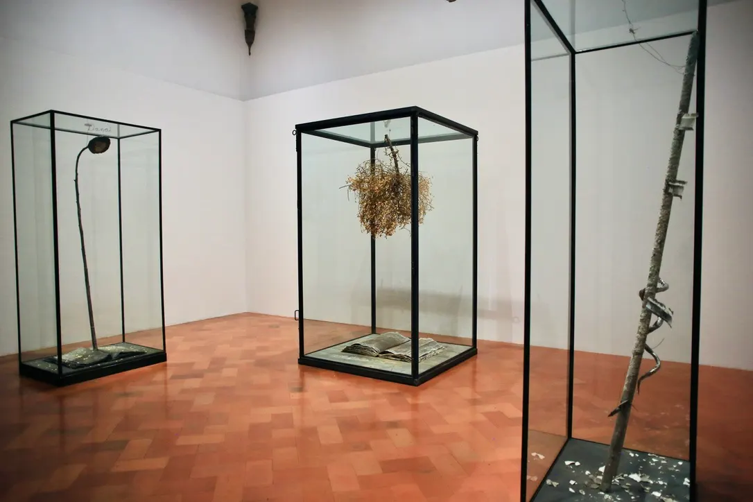 没入感のあるインスタレーションの先には、モノトーンを基調とした絵画と彫刻が。彫刻は、近代的なドレスをまとった女性のものと思しき胴体に対して、頭部がそれぞれ岩や樹に変身している強烈なビジュアルの作品群。ギリシャ神話において月桂樹へと変身してしまうダプネー、同神話で義憤を司るネメシス、聖母マリアの名前が冠されたこれらの彫刻は、古代の女性たちに捧げられたものだという。