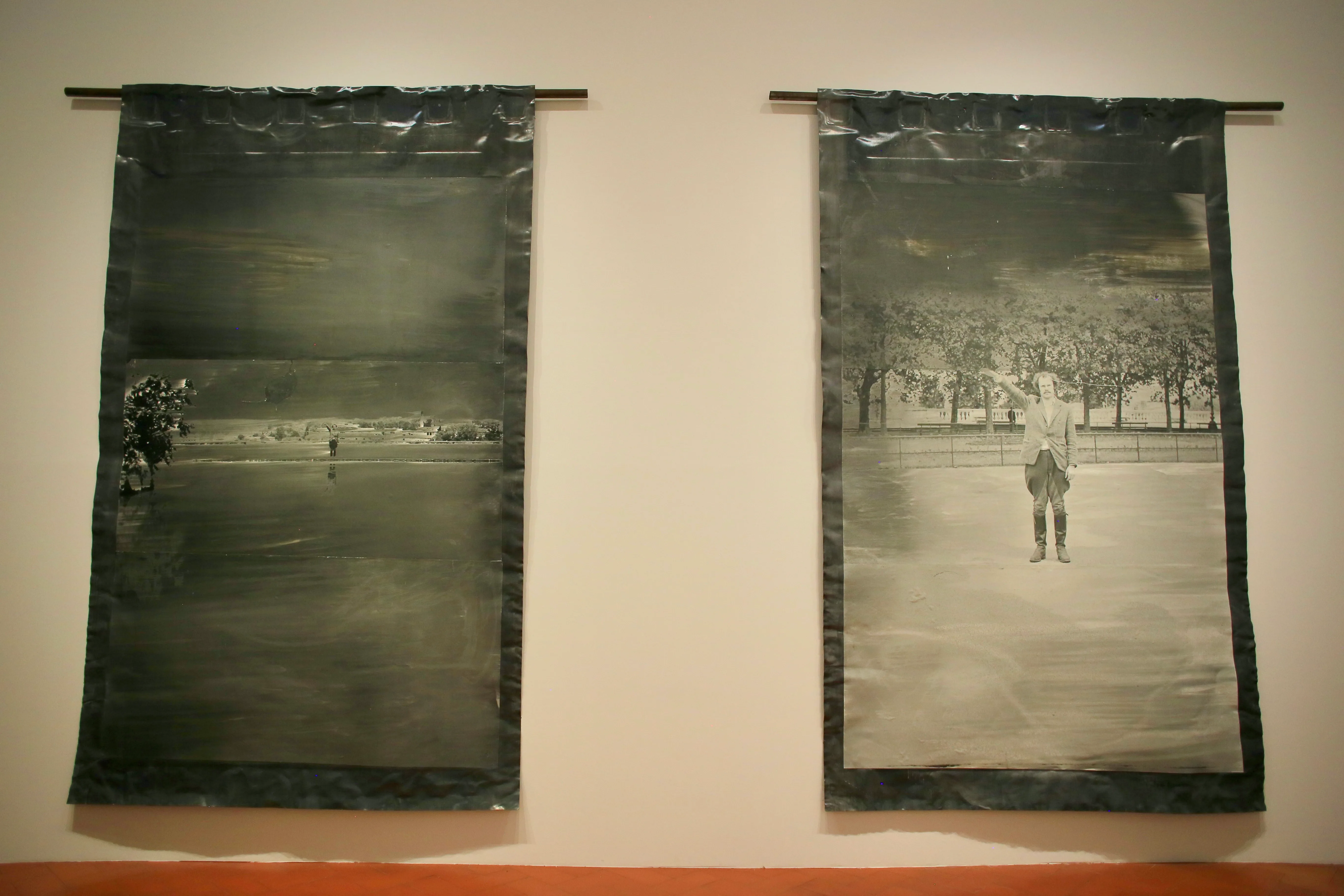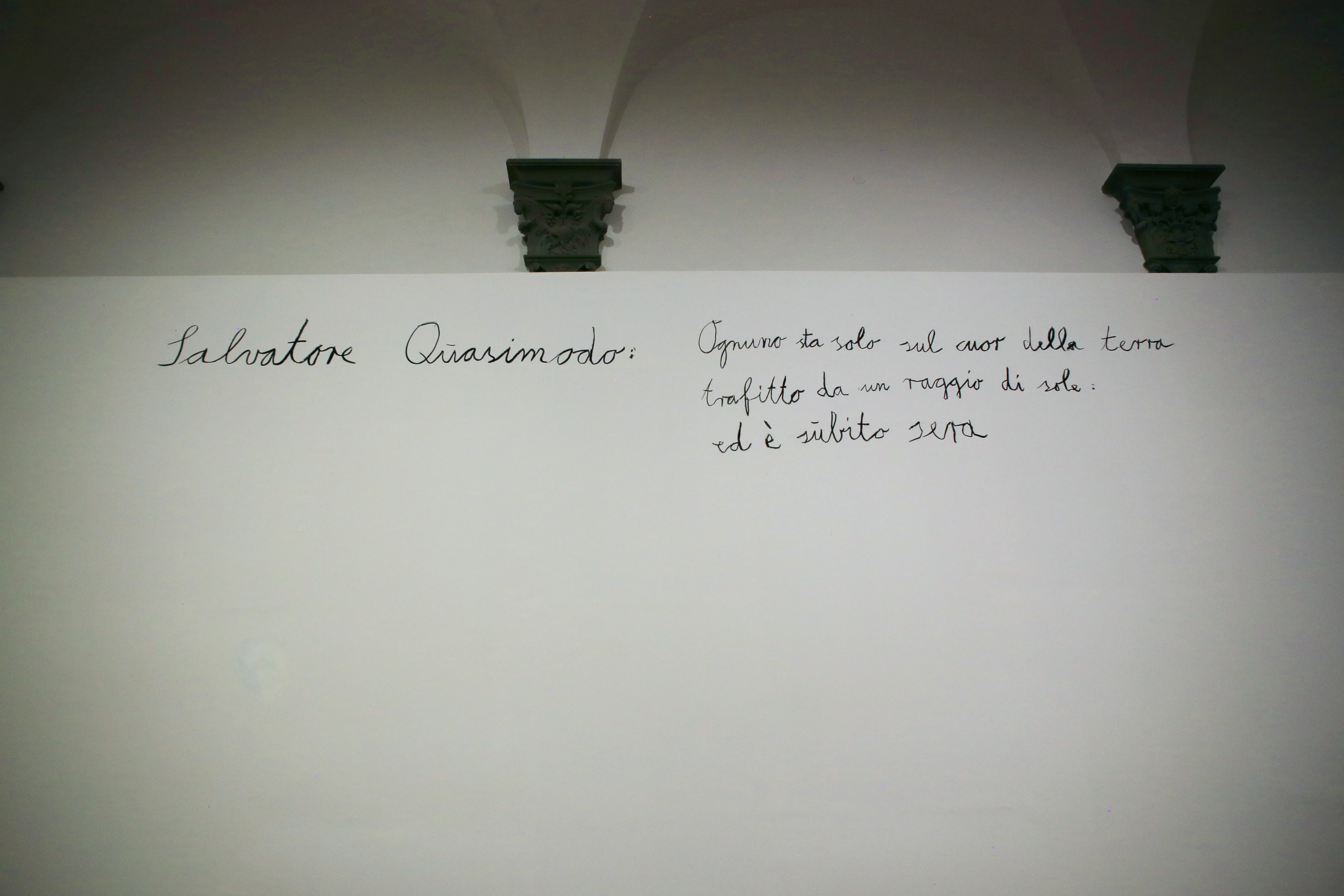 展覧会の最後を締めくくるのは、キーファーのアーティストとしての原点となった写真作品《Heroische Sinnbilder》(2009)。「占領」を意味するキーファーの初の個展「Besetzungen」(1969)で出展された「英雄的シンボル」を意味するこの作品は、キーファー自身が、彼の父親のドイツ国防軍将校の軍服を身にまとい、ナチス式の敬礼のポーズをとるというもの。初個展から半世紀後に再制作された本作では、イタリアやフランスなど、ヨーロッパ各所で撮影されている。壁には、直筆で書かれたイタリアを代表する詩人クァジーモドの詩の一節が。「Ed è subito sera そしてすぐに日が暮れる」のもと、展示は幕を閉じる。