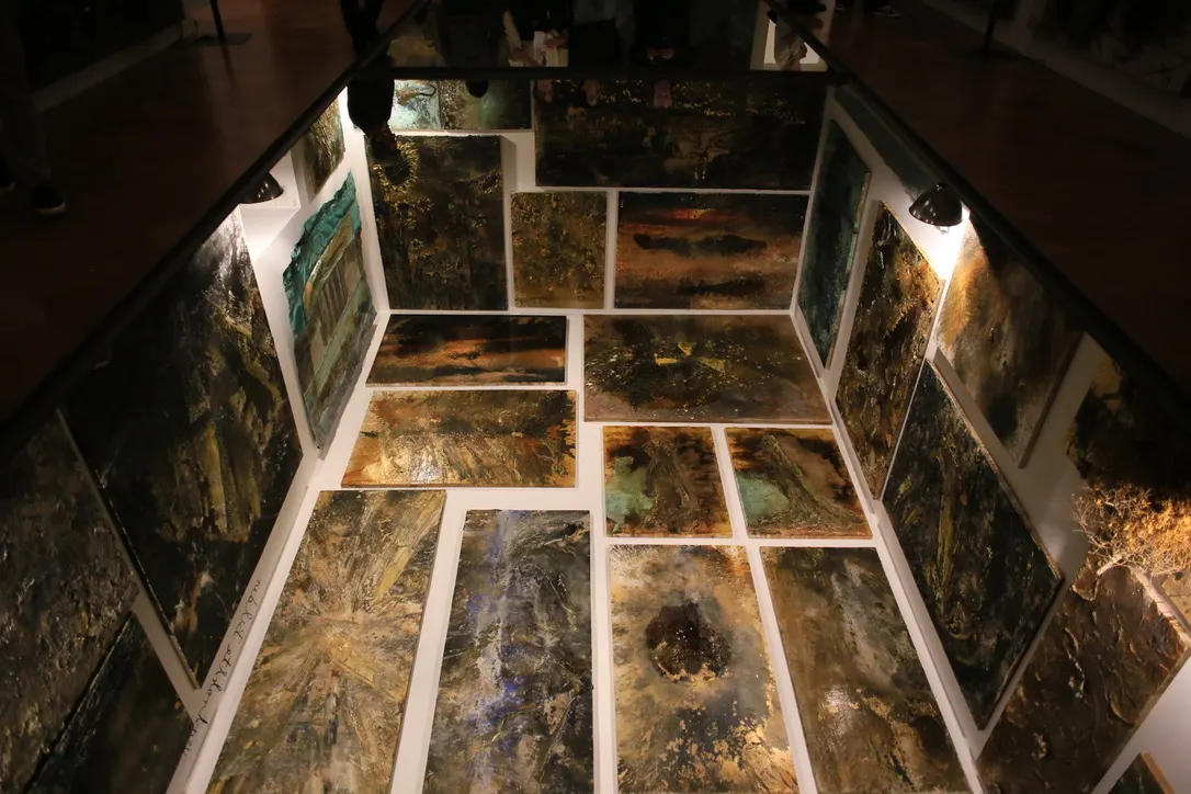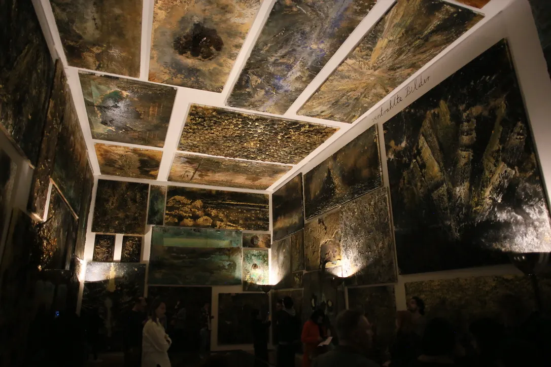 続く展示空間を覆うのは、過去40年以上にわたる絵画作品が天井と壁面に所狭しと並ぶインスタレーション《Verstrahlte Bilder》(1983-2023)。これらの絵画は、制作後に電解質を含んだ水槽に浸され、放射線によって変色しているという。天井の絵画は、部屋の中央に配された大きなテーブルのような鏡を通しても見ることができる。