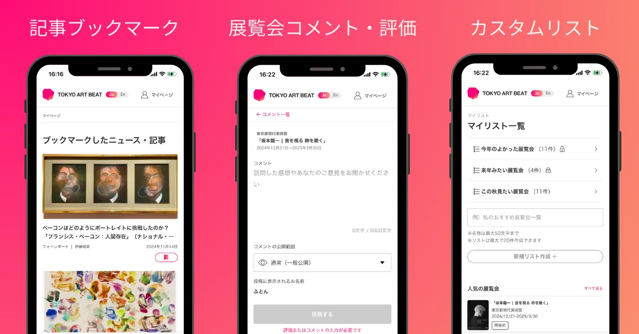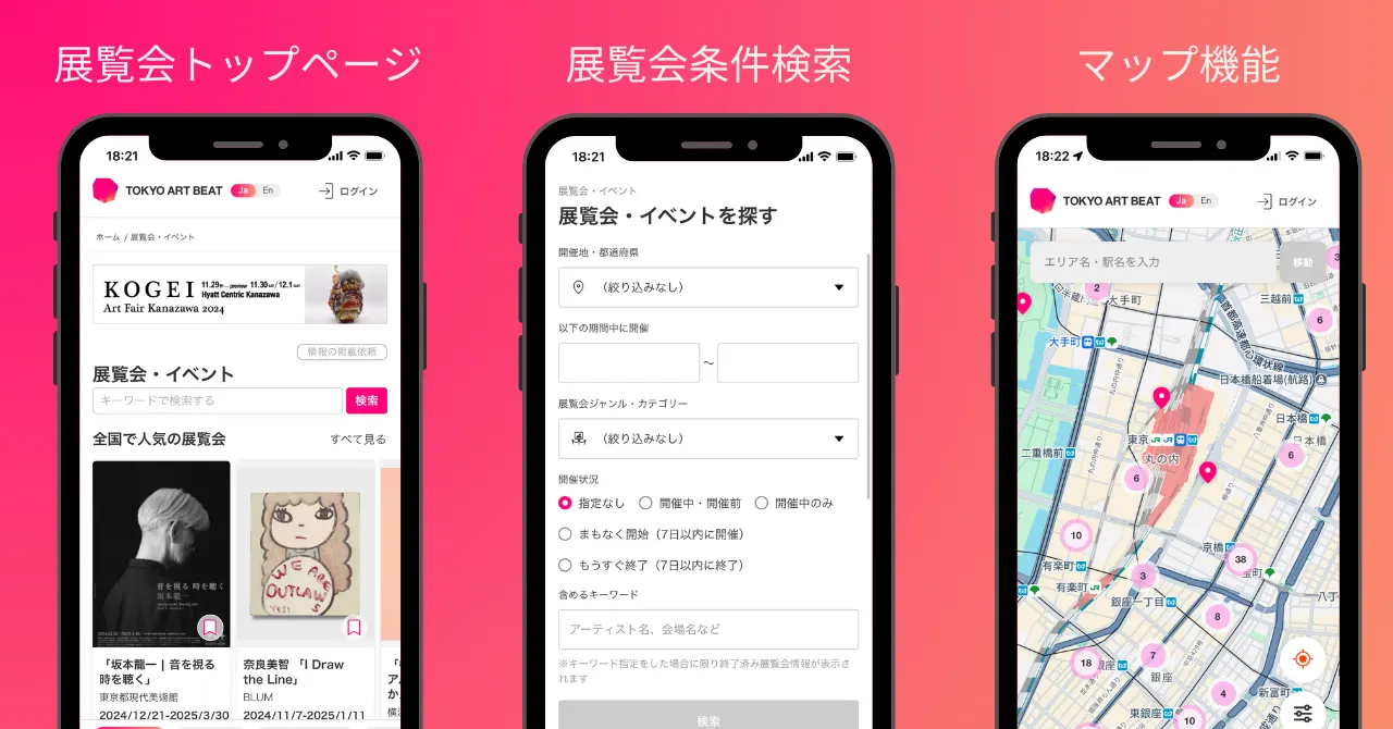 「Tokyo Art Beat」アプリは2009年の発売以来、アート・デザインの展覧会や最新のアートニュースを中心に、マップ機能、展覧会の割引機能「ミューぽん」など様々なコンテンツを提供しています。