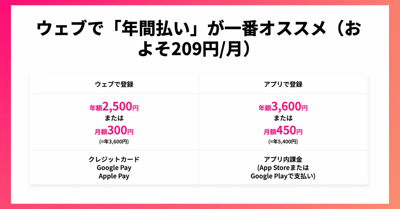 ※ウェブ版・アプリ版ではお支払い方法と料金が異なります。