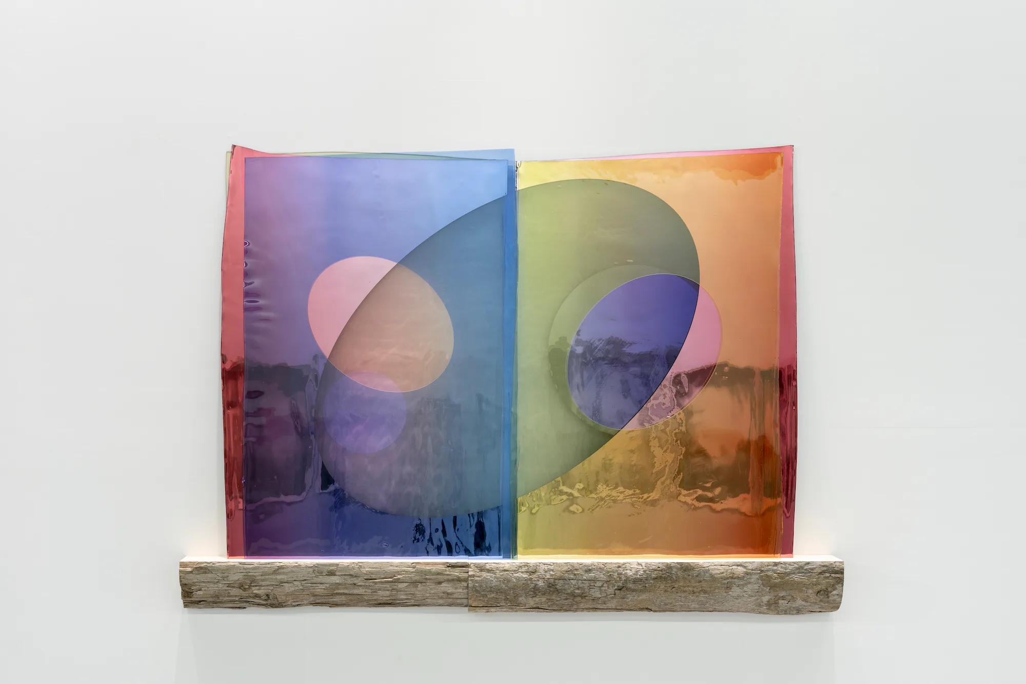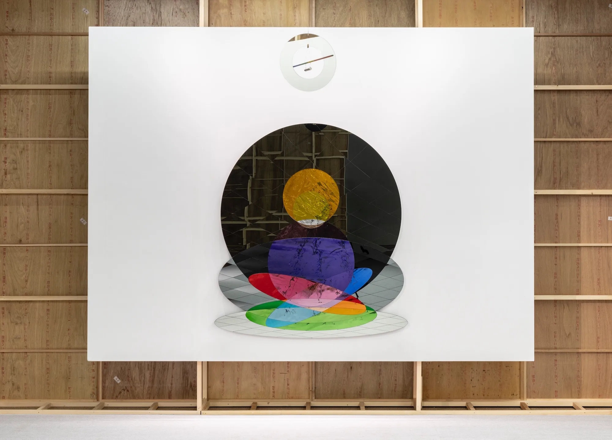 端から連作を見終えた地点にあるのが、《Mirror my groundedness in me》。このほかの、彩色されたガラスなどで構成した平面、絵画作品にも、円形や楕円形のフォルムが重なっている。それは、枯山水庭園の砂紋の広がりのように、見る者を思索に誘い、自己を見つめ直す空間を提供しているようだ。頭上には、ドーナツ型の鏡の中を通過する矢のオブジェ《Your mutual appreciation compass》が展示されている。