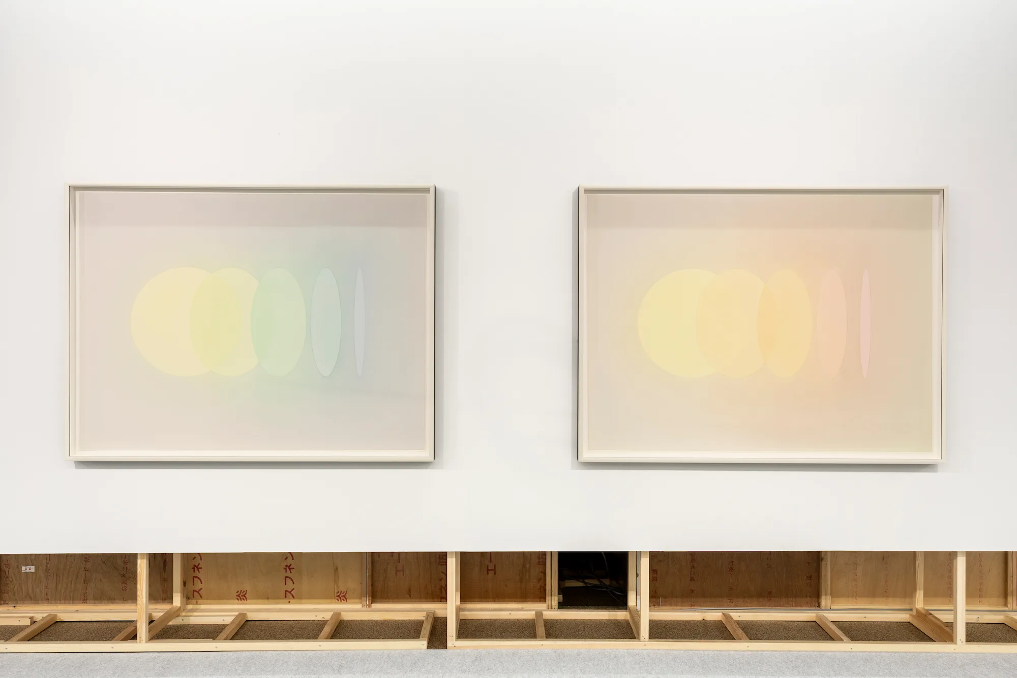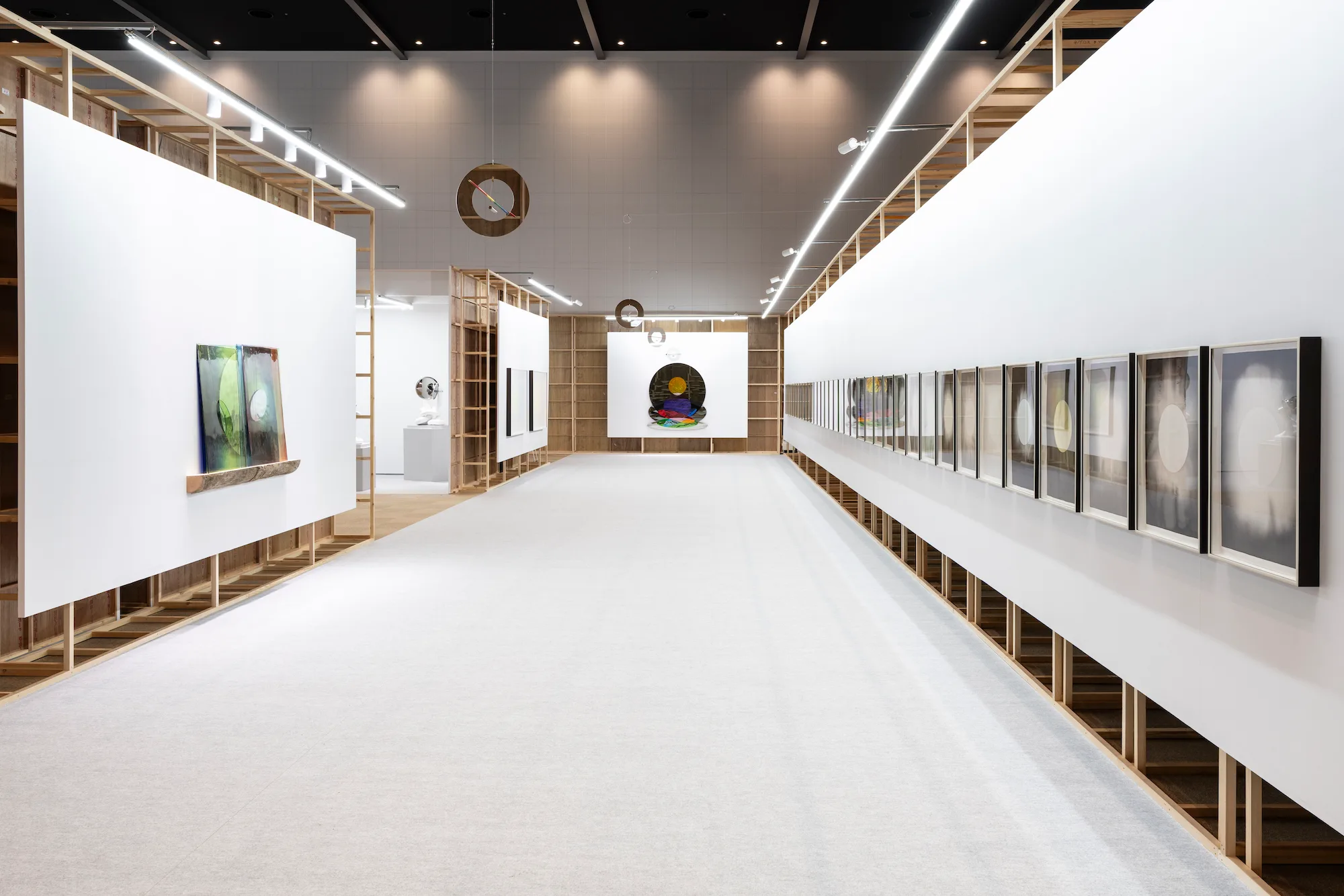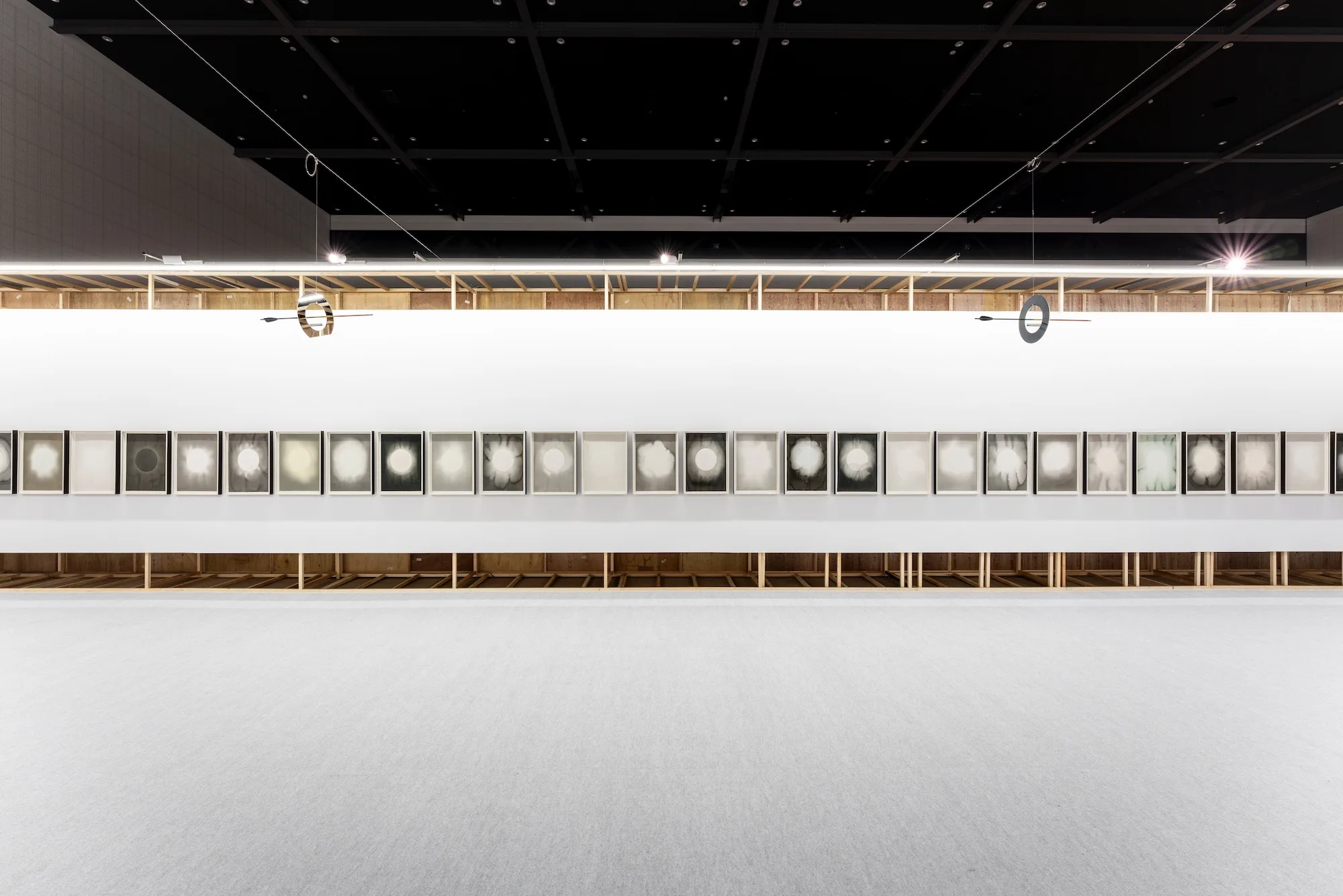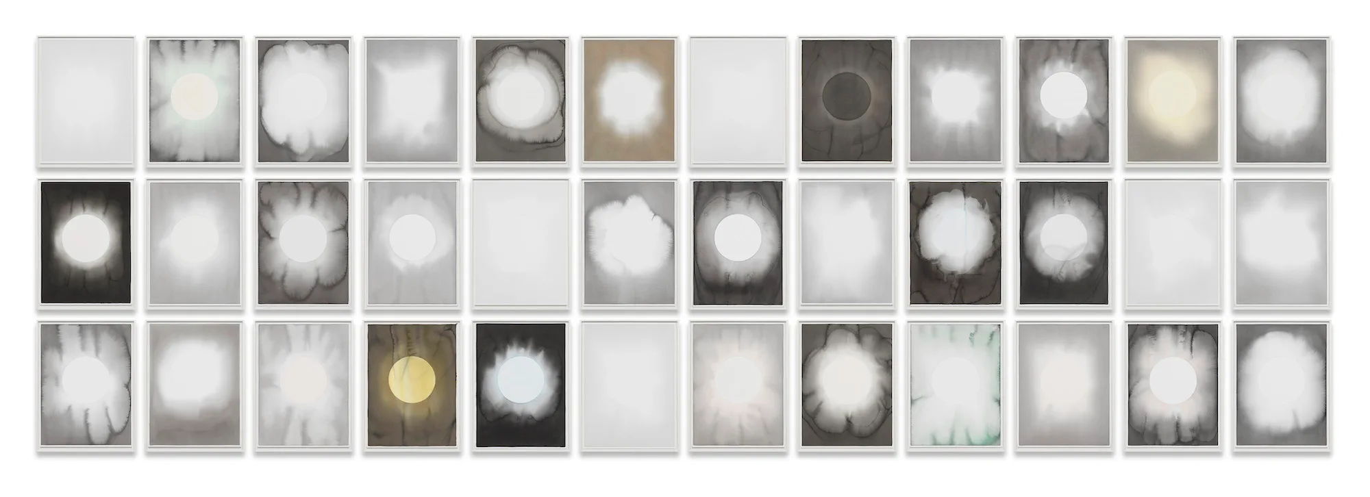 ブースには、長い壁に36点の連作《Unforgetting solar exposure》が一列に並んでいる。禅画の円相のように円が真っ白に抜かれ、かすかな色彩が添えられた水墨画だ。それが水平に並ぶ様子が、あたかも黒い水平線のようで、フェアの喧騒のなかに静謐な空間を生み出していた。