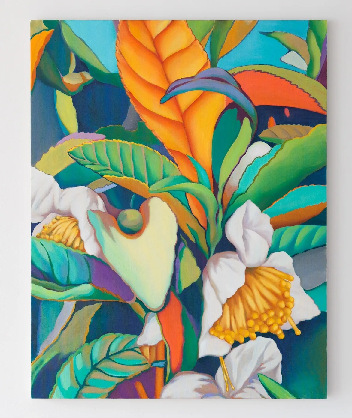 茶の木はツバキ科で、年に1度、開花する。古来から和歌にも詠まれ、愛でられてきた可憐な花だが、花が満開になってしまうとお茶の味や風味が落ちるため、茶畑では疎まれる存在。茶葉を育むために、花は早々に摘み取られてしまうそうだ。戸田は本展で、この茶花の絵を10点制作。モチーフは同じでありながら、絵には多様なバリエーションが展開された。色彩は、深い緑の落ち着いたトーンから極彩色まで幅広く、描写も具象的なタッチから抽象的な表現まで、様々に描かれている。茶の花の特徴である、ふさふさした大きな雌しべと白い花びらが、1点1点のキャンバスの上で、鮮やかにメタモルフォーゼをはたしているようだ。