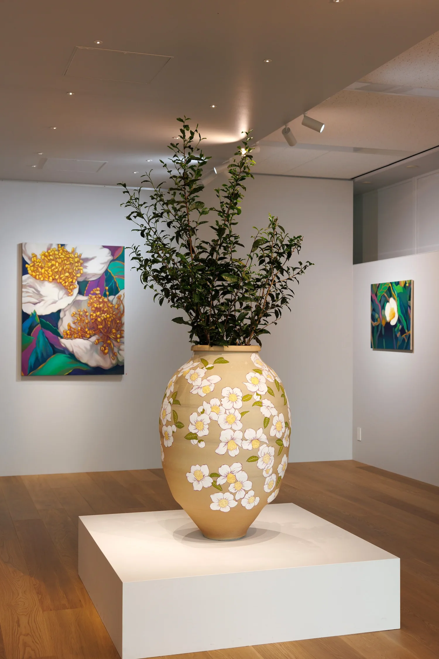 壺にアクリルでペインティングをして、生の茶の木を生けたインスタレーション3点も出品。壺にはやはり茶の花が描かれているが、こちらは油彩の作品に比べると軽やかな線描で、花は壺の曲面に躍動的に描かれている。なかでも存在感を放つのは、1メートルを超える巨大な壺だ。「この壺が、今回のとても重要なテーマのひとつなんです」と戸田。底がすぼまっている独特の形の壺は、戸田を今回の展示へと導いた、不思議な縁の証言者でもある。