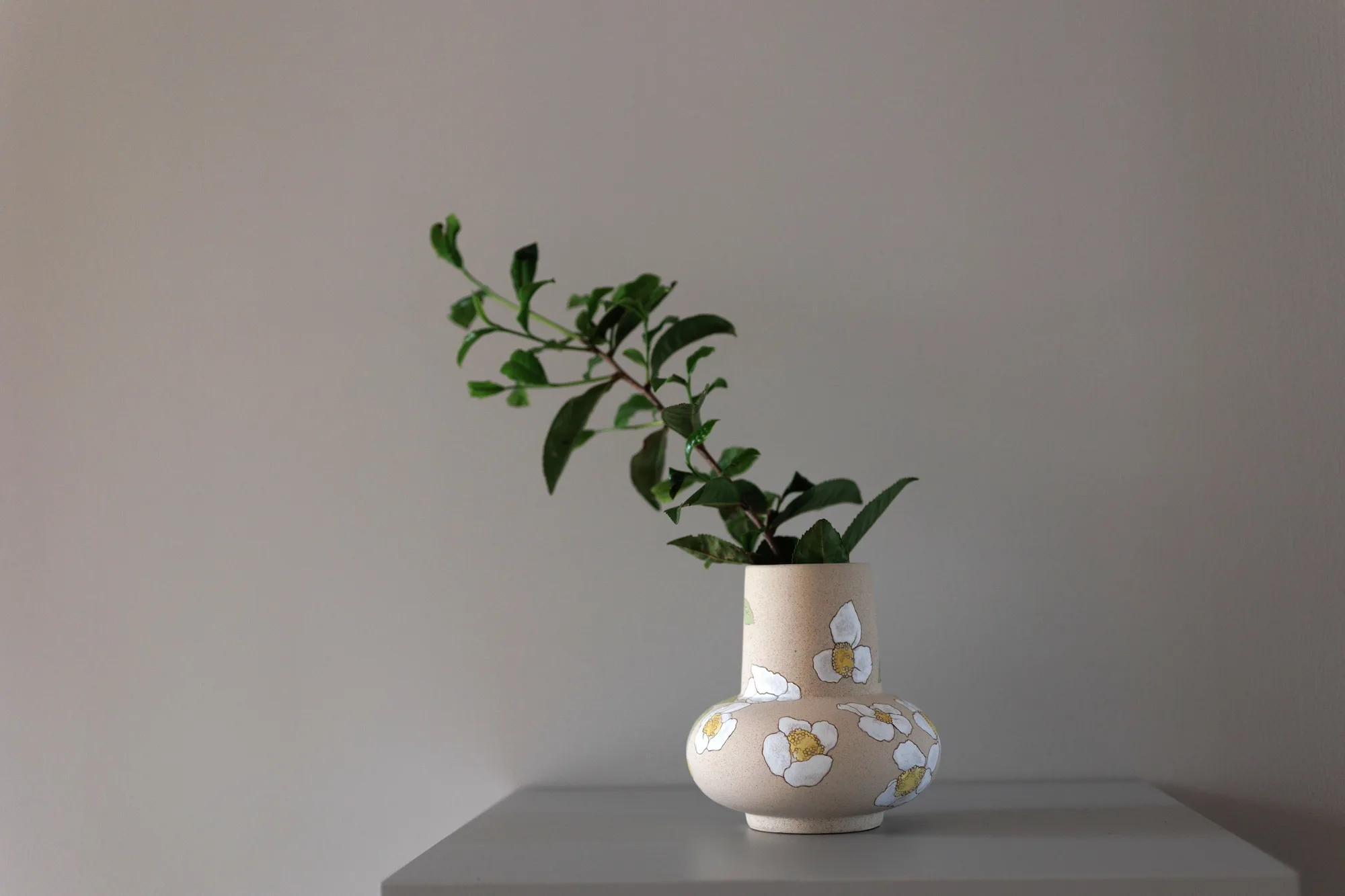こうして、お茶に深い縁のある寺から譲り受けた壺に茶花を描き、茶の木を生けるというインスタレーションが構想された。すると、