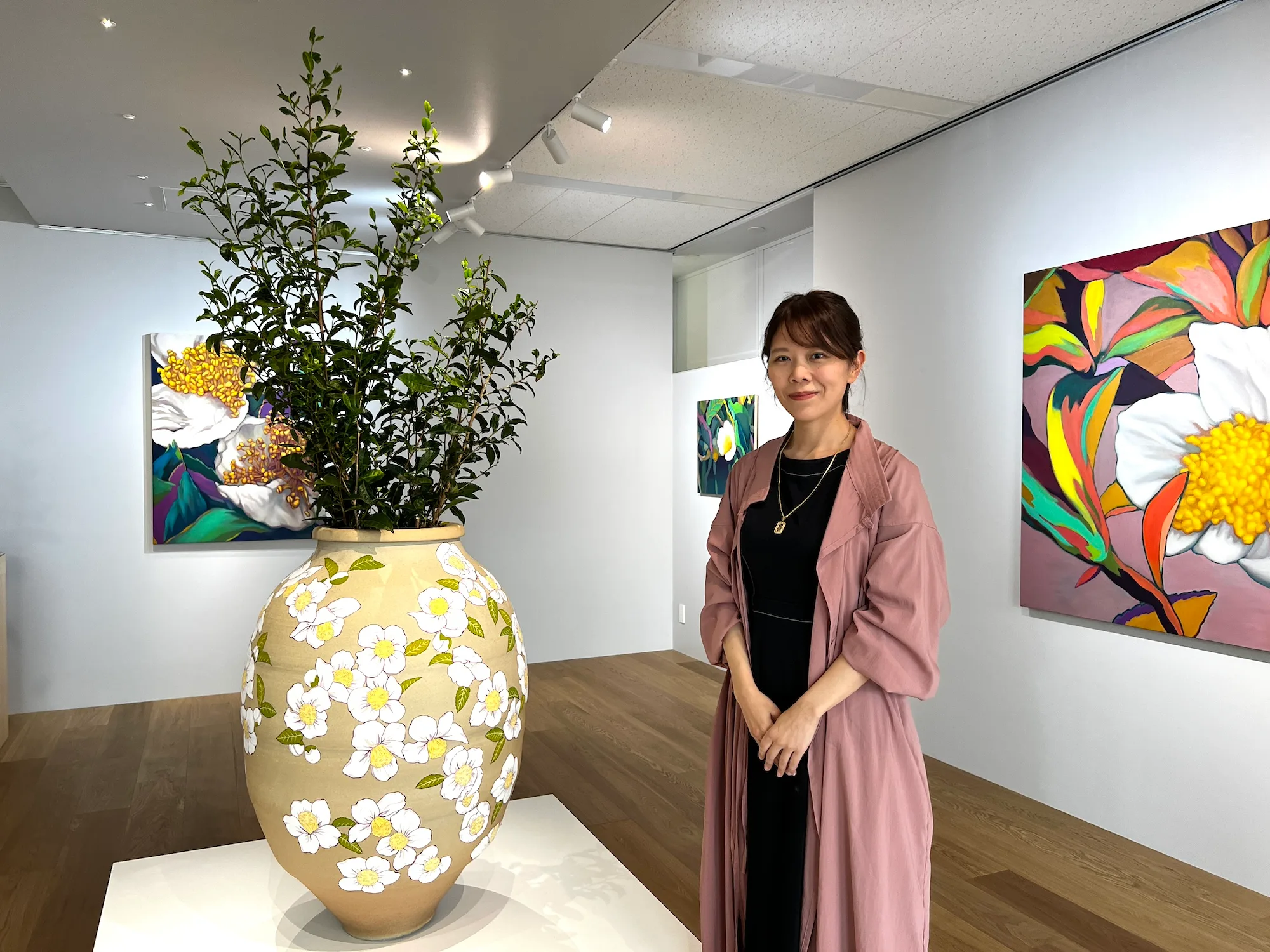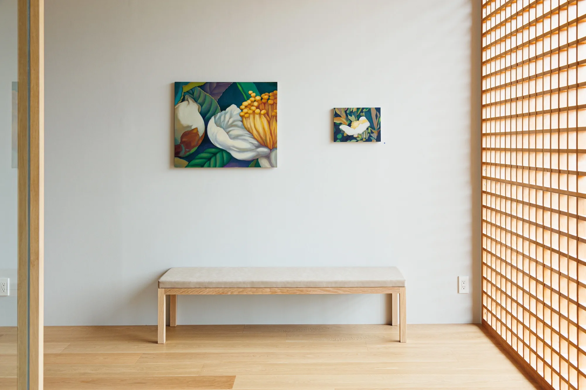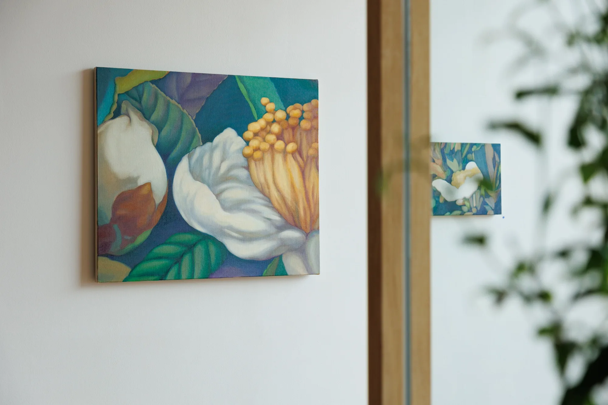 オープニングの展覧会として開催されたのは、女性アーティスト、戸田沙也加による油彩画とインスタレーション「茶花礼賛」だ。