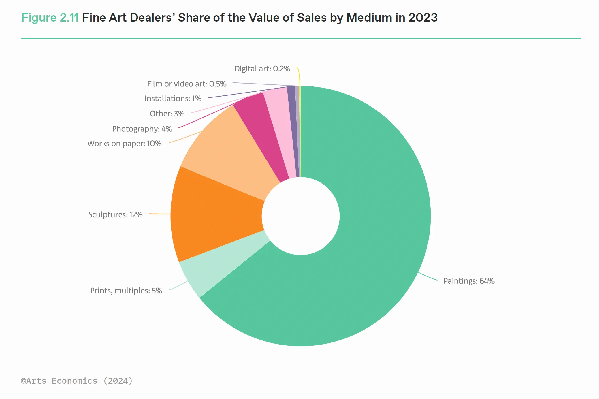 実際、下のグラフを参照してみても、美的価値がわかりやすい絵画や彫刻、ドローイングなど作品にシェアが集中。コロナ禍で売上が増加していたデジタルアートやヴィデオアート、そしてNFTアートも軒並み売上が下降している。