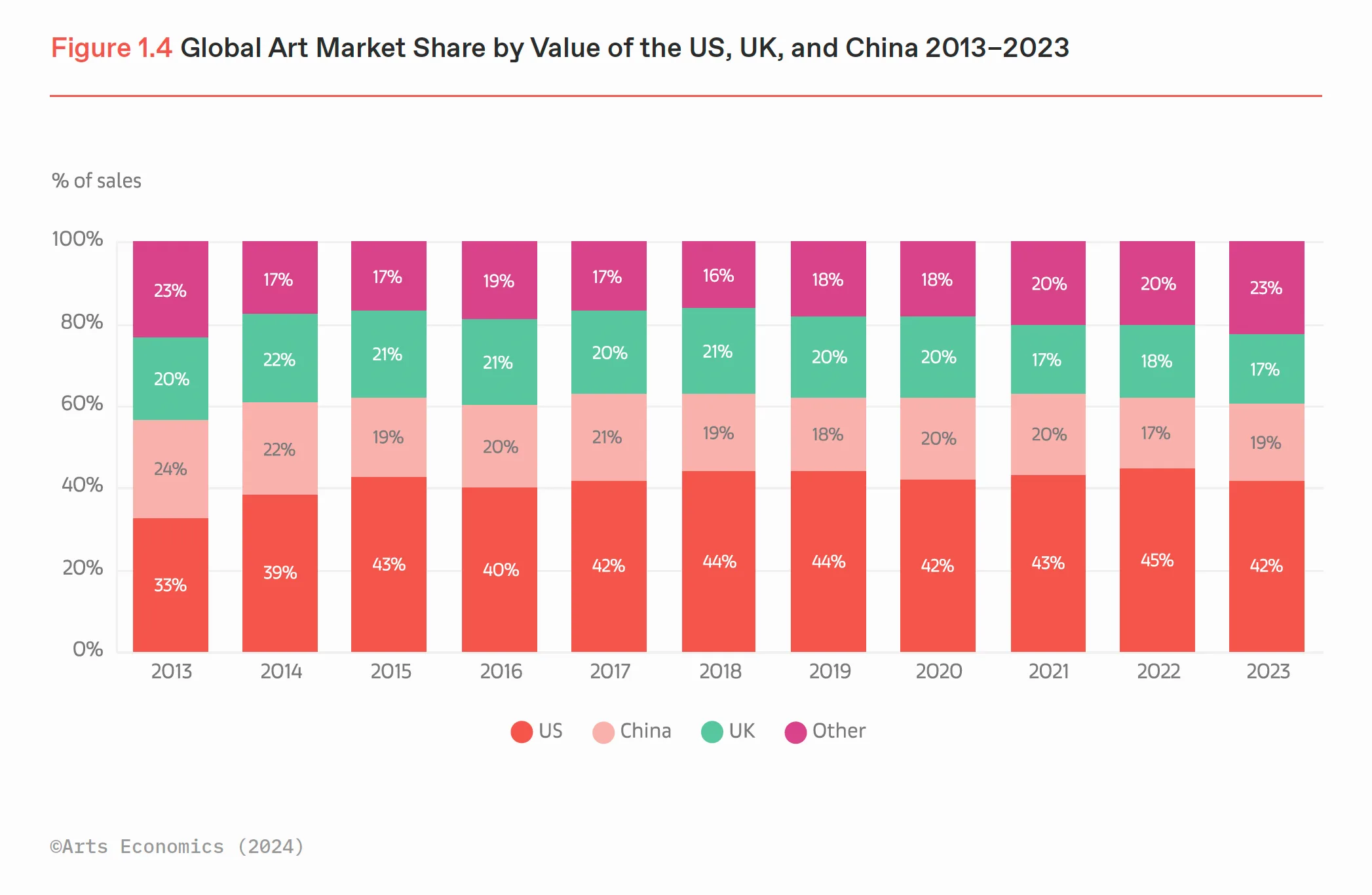 このような世界的な市場の鈍化に反し、中国は前年度比9%の売上増加を記録。市場シェア2位の座を英国から取り戻した。都市封鎖の影響で中止になった22年秋オークションの在庫がすべて売却されるなど、上半期の反動需要が大きな影響を与えたと考えられている。また、好調かにみえた中国市場も下半期の売上では減少を記録しており、現在も続く慢性的な不動産不況と経済成長の停滞の影響は大きいといえるだろう。