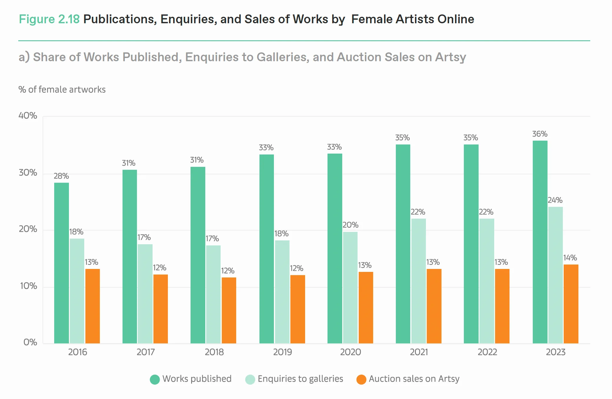 また、本レポートでは女性アーティスト作品の売上についても言及がなされた。興味深いことに、女性アーティストの取扱数と売上の数値には緩やかな相関関係があり、女性アーティストの取り扱い割合が全体の半分以下のギャラリーで売上が4%減少しているのに対し、取り扱いが4分の3を超えるギャラリーでは比較的売上が安定している。