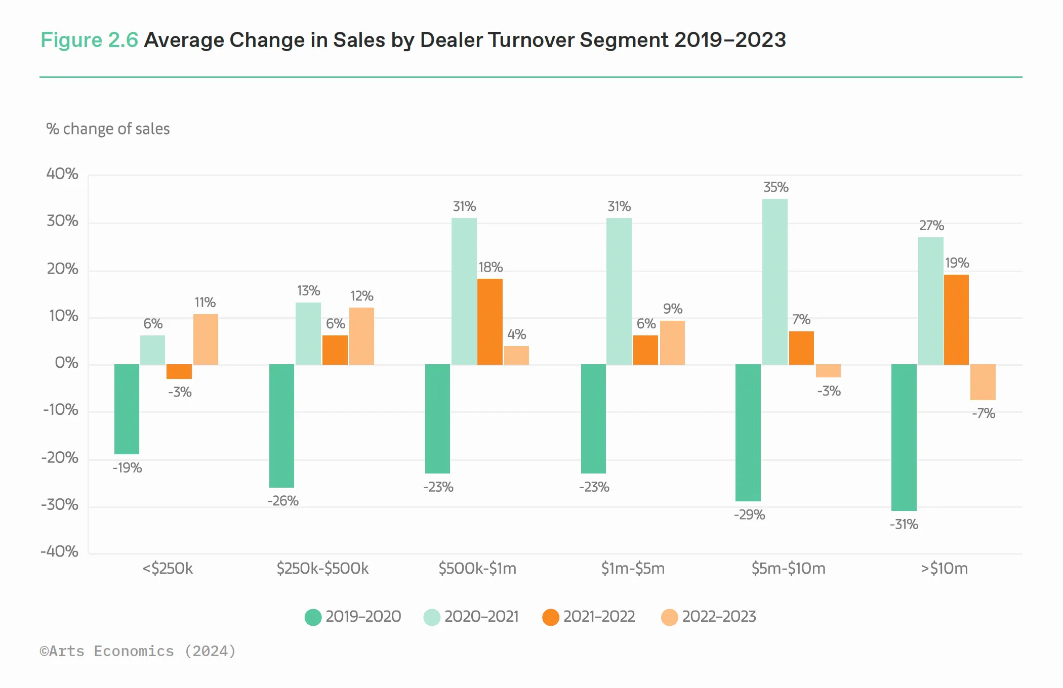 アートマーケットにおける2021年、22年の力強い回復は、高価格帯での好調が大きな要因であったが、23年はディーラー、オークションハウスの両部門でトレンドが一変した。売上規模別では、大規模ディーラーの総売上が中・小規模のディーラーに比べて大幅に減少。売上高が1,000万ドル以上のトップディーラーは平均で7%減を記録したいっぽうで、売上高が50万ドル未満のディーラーが11%増と売上をもっとも増やした。