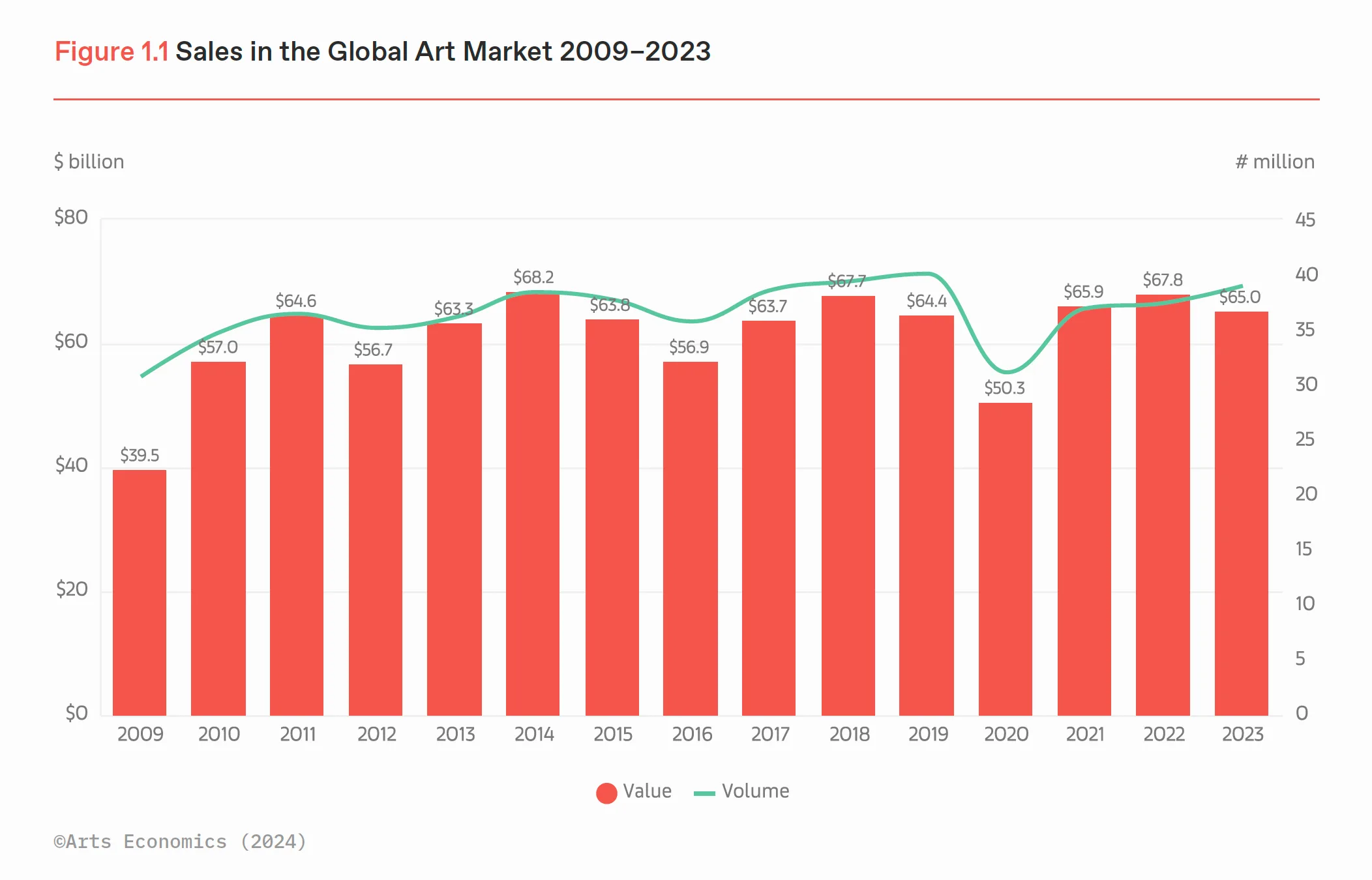 「The Art Market 2024」では、2023年のアートマーケットの総売上を推定650億ドル(前年度比4%減)と発表。コロナパンデミックによって一時低迷したアートマーケットは、前の2年間で強い回復力を見せていたが、23年はコロナ以降初めての下降を記録する結果となった。