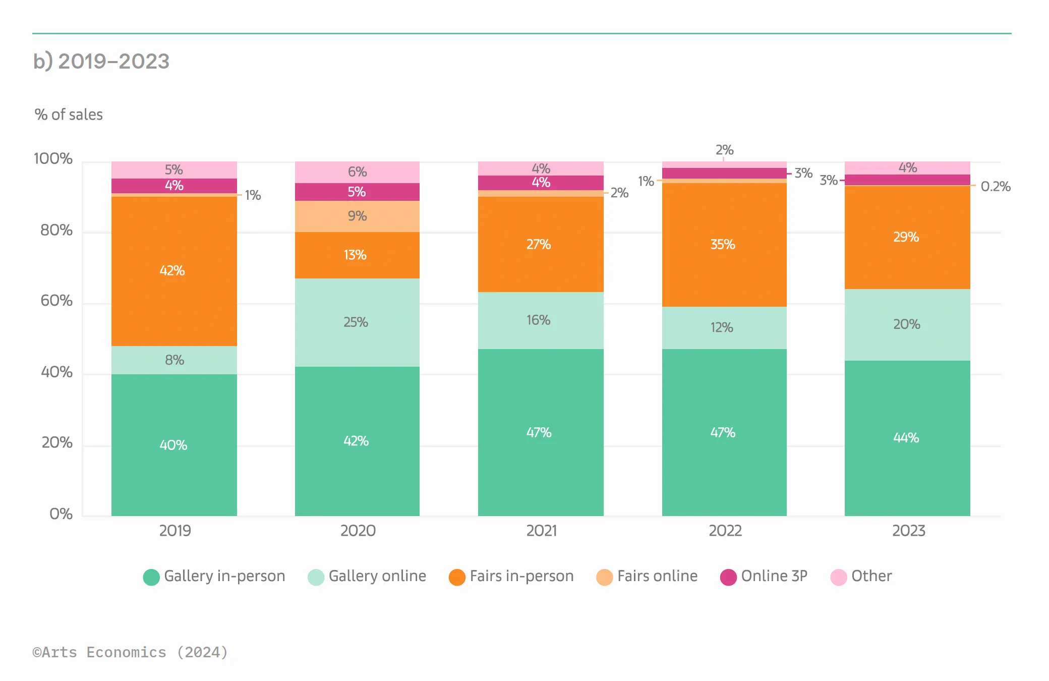 2023年、ディーラーではギャラリー独自の販売機会や導線づくりが売上を左右する大きな要因のひとつとなっていた。ギャラリー、ディーラーの直接取引の割合(オンライン含む)は、2019年の48%から64%にまで増加。ここ2年間で大きく普及率を上げたオンライン販売においても、ギャラリー独自のオンラインチャンネルを中心に、順調に数字を伸ばしている。
