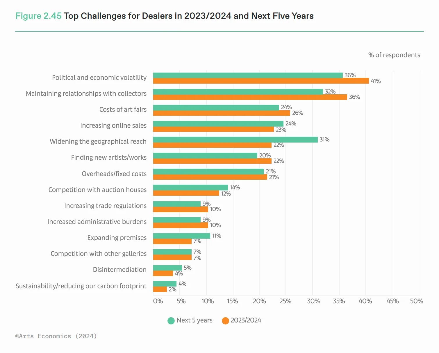 「The Art Market 2024」がディーラーに行った、当面の懸念事項についての聞き取り調査では、1位が不安定な社会情勢とその影響、2位が既存顧客との関係性維持、3位がアートフェア参加にかかる諸費用の高騰という結果になり「ゆるやかに悪くなる社会」への不安は大きいといえる。また、24年に売上の増加を予測すると答えたディーラーは前年度45%に対して36%と減少、約半数の48%が23年から変化なしと予測した。
