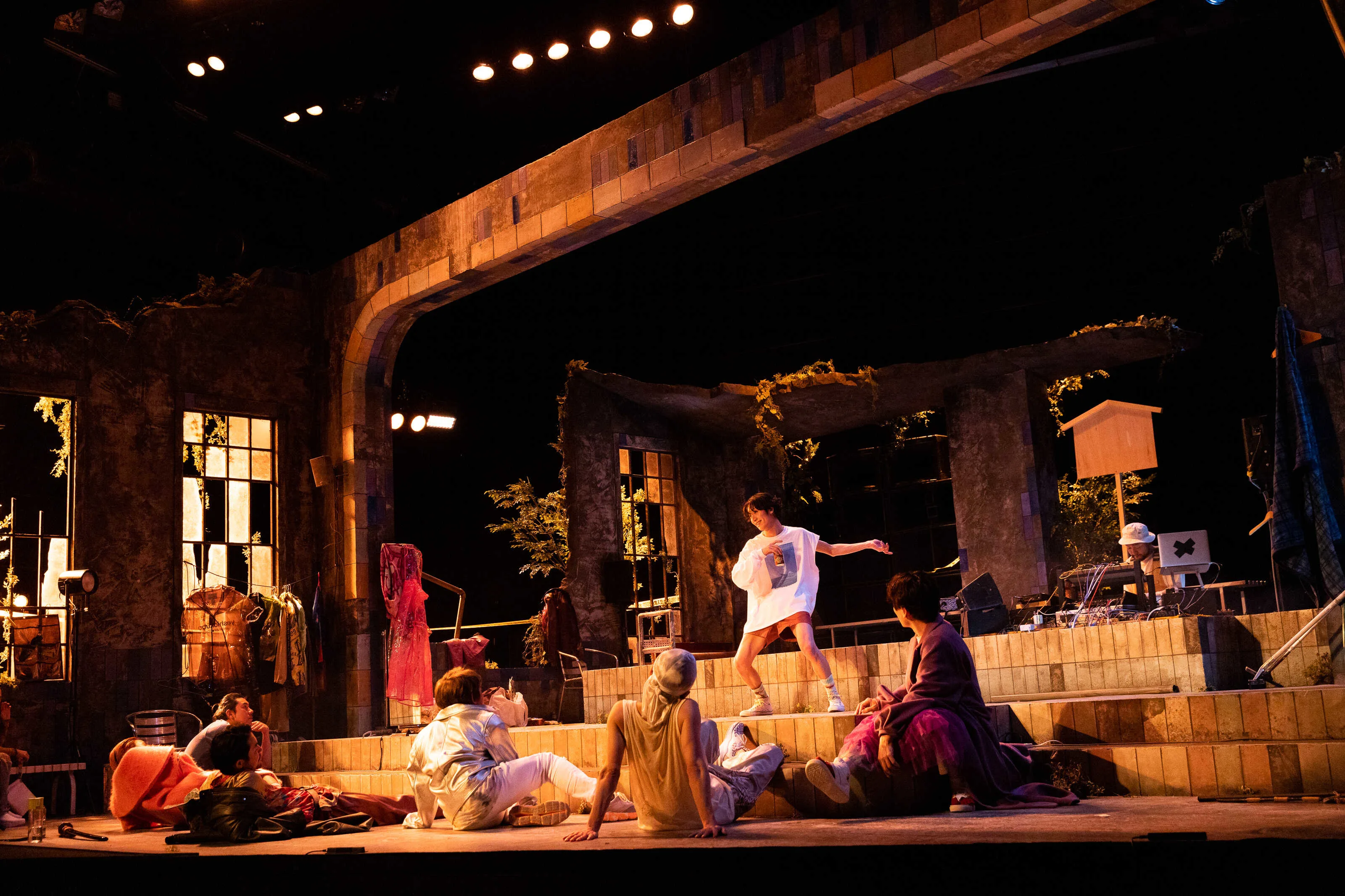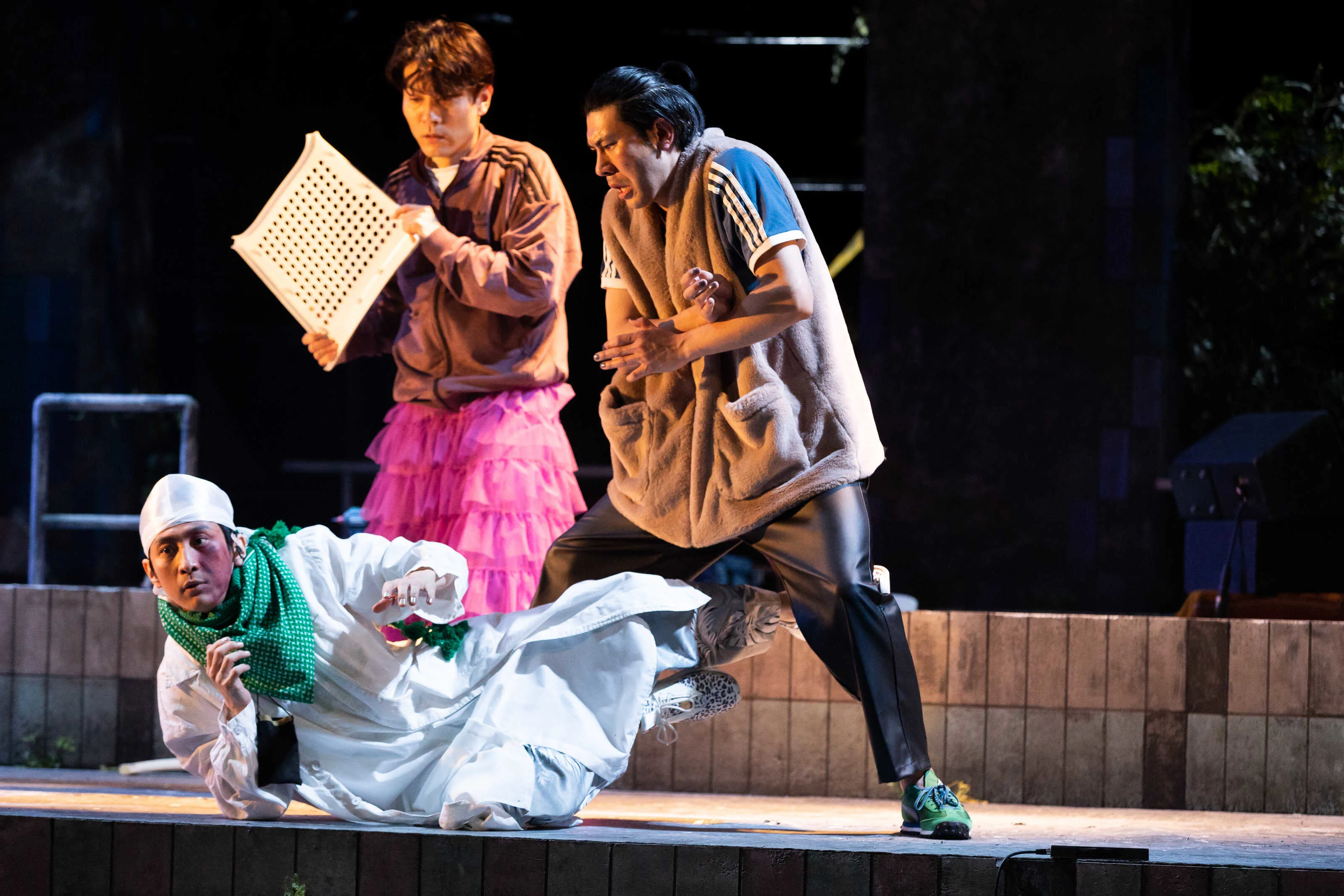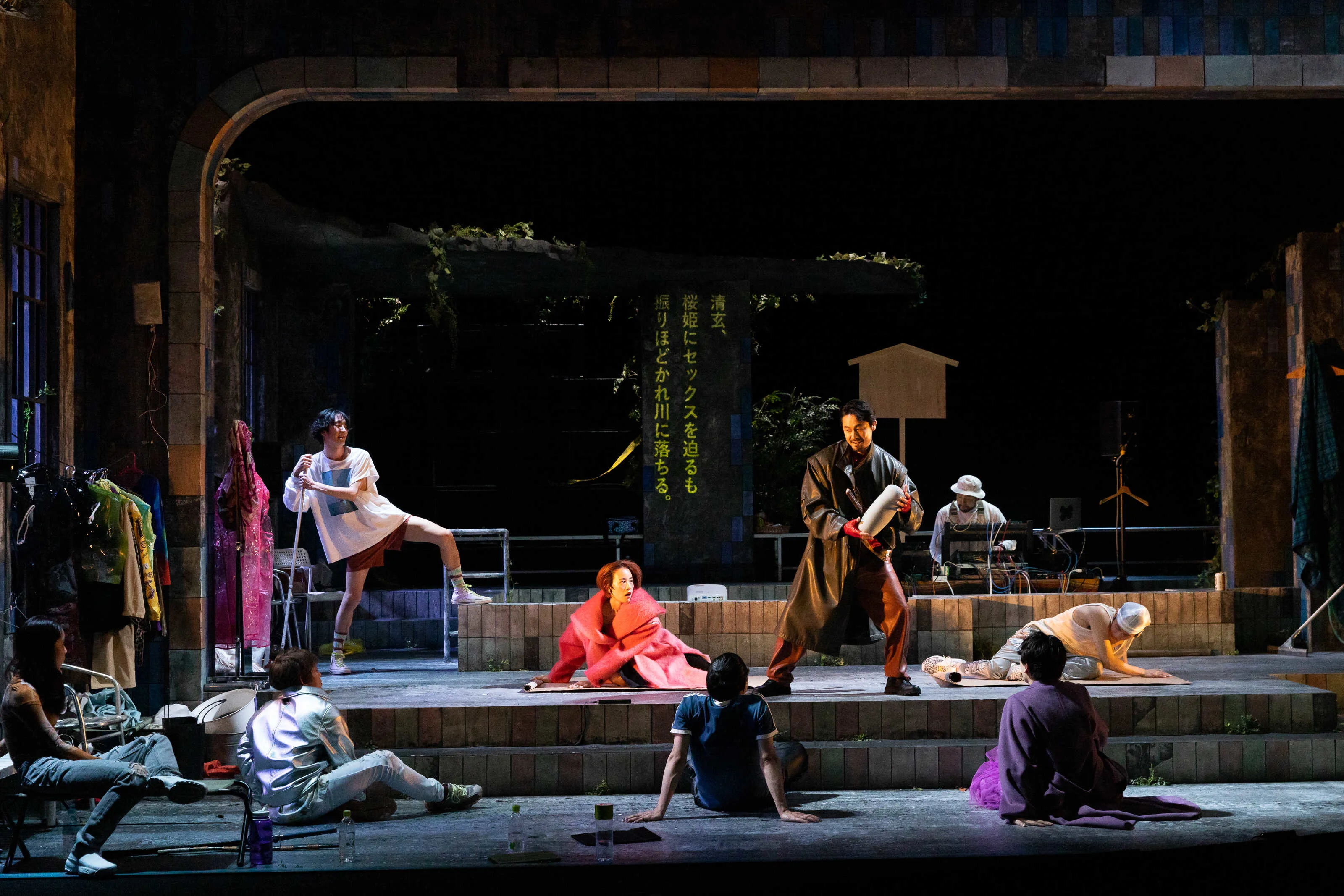 それらのなかでももっとも効果的に機能していると思われたのが、字幕の活用である。基本的に字幕が担うのは、進行する物語の複雑さを整理して観客に届ける役割だが、しばしばこれから起こることを断片的に伝える予言者の声のようにも振る舞う。舞台上に常に投影され続ける字幕をつどつど確認しながら、観客はパフォーマンスを追うことになるが、「清玄、桜姫にセックスを迫るも 振りほどかれ川に落ちる。」といった予告される展開の唐突さや、たしかに示された決着に至りはするものの、そこに至るまでのプロセスの不条理さを際立たせる効果を字幕は発揮して、『桜姫東文章』という古典の物語と現在の観客のあいだに広がる埋めがたい距離を印象づける。