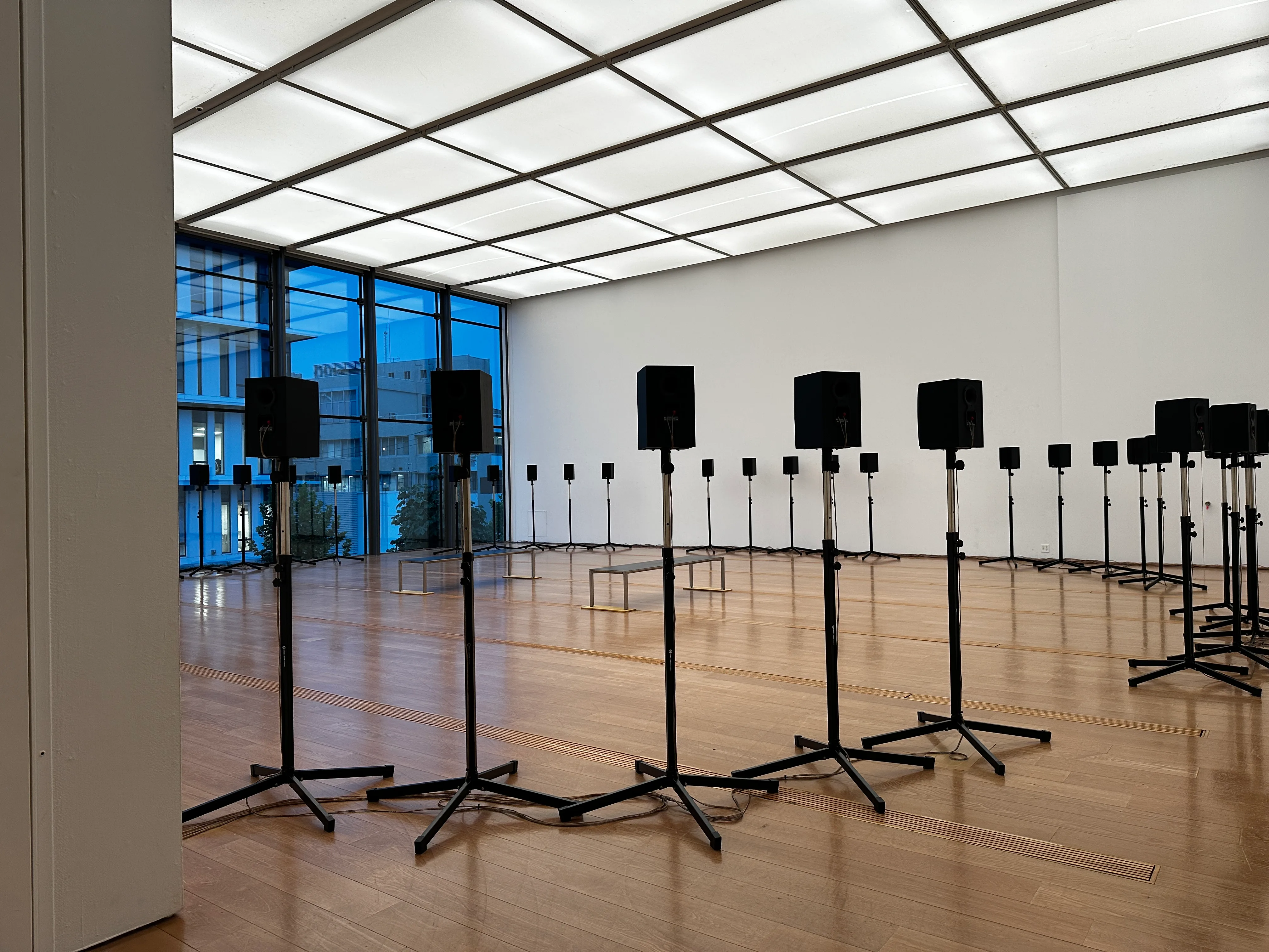 円形に置かれた40台のスピーカーから、合唱団の歌声が別々に聞こえてきます。展示の中心では、ソプラノ、アルトなど合唱のハーモニーを十分に楽しむことができるし、スピーカーの周りをぐるぐると歩けば、様々な音階の歌声をじっくり発見することもできました。美術館で目を閉じて、耳の感覚だけに任せて、その場の空間を楽しめたのがよかったです。