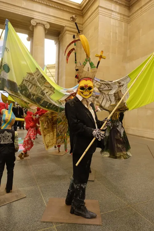 たとえば、先にふれたヒュー・ロックは《アルビオン》(Albion、2007)や《大使》(Ambassador、2021、挿図15)において、英国の国章や馬にまたがり行進する大使、植民者英国の権威の象徴を作品にしている。国章は段ボール、造花、リボン、廃材金属片など廉価な材料でゴテゴテに飾りたてられ、彼の出身であるガイアナから見える色褪せた旧植民者の残骸であるとともに、カーニヴァルのデザインを思わせる大衆的な祭りの表現が重なり、その渾然とした様が不思議な快感をもたらす。