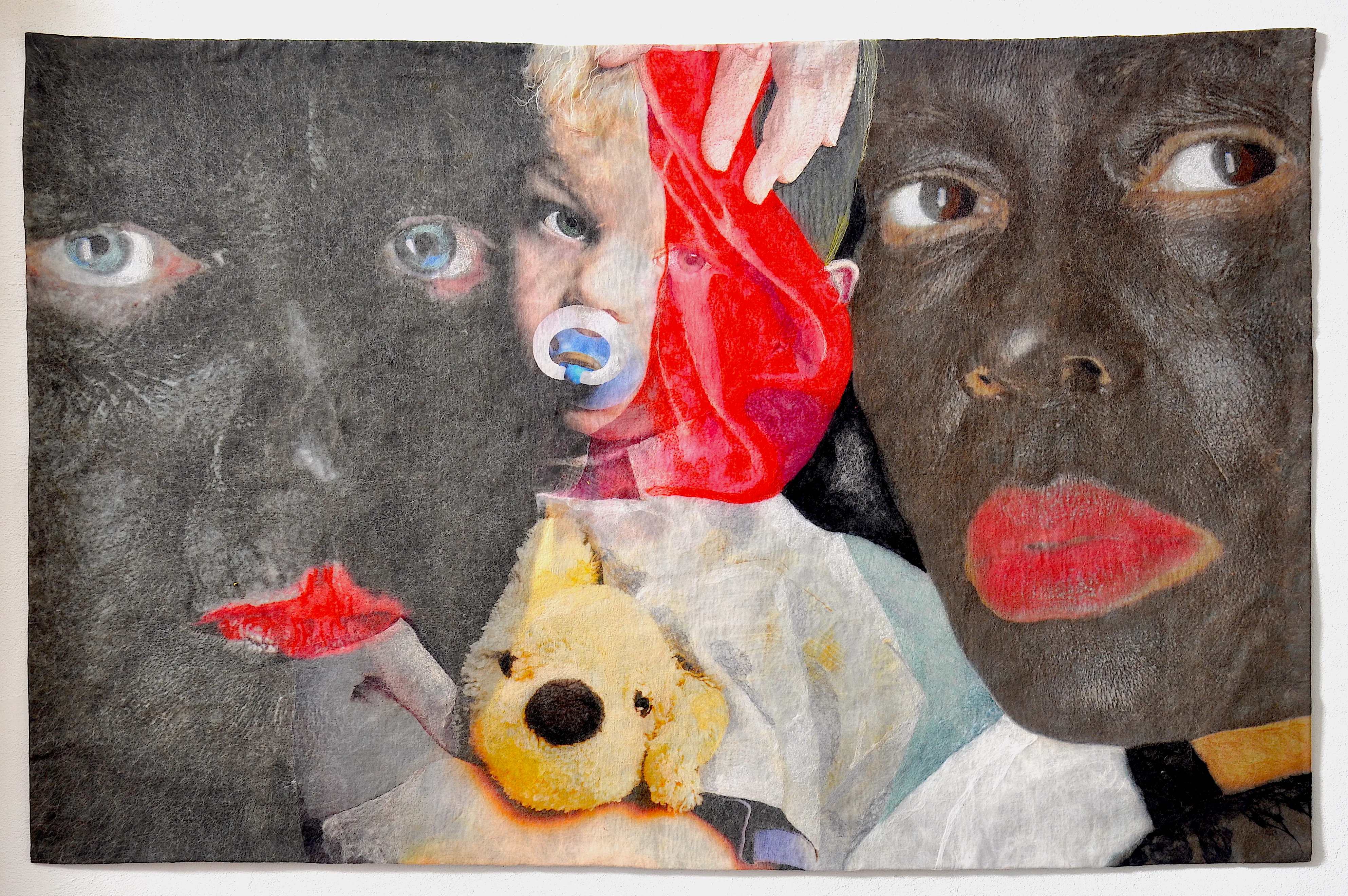 極められたフェルティングの技法による絵画的な表現と、ソフトで身体感覚を伝えやすいフェルトだからこそできる、素材に固有な工芸的表現が重なりあっている。